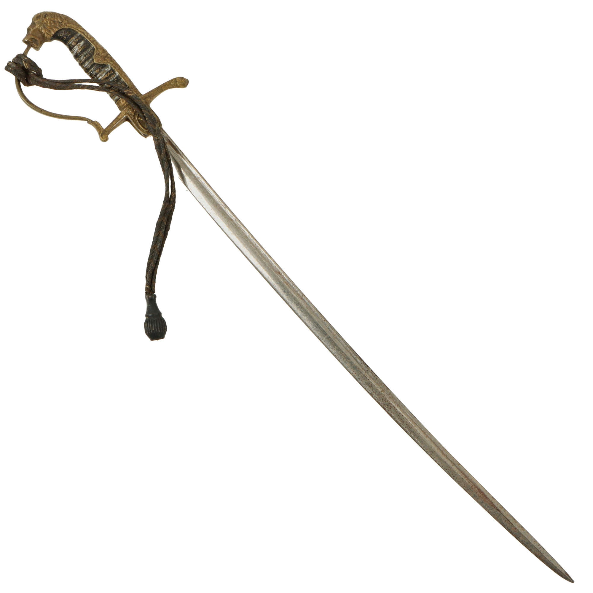 - One German WWI-WWII miniature lion head artillery officer sword with troddel knot. Measures just over 9" in length.