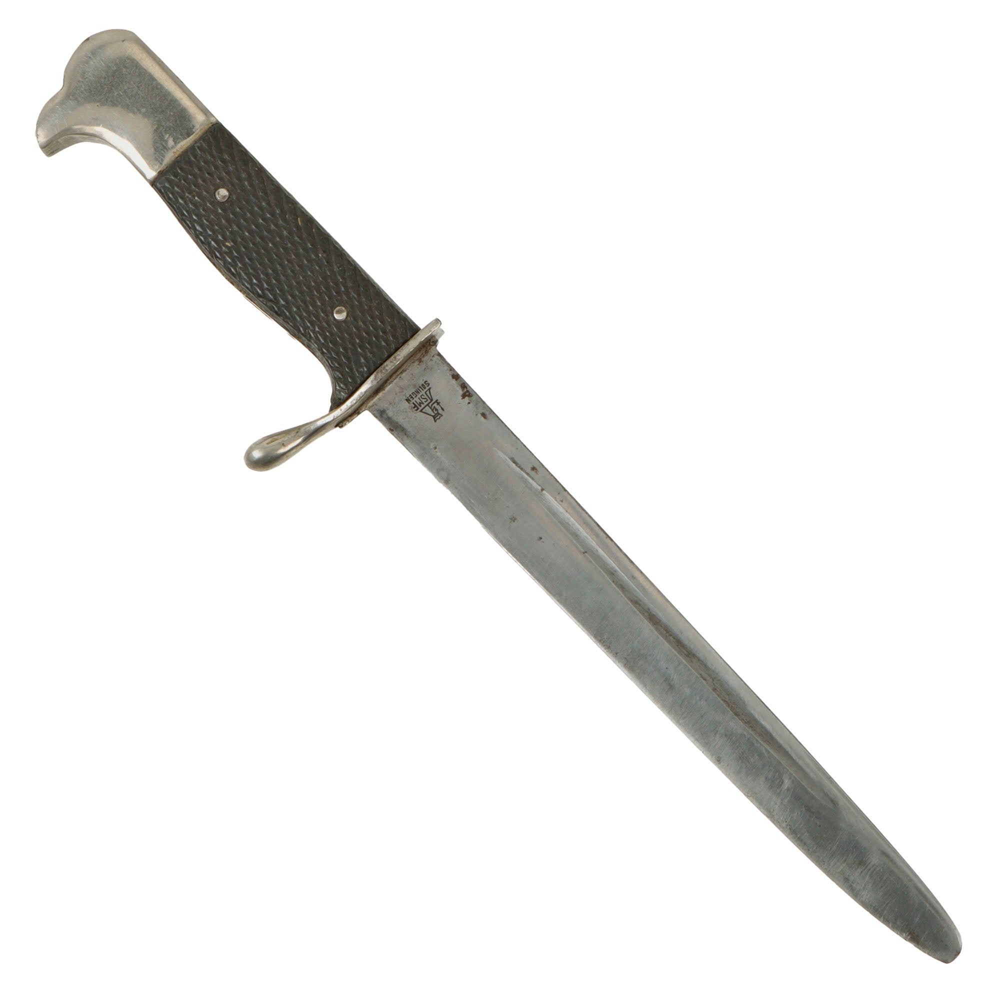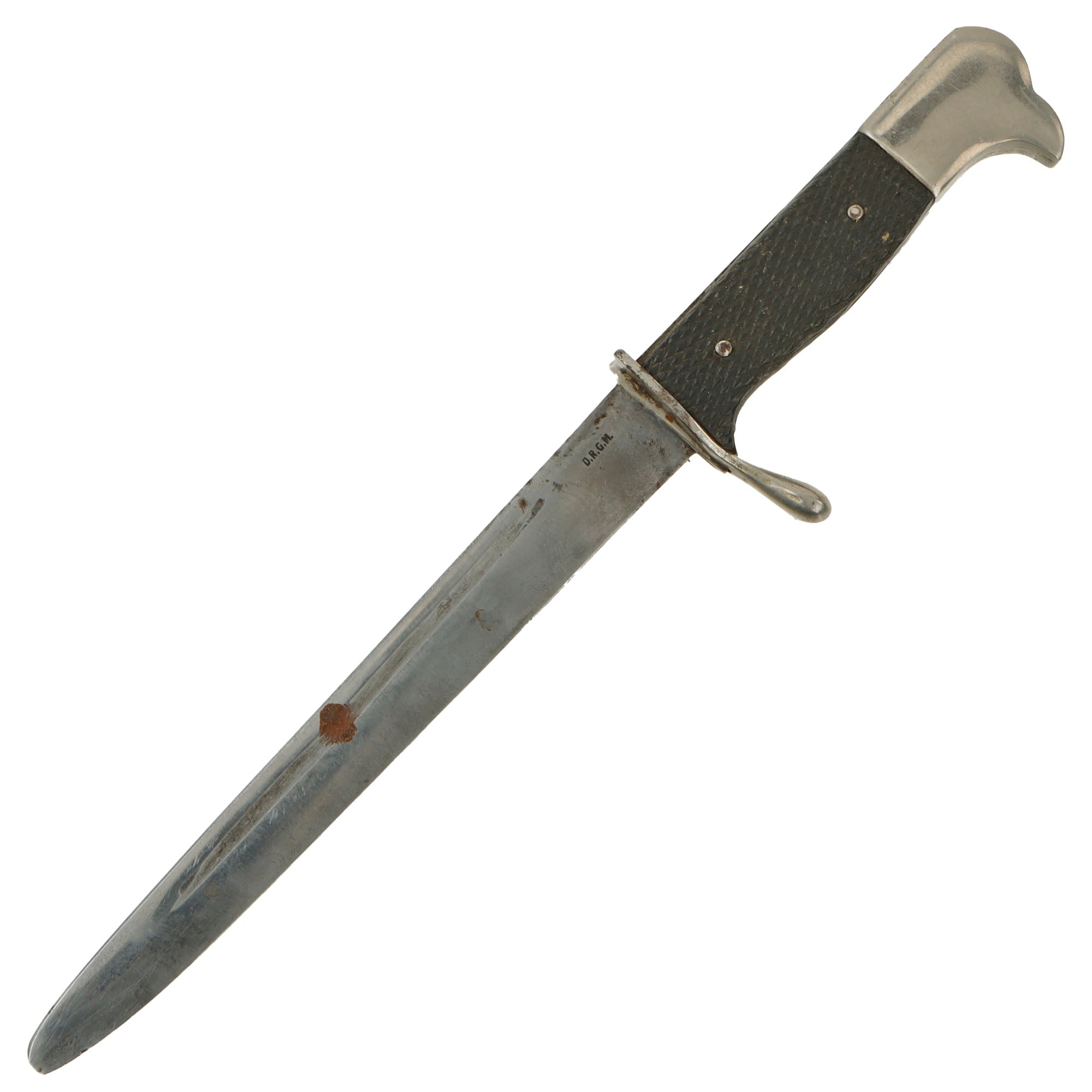 - One German WWII Miniature 98k dress bayonet letter opener marked D.R.G.M. on one side, and maker marked by SMF with their "Seated King" logo. Measures 8 5/8" in length.