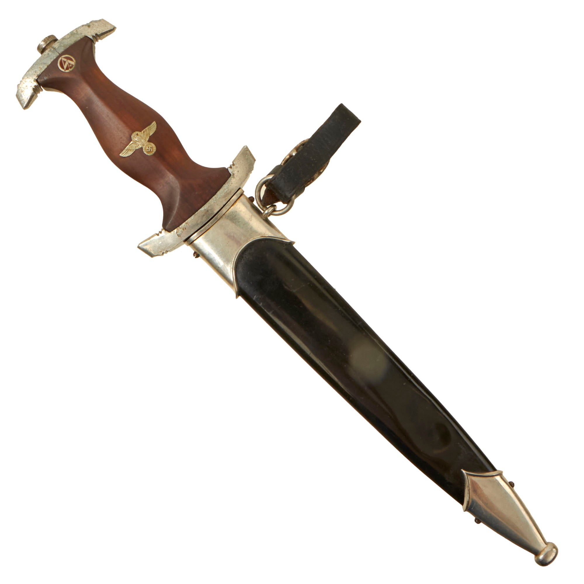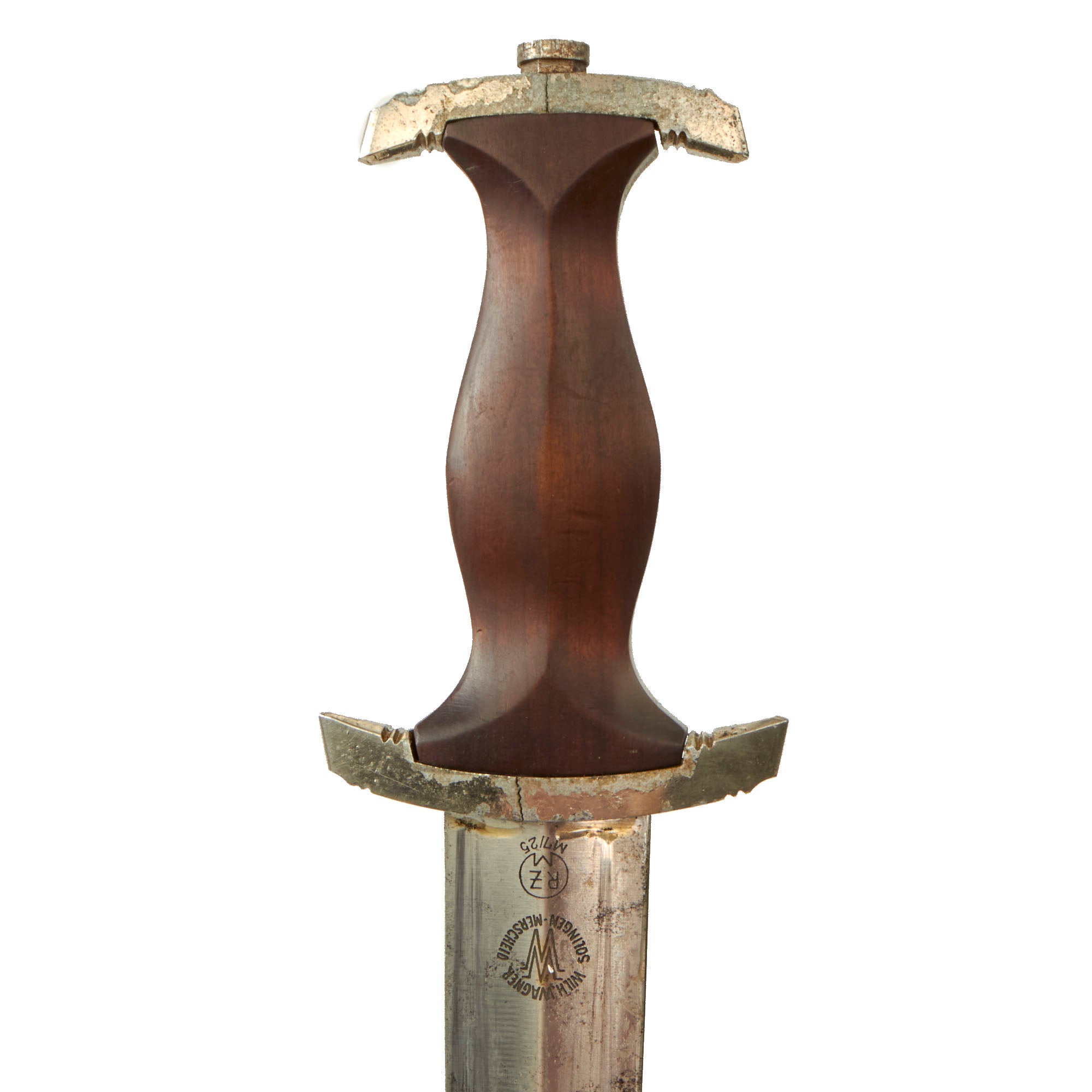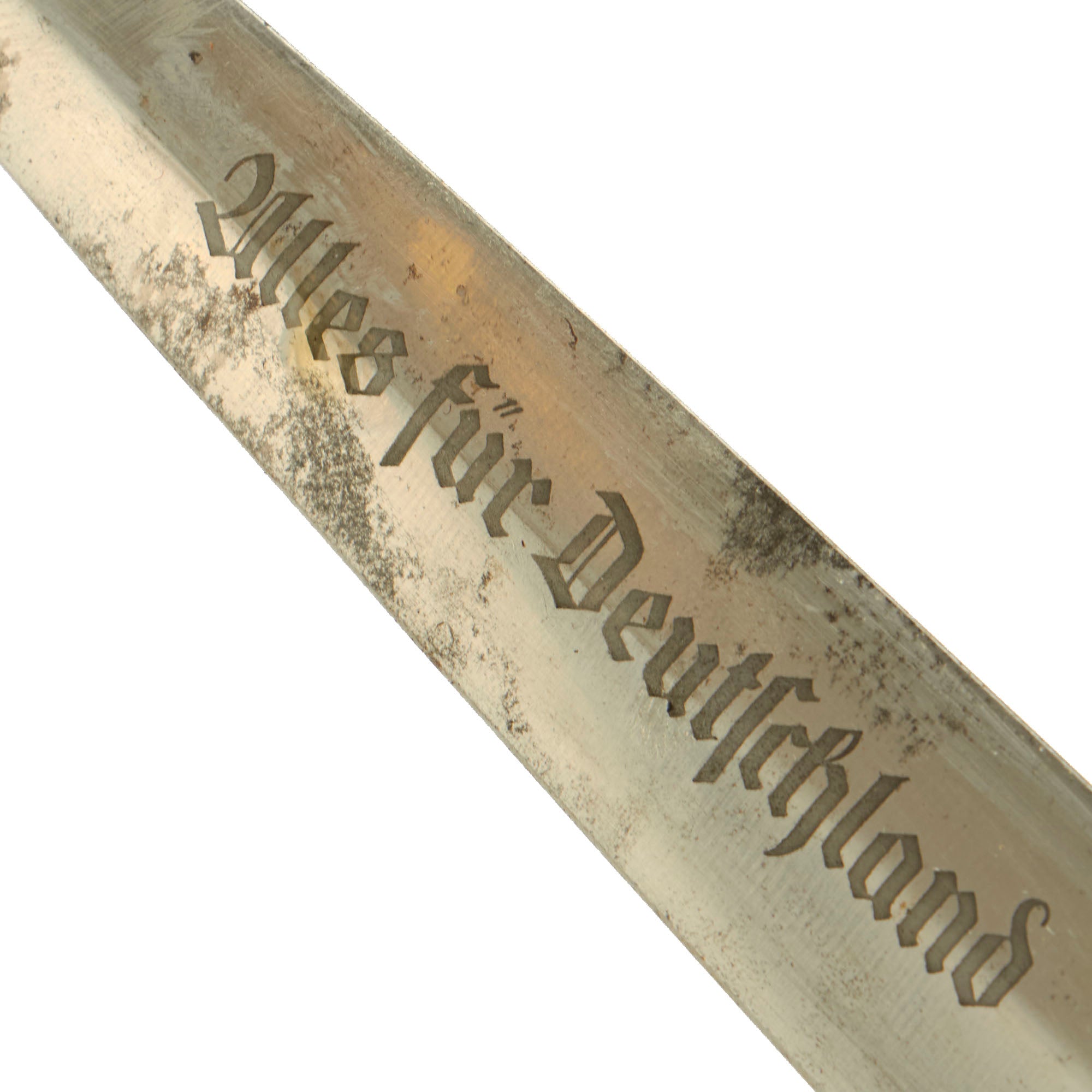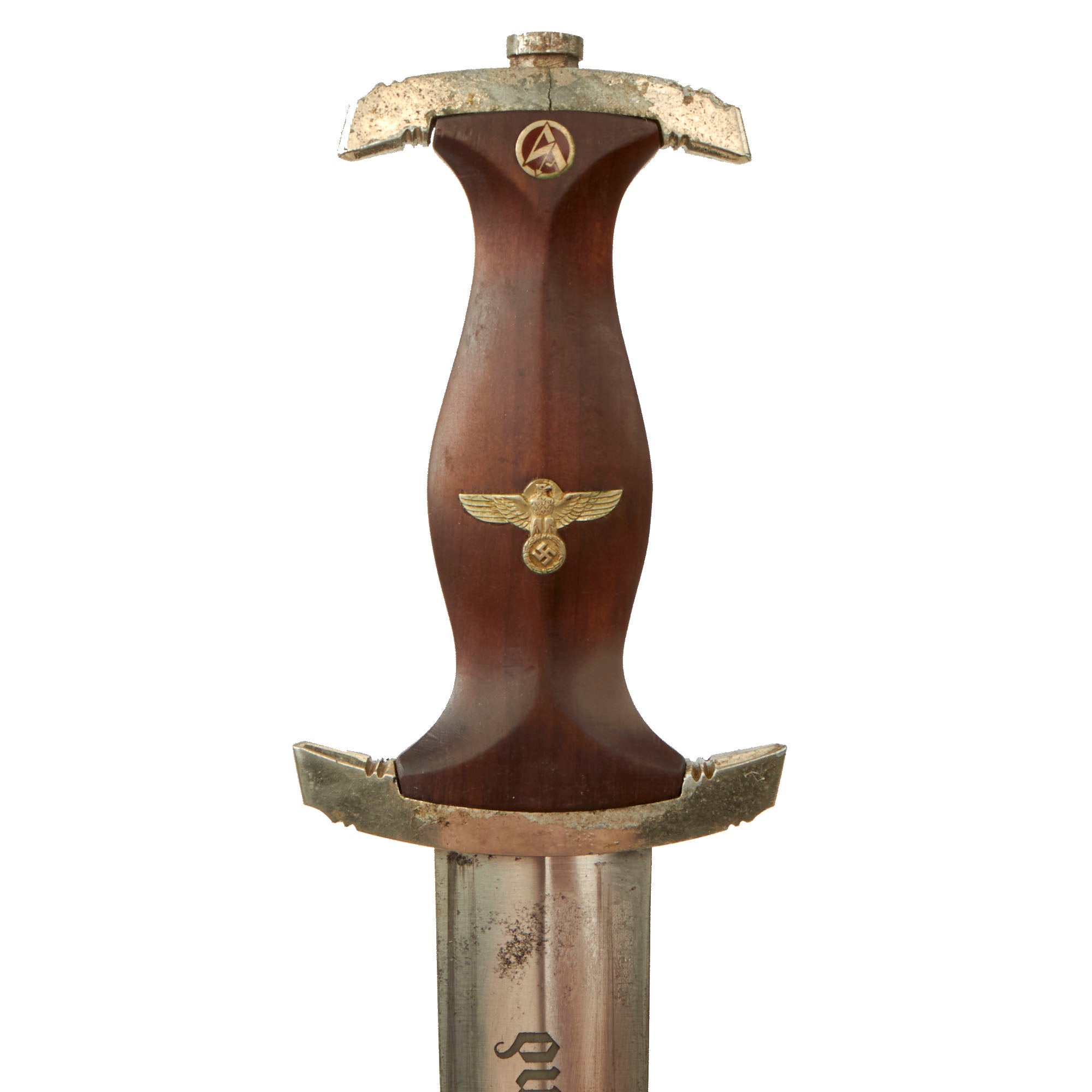 The blade was etched with the SA motto, Alles für Deutschland. Examples produced prior to 1935 were stamped with the German sector of the SA group on reverse lower crossguard. Later examples underwent standardization through the RZM ministry. These pieces were produced of cheaper plated zinc-base fittings and scabbards were simply painted brown.