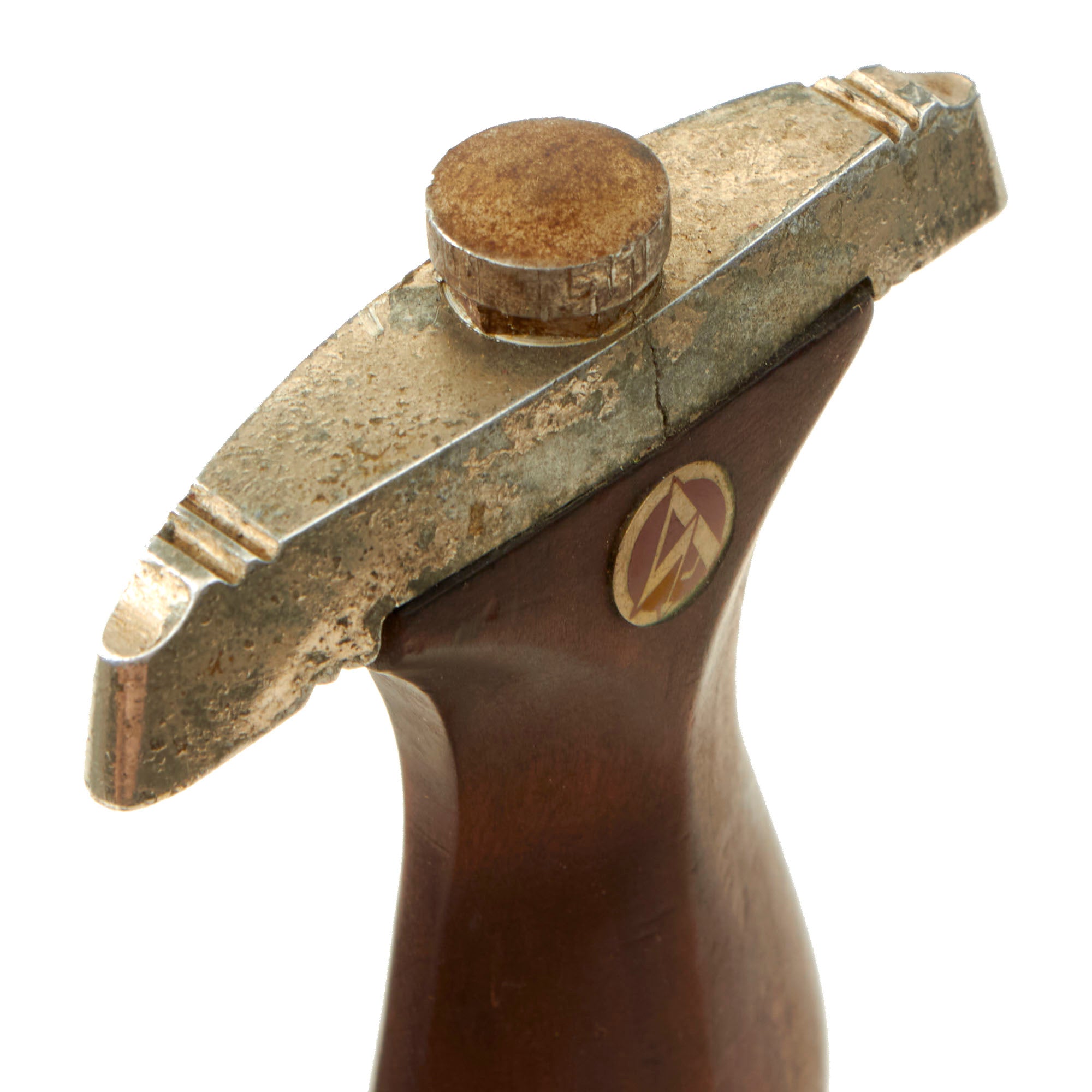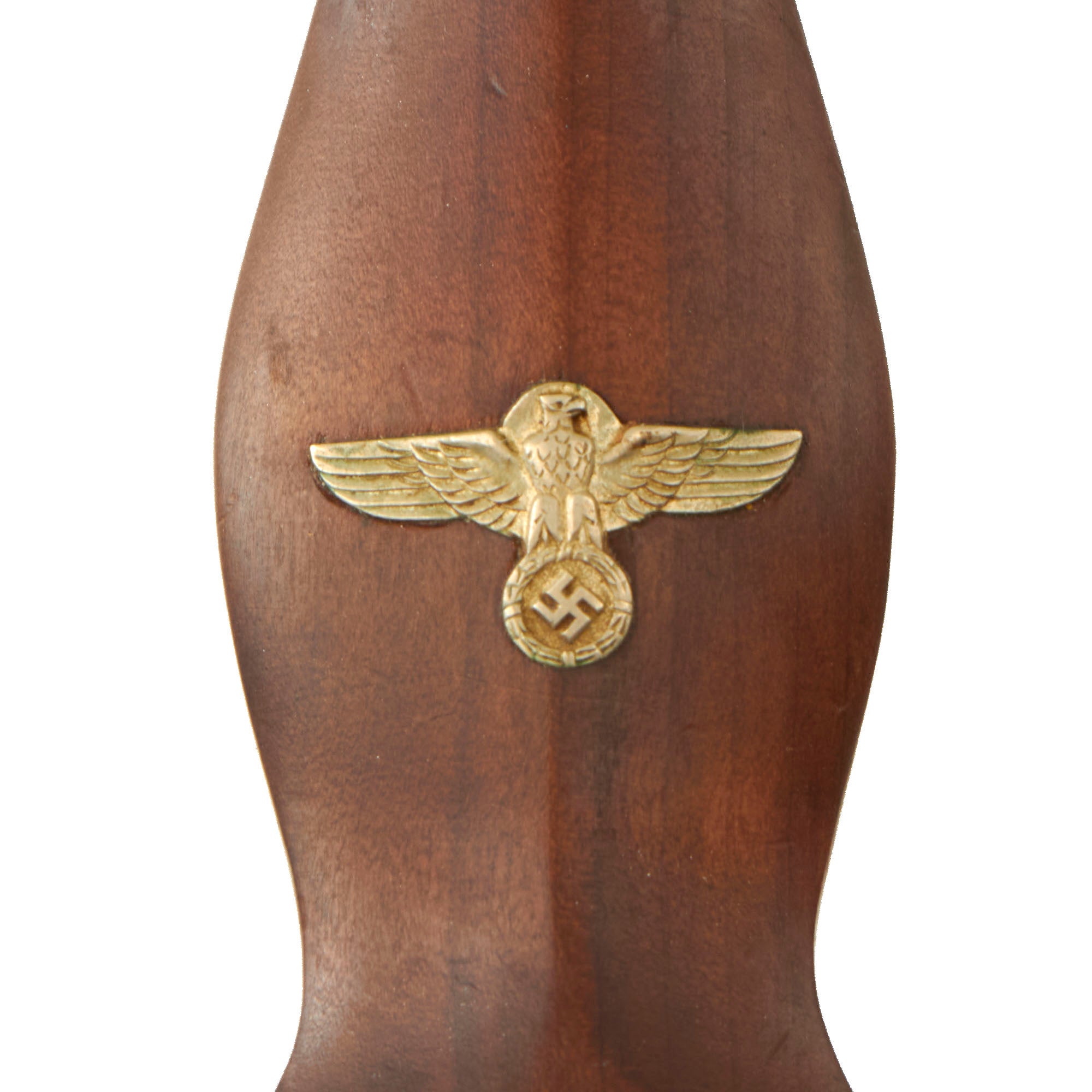 The grip is a fine product having a fine dark reddish colored mahogany tone in the surfaces and medium center ridge construction. This grip is in excellent condition with great grain, and fits the crossguards well. There is no cracking in the wood that we can see, just some pressure denting and a few small stains, with no chipping we can see. The SA / NSKK button itself is nicely set having fully intact enamel, and the plating intact with some verdigris and oxidation as shown. The details are still there to the inlaid nickel eagle, including the beak, breast feathering, wing feathering, talons, wreath and mobile swas.