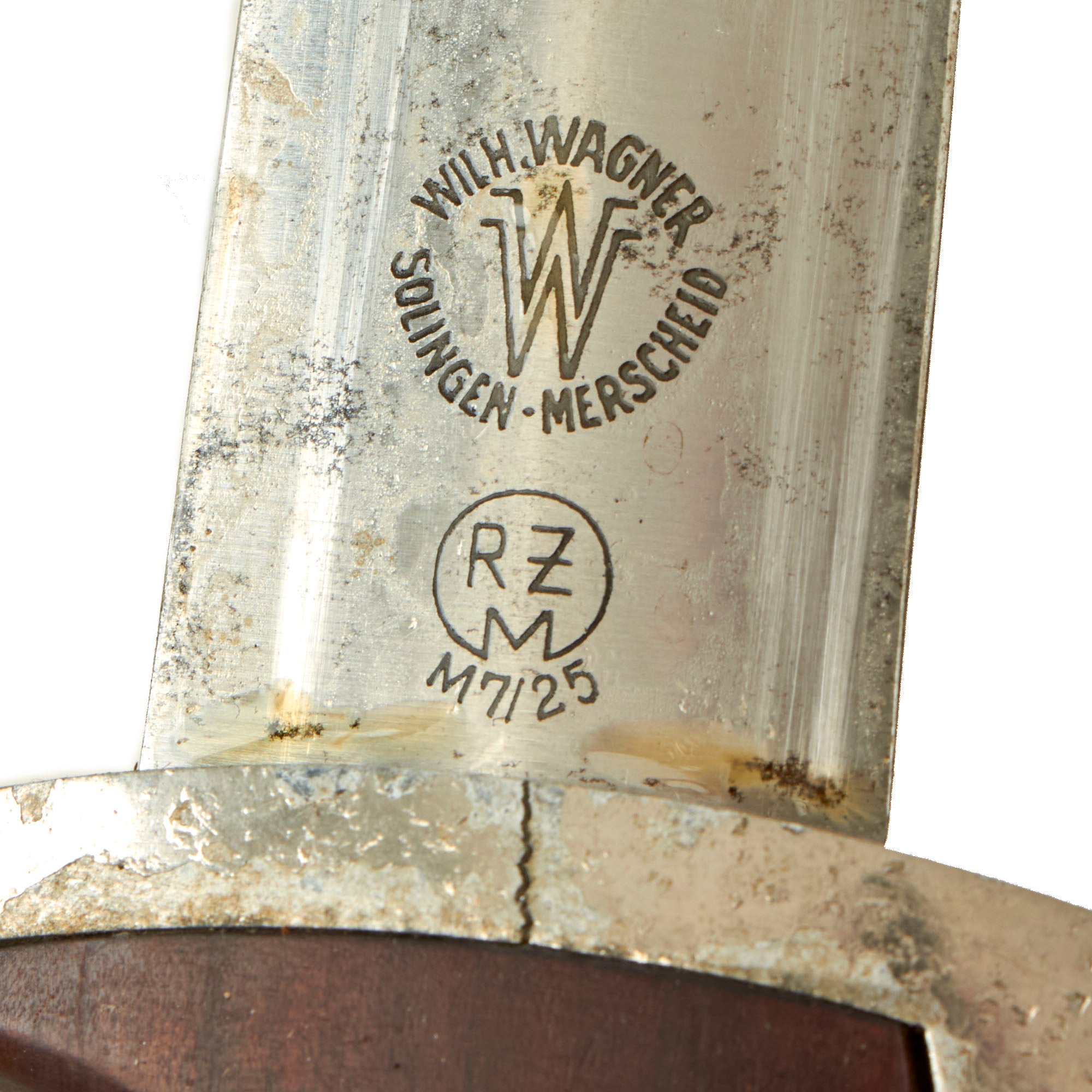 • Original Item: Only One Available. This very good condition mid war period produced NSKK Dienstdolch (Service Dagger) has nickel-plated fittings throughout, and is fitted with a very nice blade. This example was made by the the rare Solingen-based firm of Wilhelm Wagner, Stahlwarenfabrik, located in the Merscheid District. We have only previously had one other item by this maker.