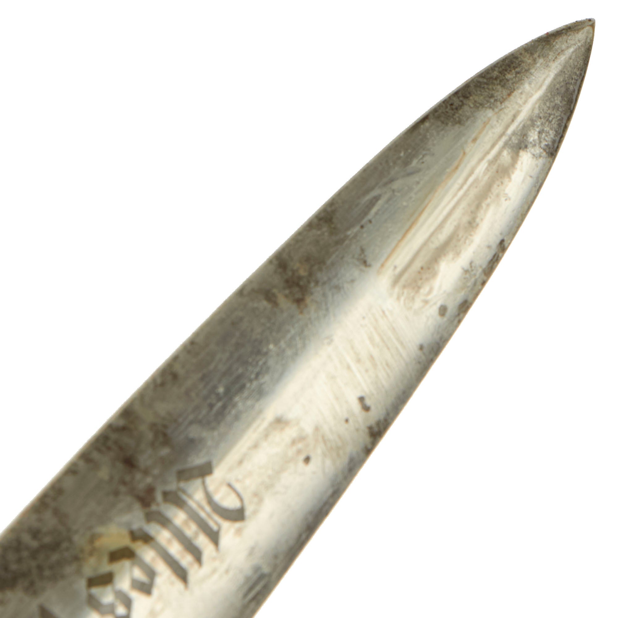 Prior to his "unmasking" as a traitor, Ernst Röhm was the leader of the SA. In 1934, he distributed approximately 100,000 SA daggers with his personal inscription on the reverse blade. These daggers were to honor individuals who had served with the SA prior to December, 1931. Other than the inscription, these pieces were identical to the standard M1933 SA dagger. After the Röhm purge, the inscription was ordered to be removed. Many examples were returned to the factory for grinding. Others were simply ground in the field by whatever means were available. Examples will occasionally be encountered with remnants of the original inscription remaining on the blade, but mostly none will remain. Some blades exist with an intact inscription, reflecting only the removal of the Röhm signature. Very very rarely is an example seen with a full, untouched inscription, as the holder would have surely risked a charge of treason.