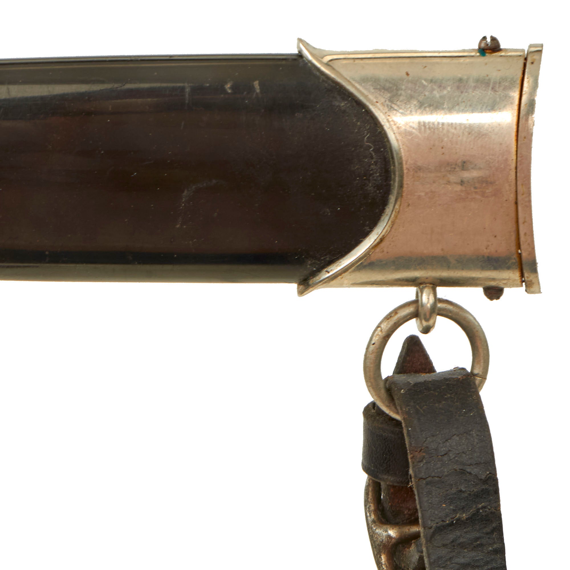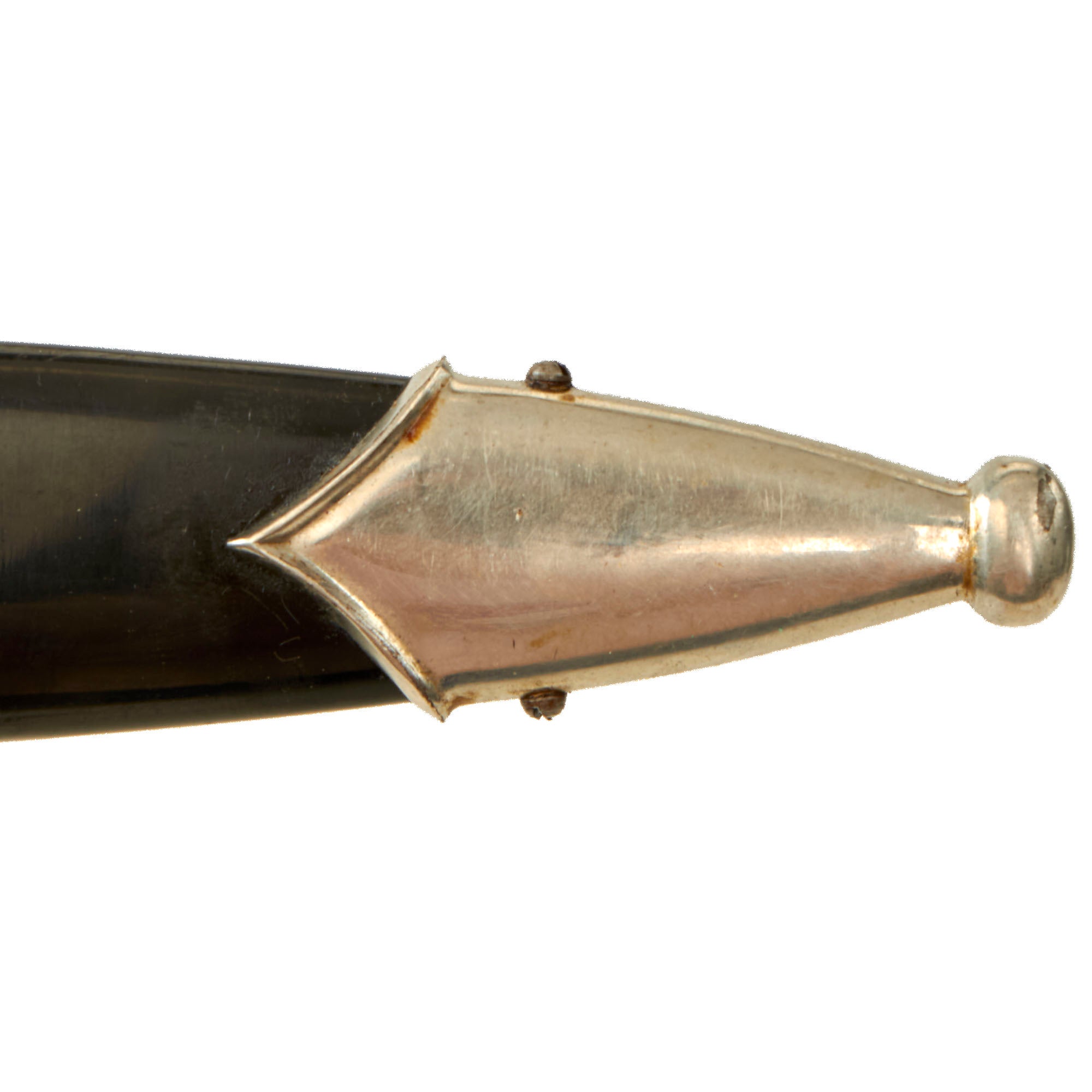 The scabbard the mid-war style, which has a black enamel lacquered steel body fitted with nickel plated steel. The shell does have a bit if a bend, caused by some dents on the obverse, which are sizable but do not interfere with sheathing the blade. The original enamel is still retained at over 95%, showing crazing and checking in the finish, indicating that it has not been repainted at any time. The upper and lower fittings look great with just a bit of wear, and no denting to the lower ball, though there is some plating loss. The throat nicely matches the crossguards, and all fittings have their original dome headed screws, which show some oxidation.