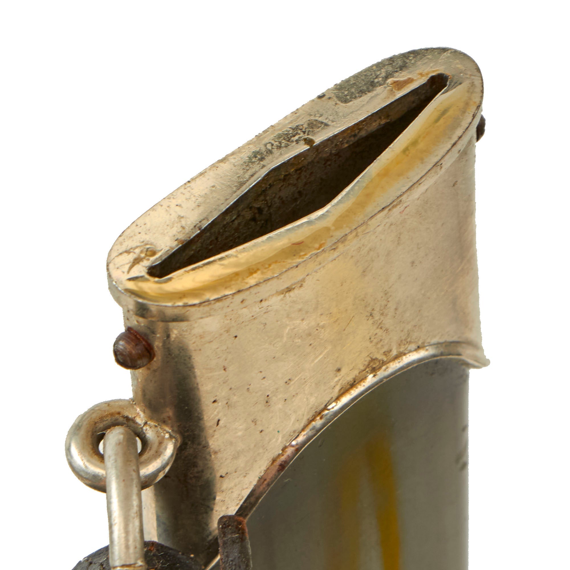 The blade of this example is in very good condition and has the factory final polish grind crossgrain easily visible throughout the blade. This texture is iconic, and is the definitive identifying characteristic for a real WWII German Blade. There are however areas of oxidation staining, which have been left intact to avoid marring the blade. There is also the usual runner wear and swirl marks from cleaning. The original factory edge is intact, with no signs of post-manufacture sharpening, and the blade tip is unbent. The acid-etched Alles für Deutschland (Everything for Germany) SA motto is deep and crisp, with a fine frosted background that is retained almost completely.