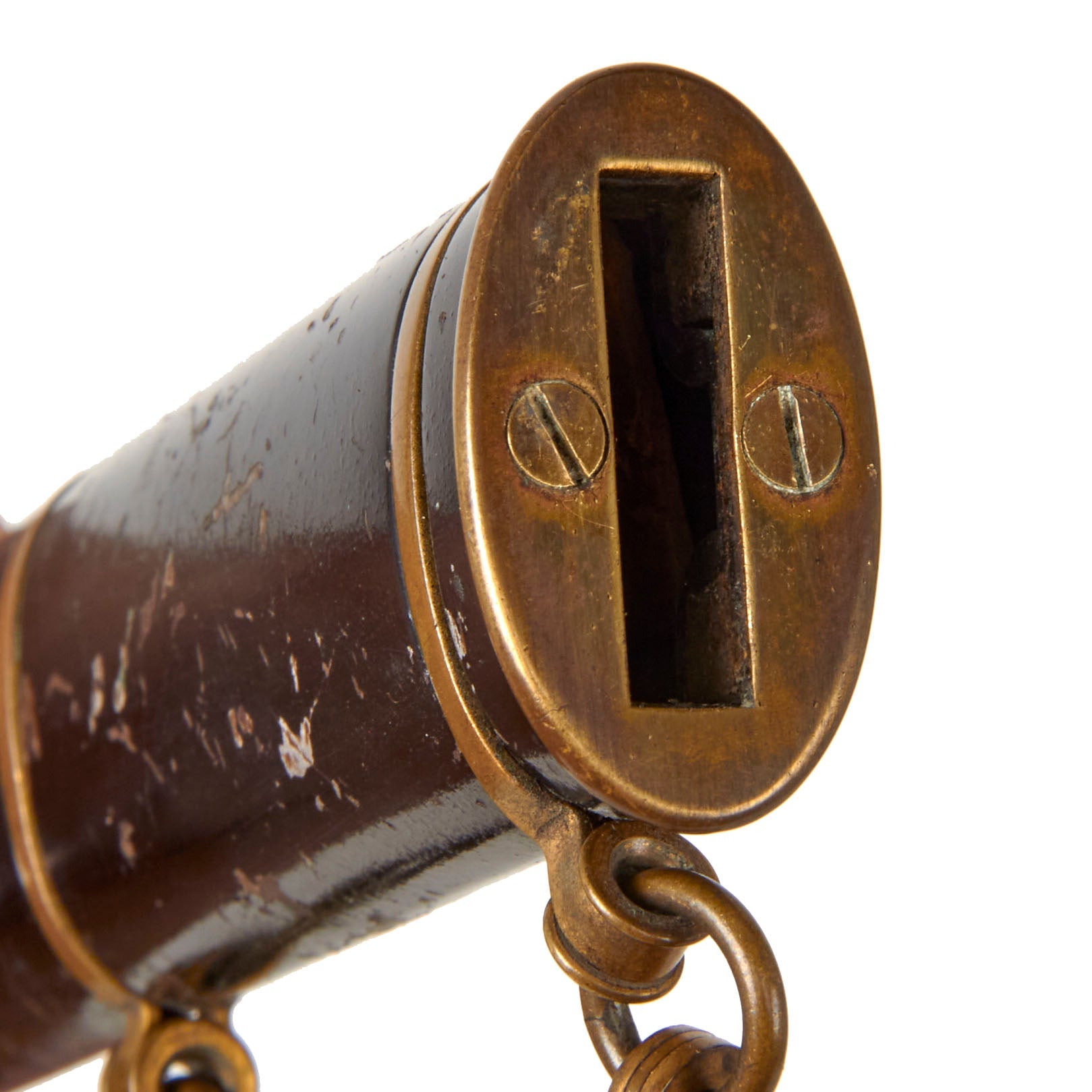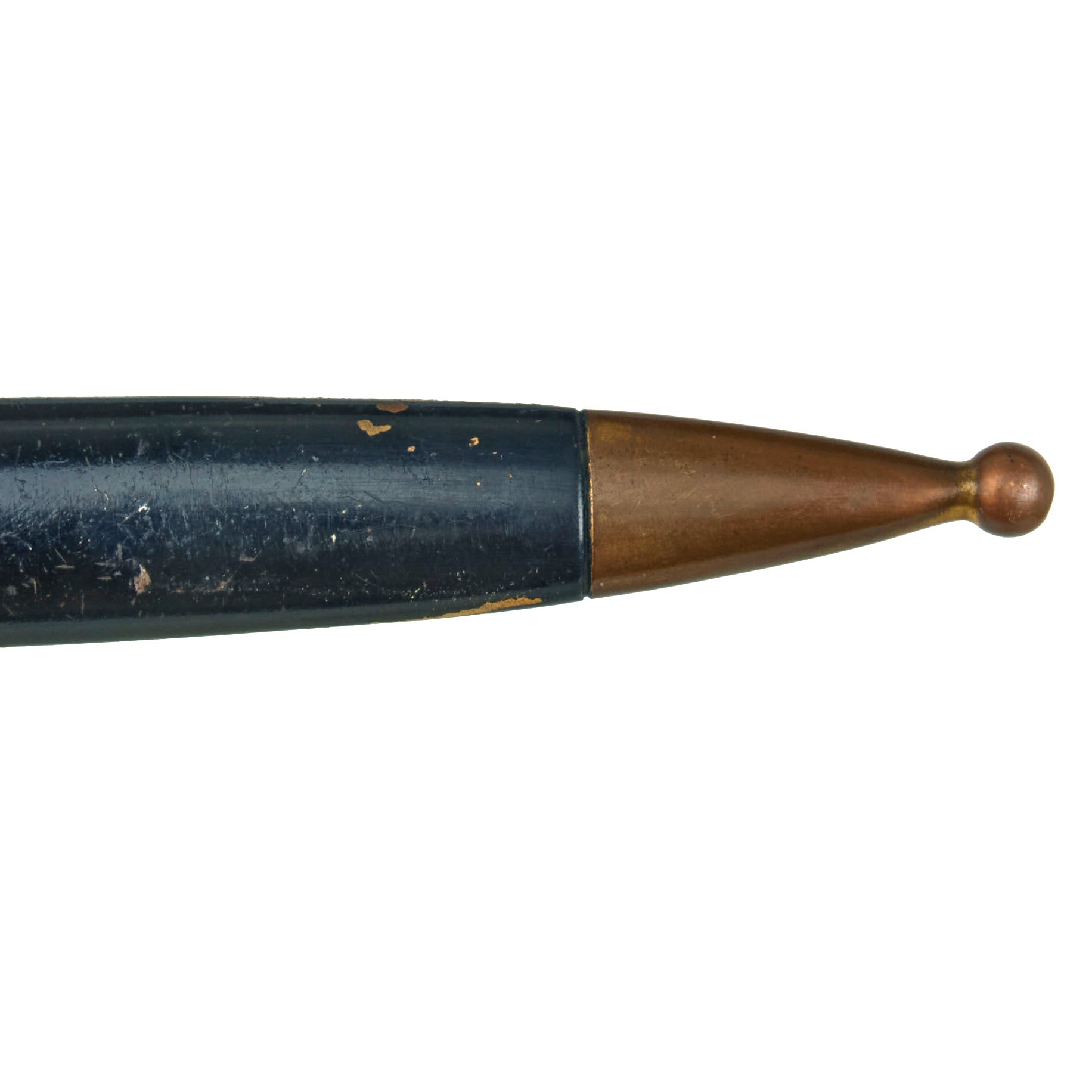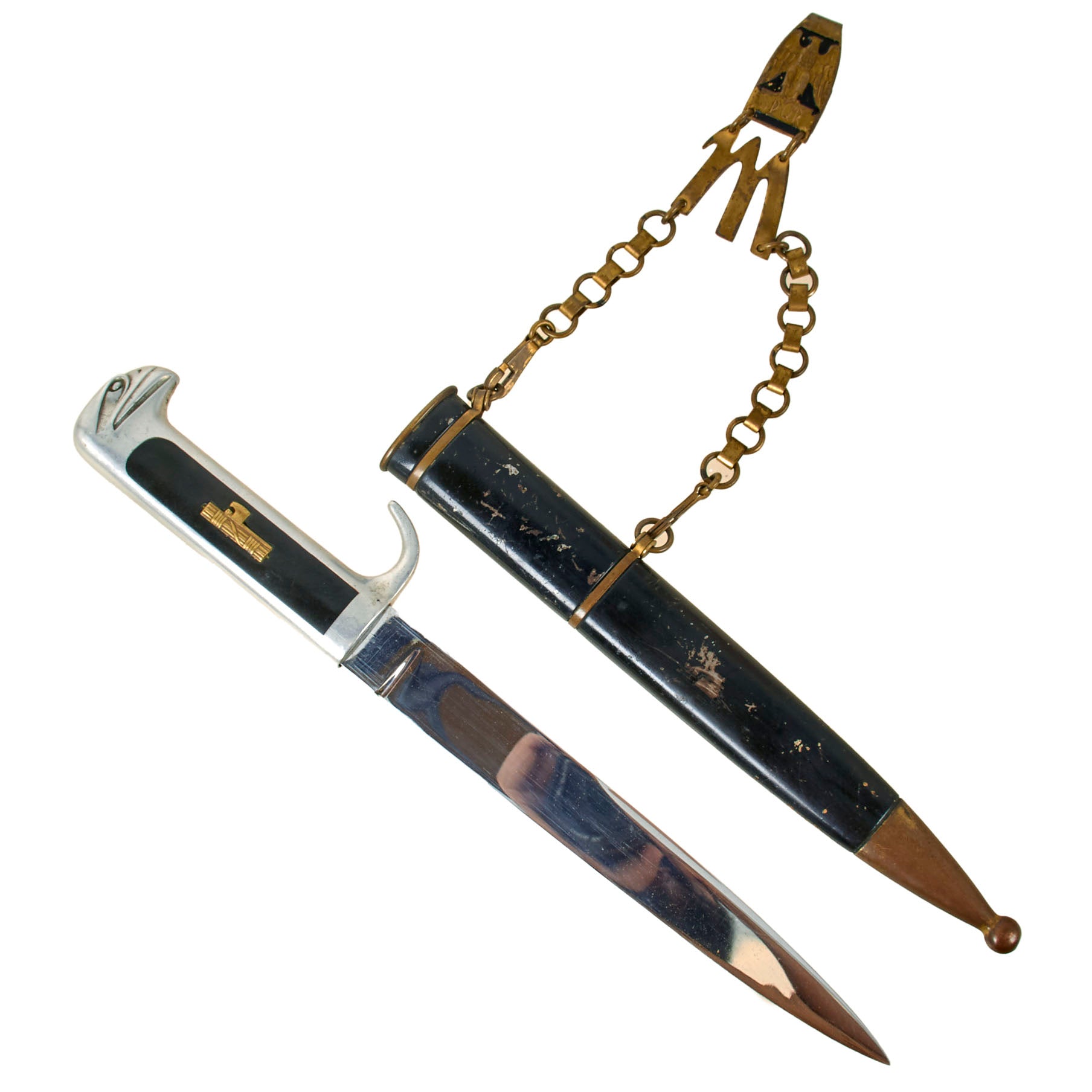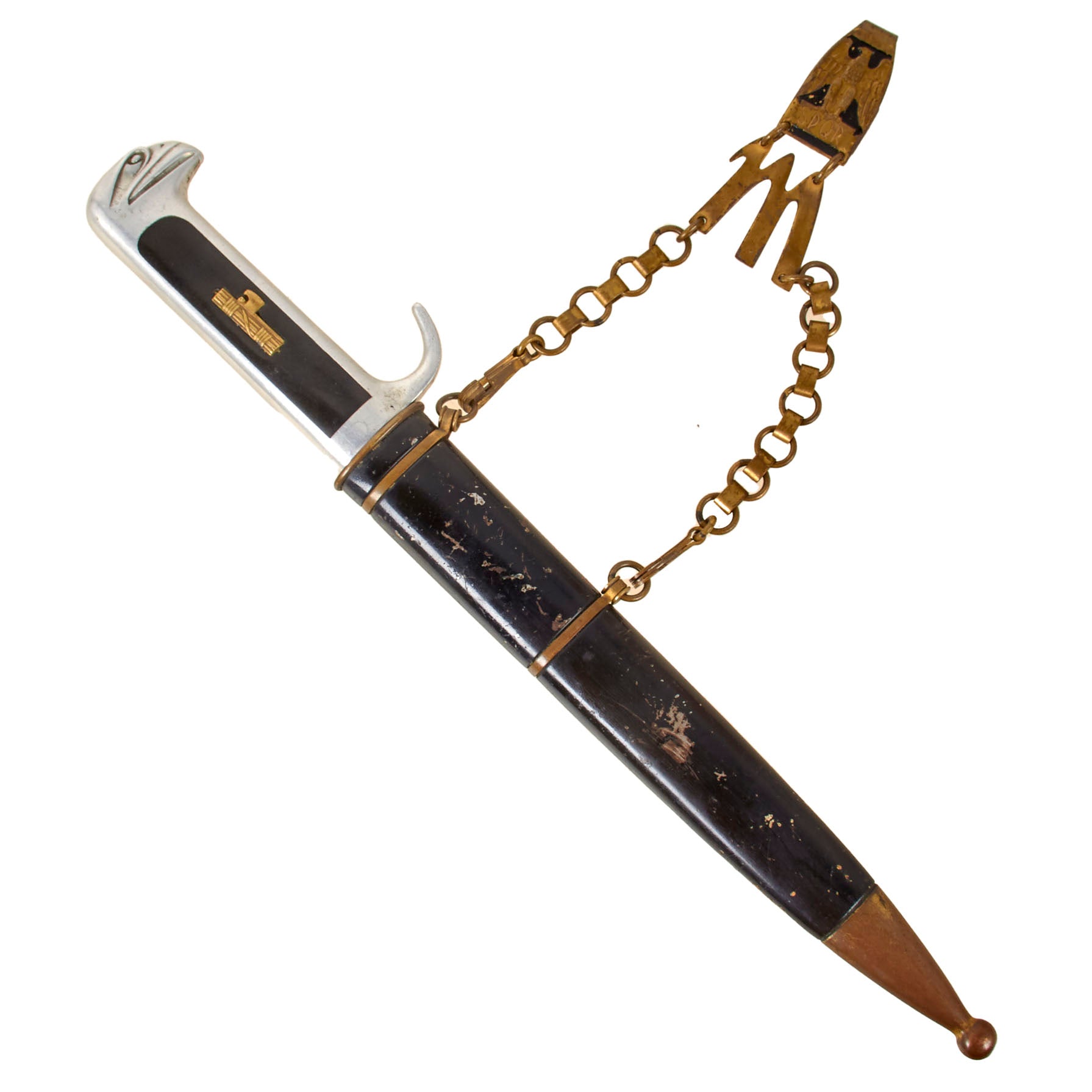 The dagger comes complete with its brass-fitted black painted metal scabbard, complete with an attached chain link belt hanger. The brass fittings are gilt, which is somewhat faced, and the black enamel paint is still almost completely intact, with just a bit of wear.