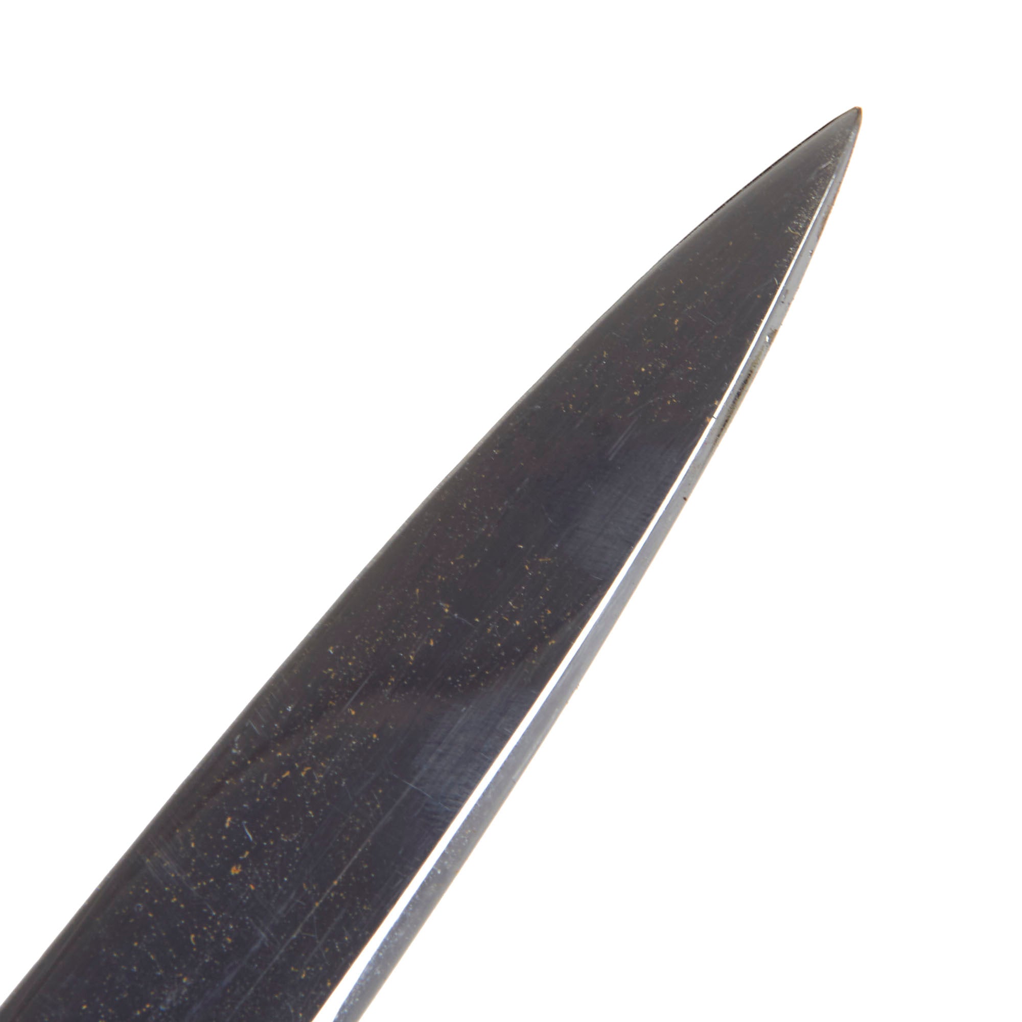 This type of MVSN dagger was a mostly ceremonial item, worn by members of the Blackshirts as a symbol of authority, much as the SA in Germany did. The dagger measures 11 7/8 inches overall, with a 7 1/2 inch nickel-plated blade. The blade does have a sharp edge on the bottom, so it definitely could be used, but they rarely were, as "Pugio" daggers were much more up to the task. The blade exhibits light wear and minor pitting on the ricasso, in addition to some light specks of oxidation. There is very little runner wear from the scabbard, and all of the wear seems to be from storage.