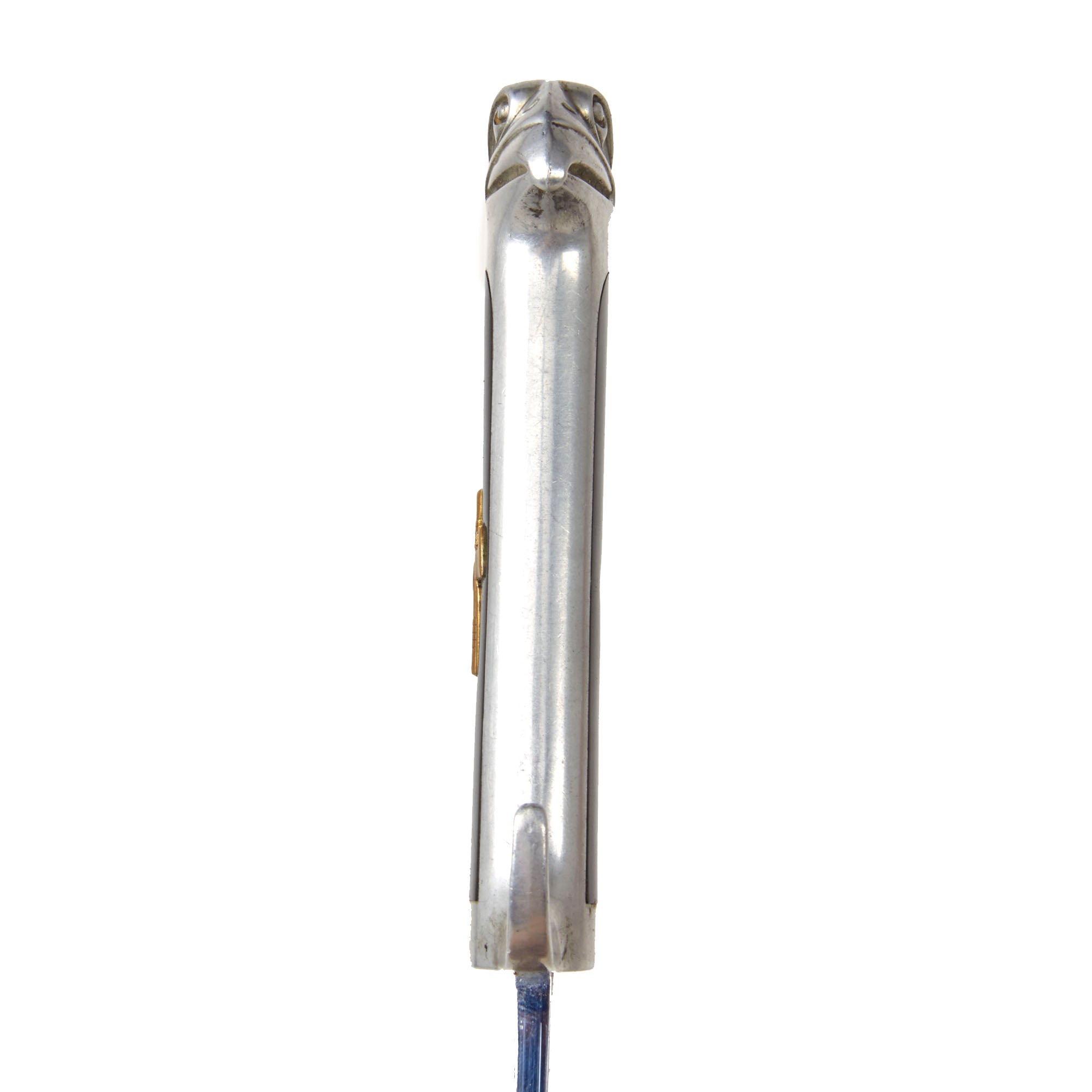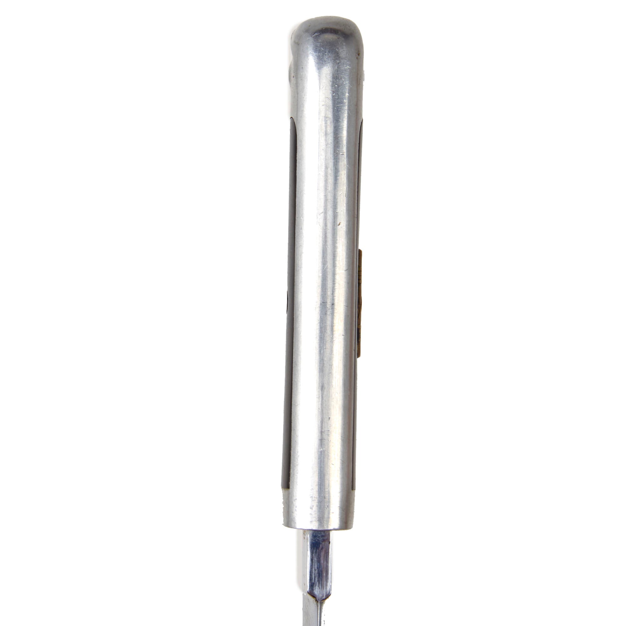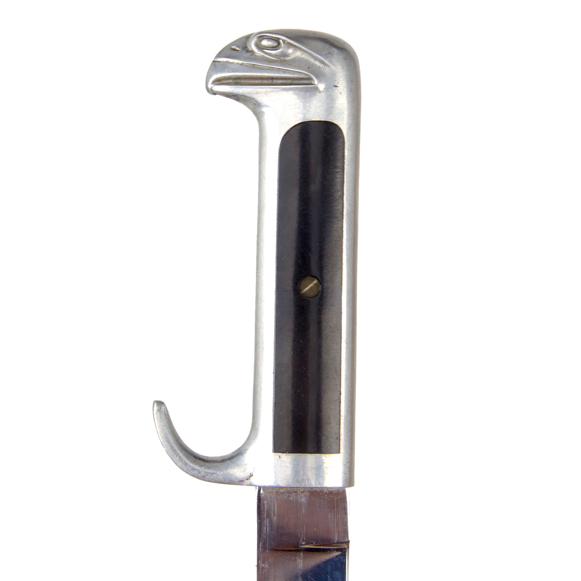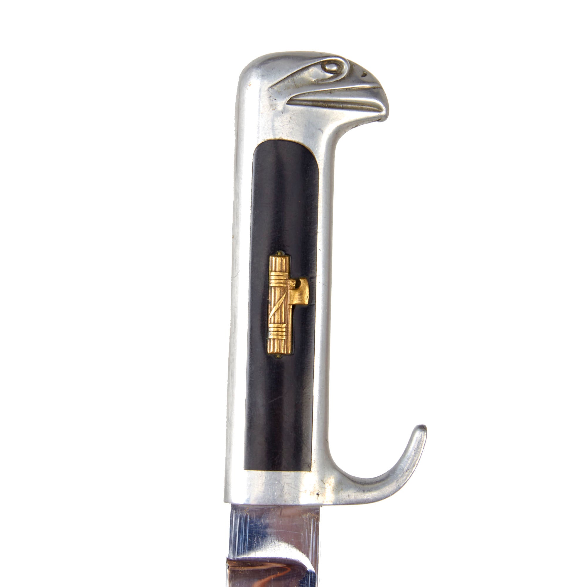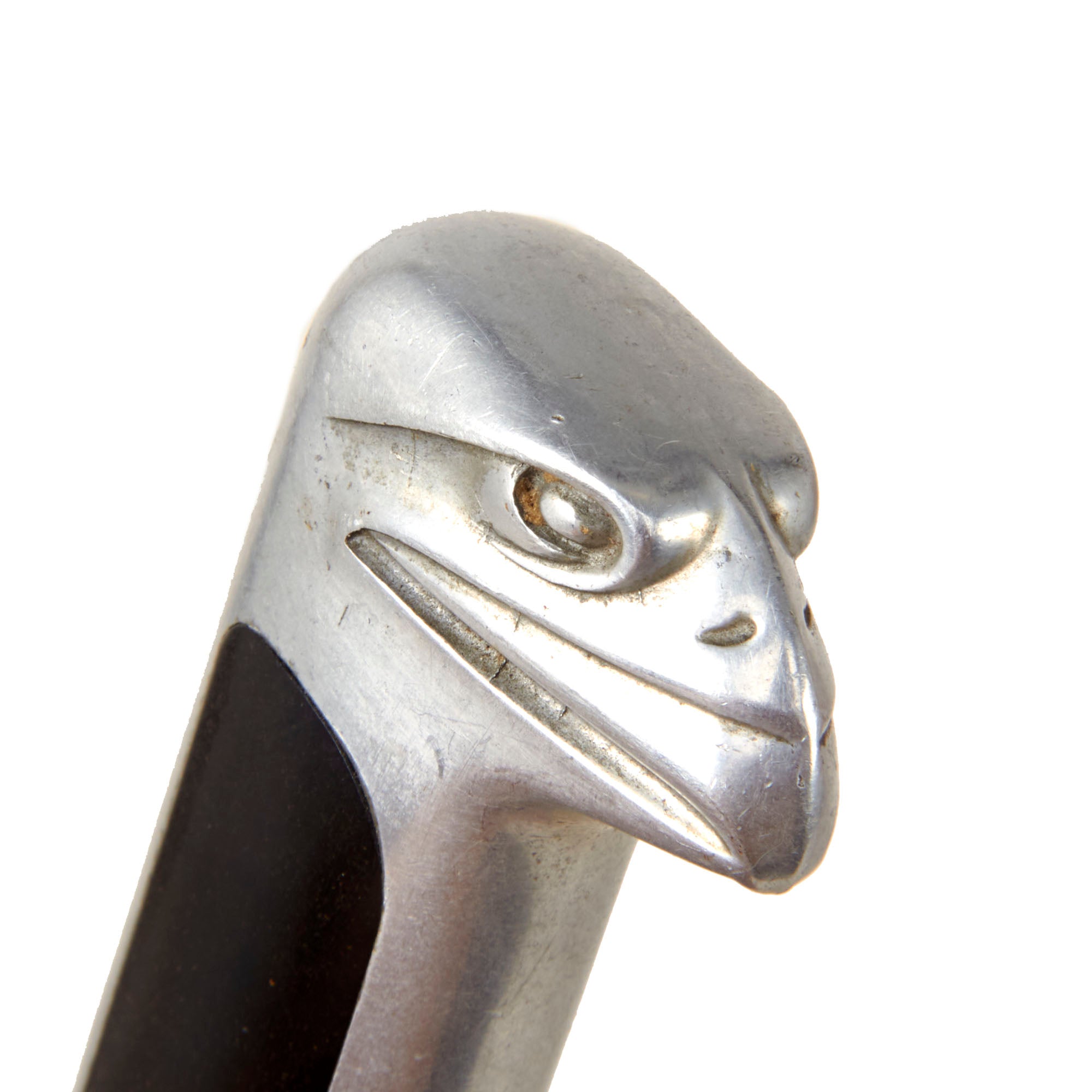 The eagle's head shaped handle is fabricated from aluminum and has a small quillon/crossguard. The are black plastic plates embedded on either side and held in place by a single brass screw, which screws into the back of a brass Fasces insignia on the other side. The Fasces is a bundle of sticks with an axe head, and is the symbol of the Fascist party in Italy. Most likely the insignia was originally gilt, but that has faded. Also there is very light corrosion and pitting in the aluminum around the cross guard. We have left it as is to preserve the patina.
