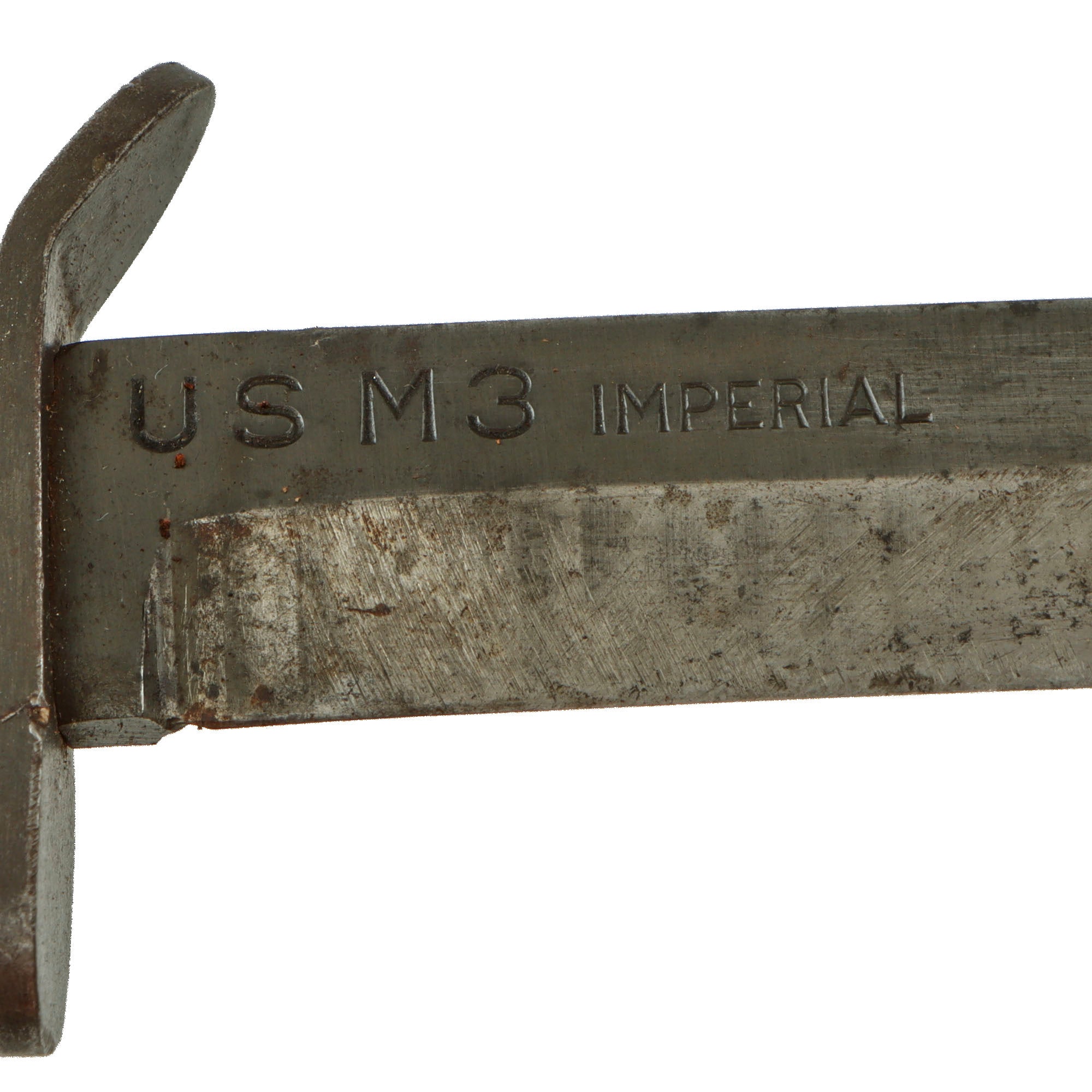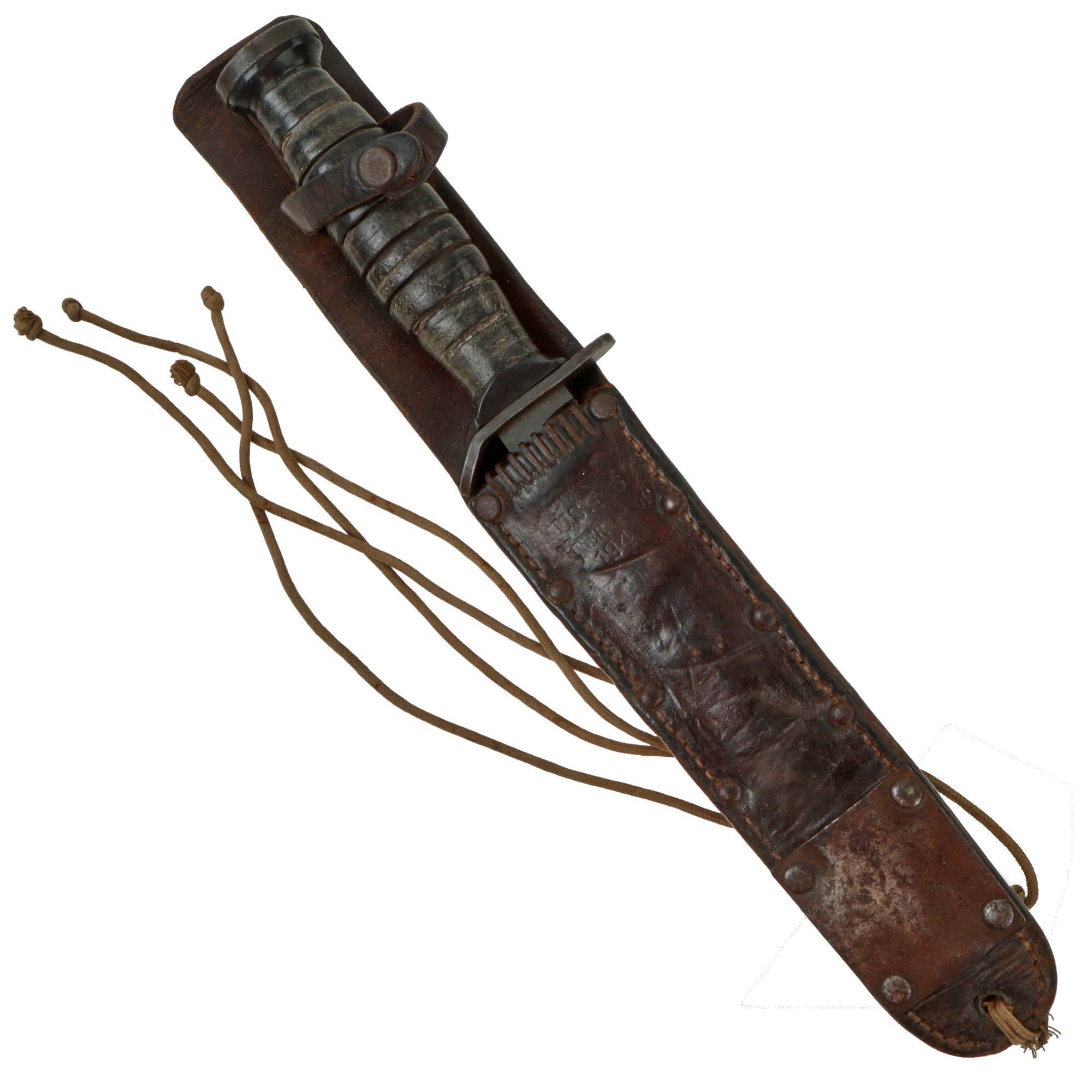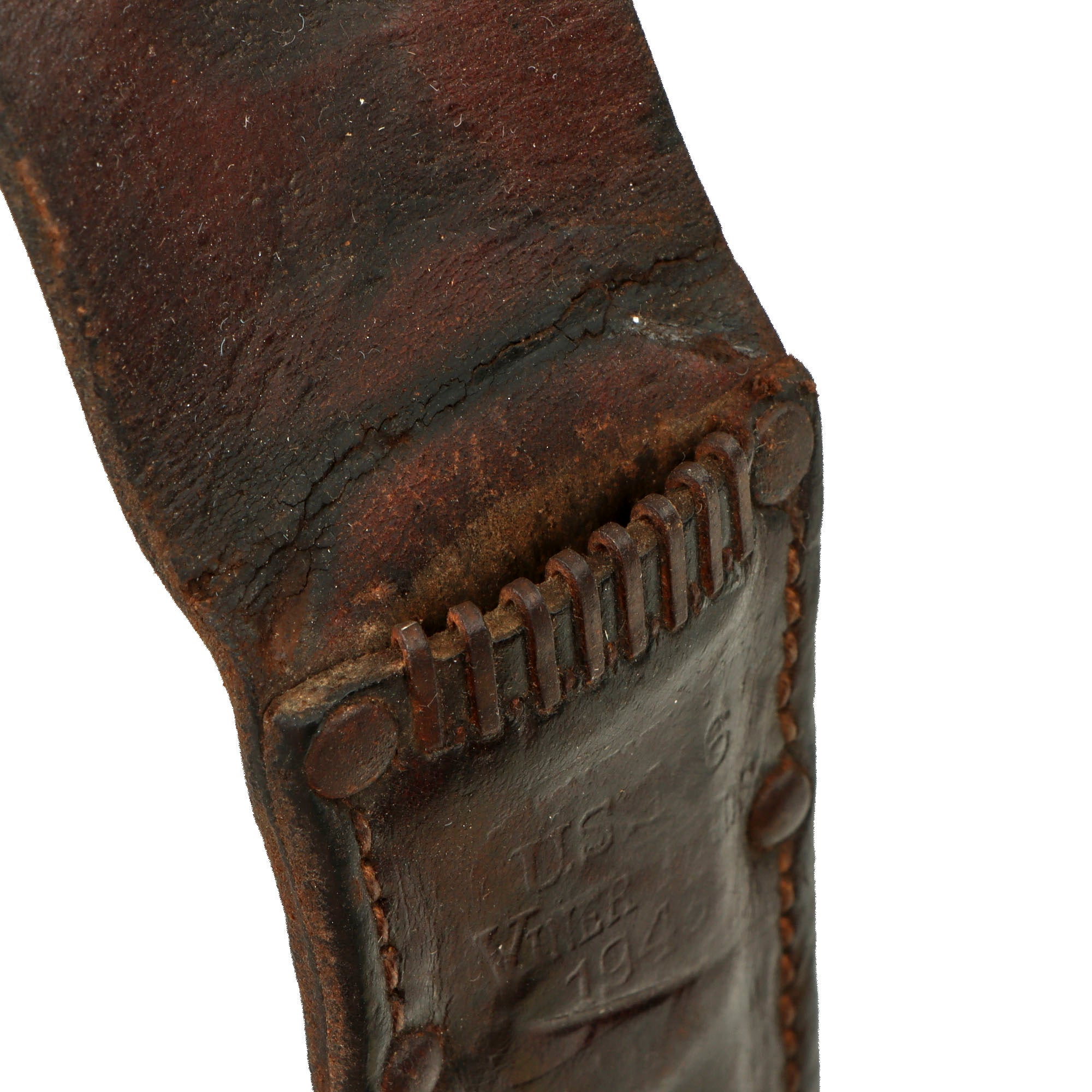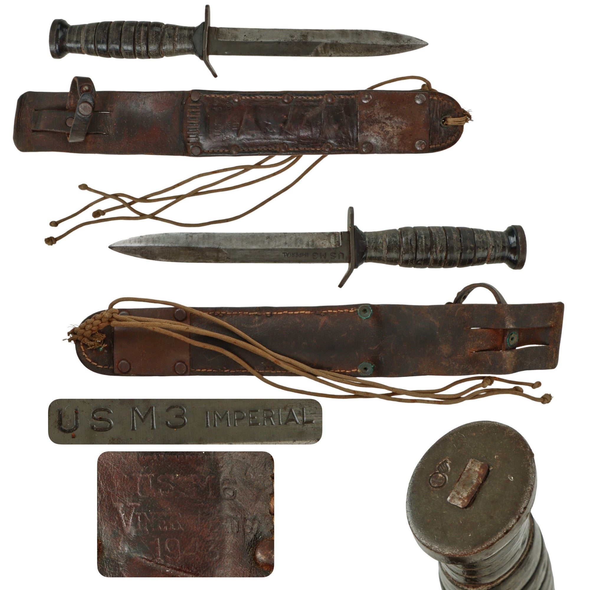 Original Item: Only One Available. This is a fine condition WWII production Mark 3 U.S. fighting knife, made by the desirable maker, Imperial Knife Co., and contained in an original 1943 dated M6 leather Scabbard by Viner Bros. Imperial made M3 and M4 bayonets, as well as other smaller edged weapons for the U.S. Government during WWII. This example has a soldier’s name and partial number written on, but it is not enough information to ID him.