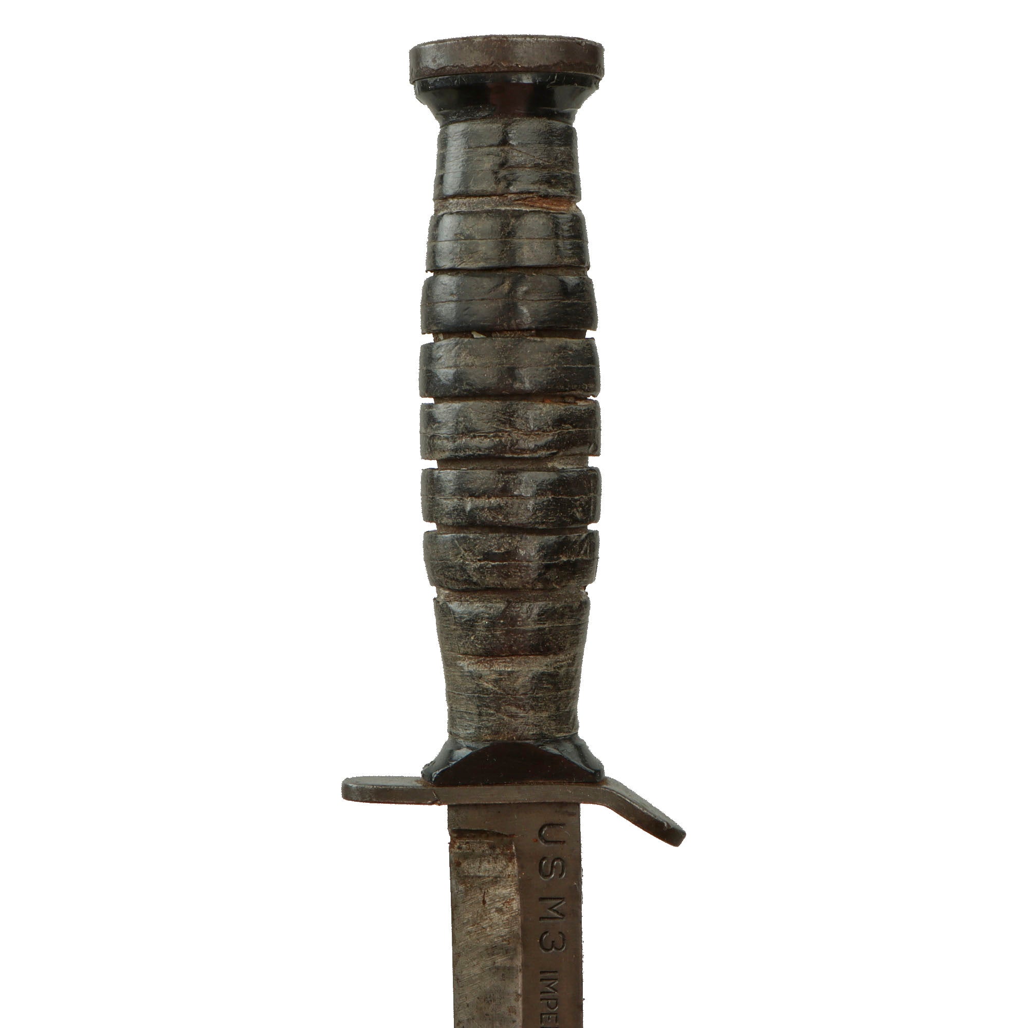 A very nice example of an early issue M3 knife from a desirable maker, in an early leather scabbard, ready to add to your WWII edged weapon collection!