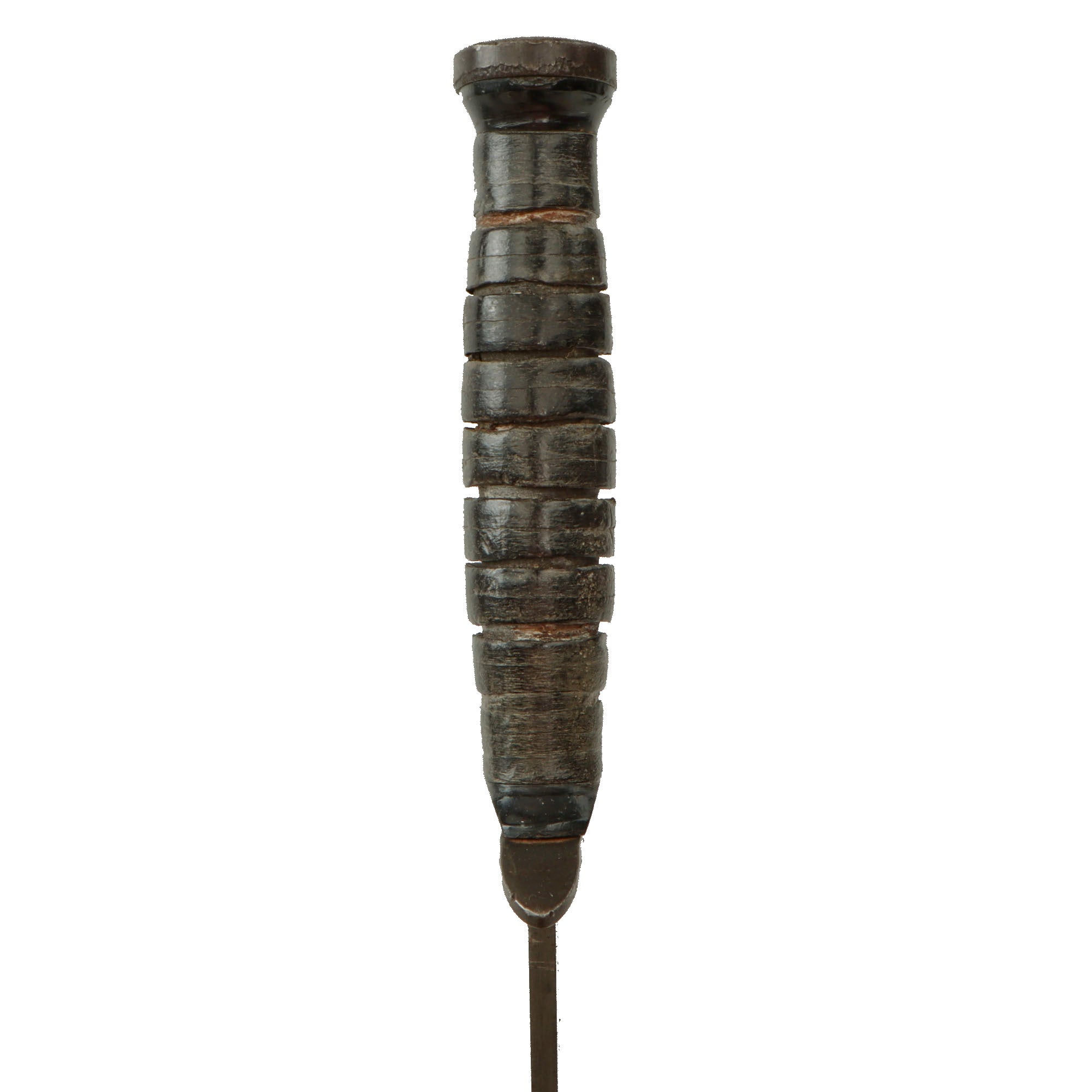 This knife is early production, indicated by the maker information being stamped directly on the blade: U S M3 IMPERIAL. This is the second version of the knife, as the first all had the date "1943" after the maker. The later version moved the markings to the cross guard. The 6 1/2 inch spear point blade is in good used condition, with most of the original finish gone due to sharpening and wear. The handle and stacked leather grip are in great shape, with a lovely color, but there is a good bit of denting in the pieces. The bottom of the pommel shows the U.S. "Flaming Bomb" proof mark.