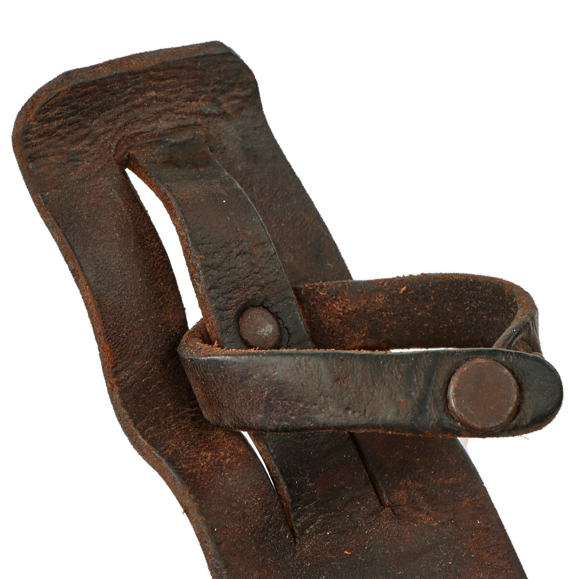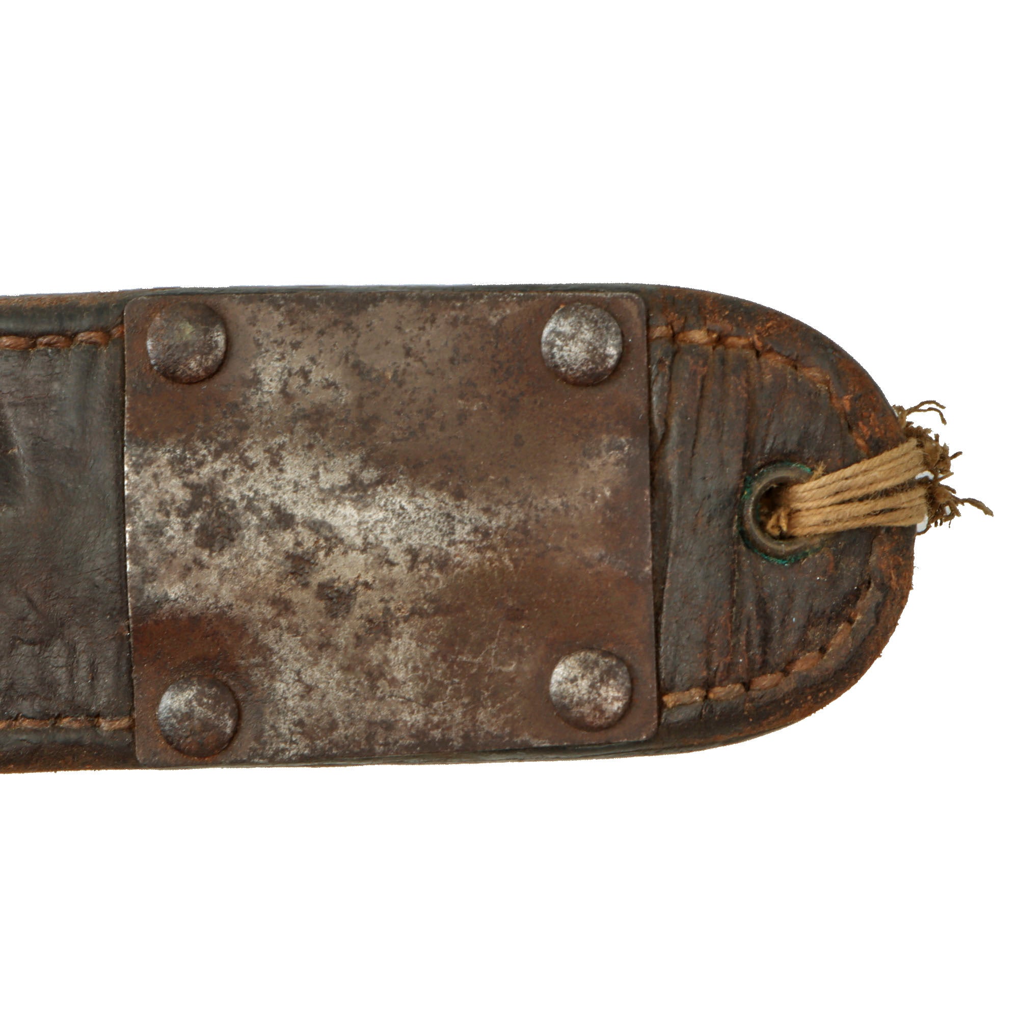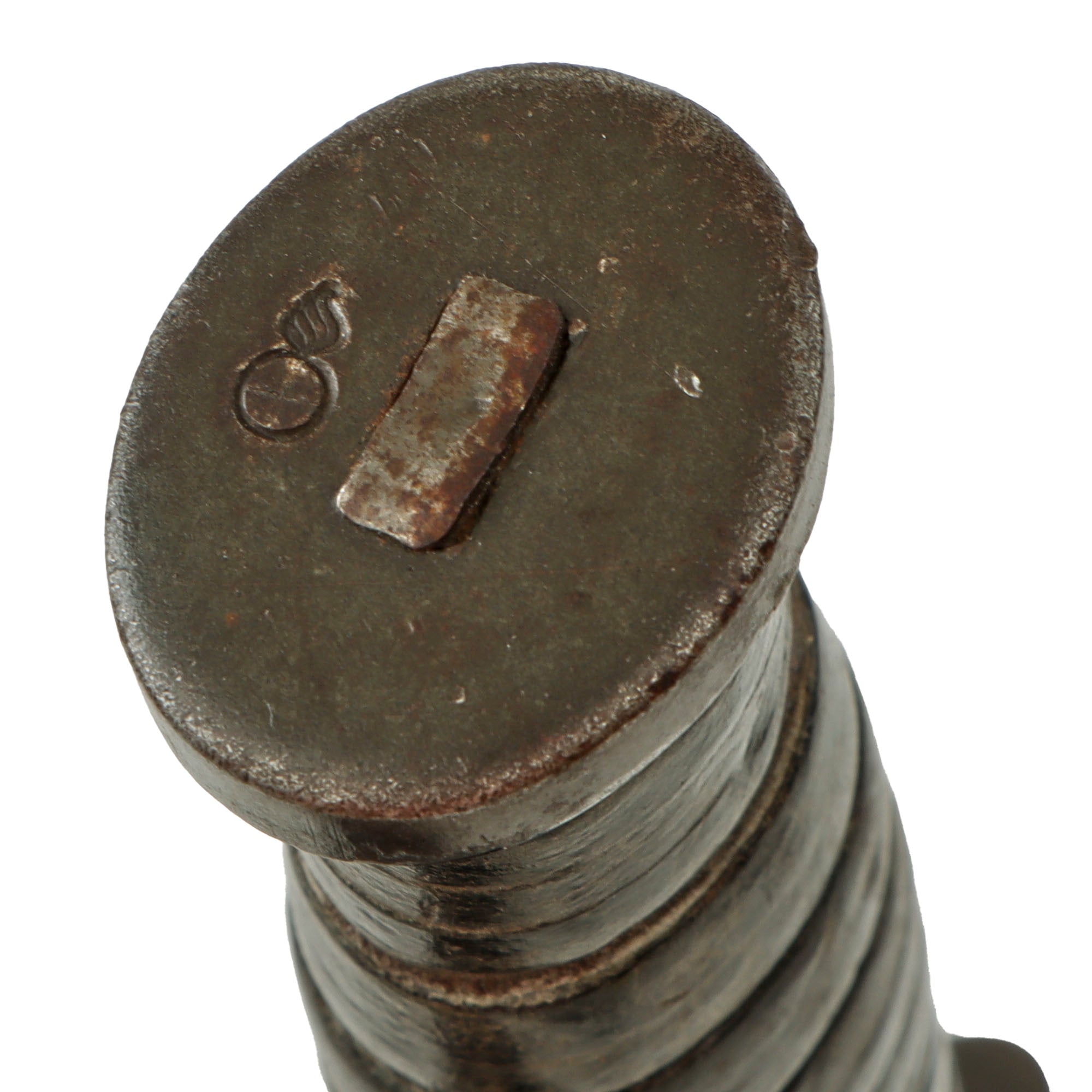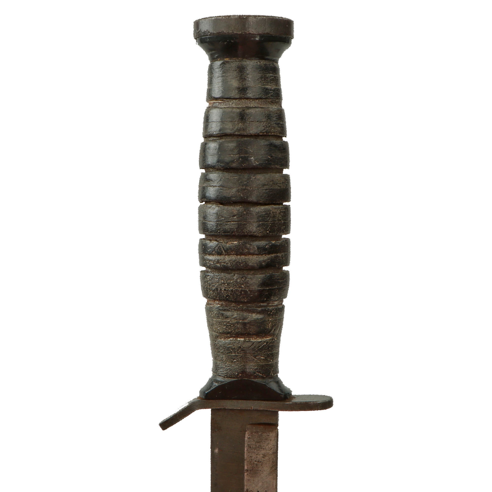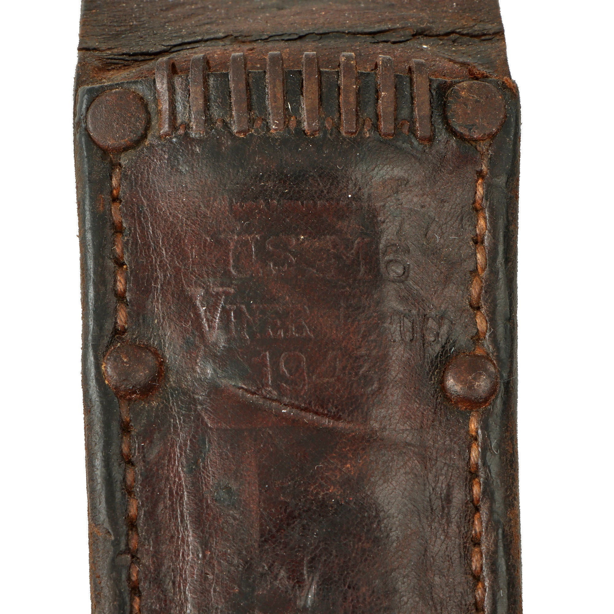 The original M6 leather scabbard is in great shape, and still clearly marked U.S. M6 / VINER BROS / 1943 just under the stapled throat. This was one of the larger makers, who produced about 21% of the scabbards, compared to 45% made by MILSCO, the largest contractor. A braided rope thong is retained.