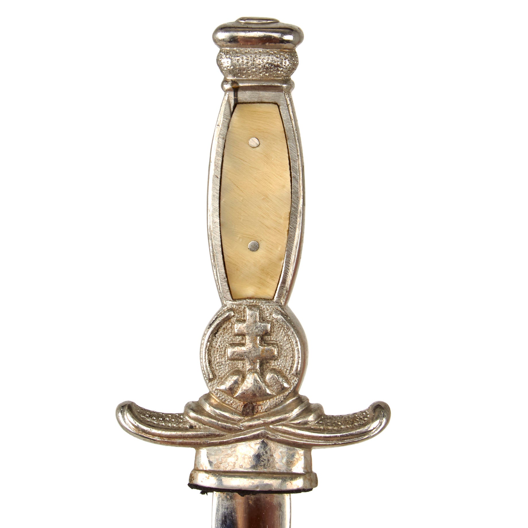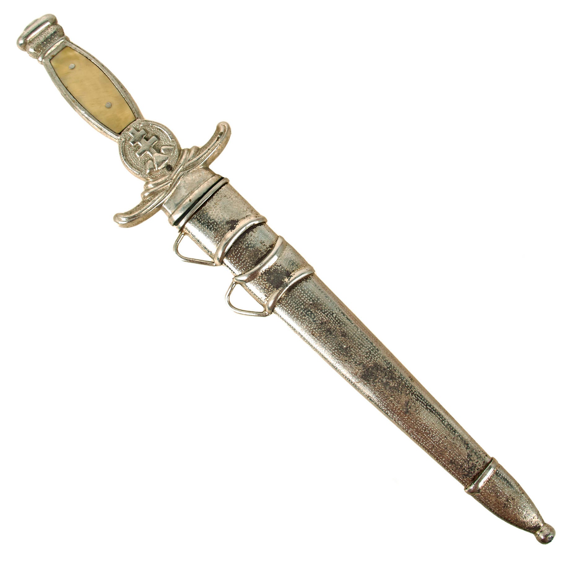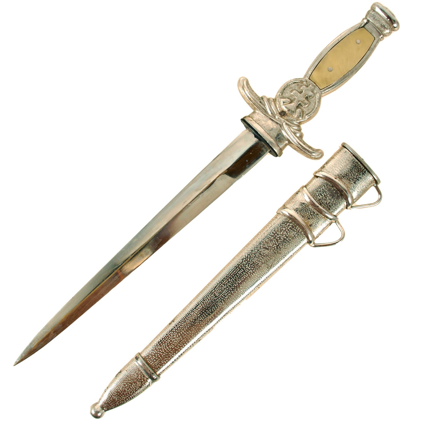 Original Item: Only One Available. This is a rare Second World War Slovak Army Officer Dagger. The wonderful grip is constructed of heavy, silver plated fittings, non magnetic, with simulated mother of pearl fittings in the center. The blade is made of plated steel, unmarked, in excellent bright condition. The leather blade buffer is still retained, rare to see! The scabbard is constructed of heavy silver plated metal, magnetic, straight and also in near mint condition. Overall offered in excellent condition.