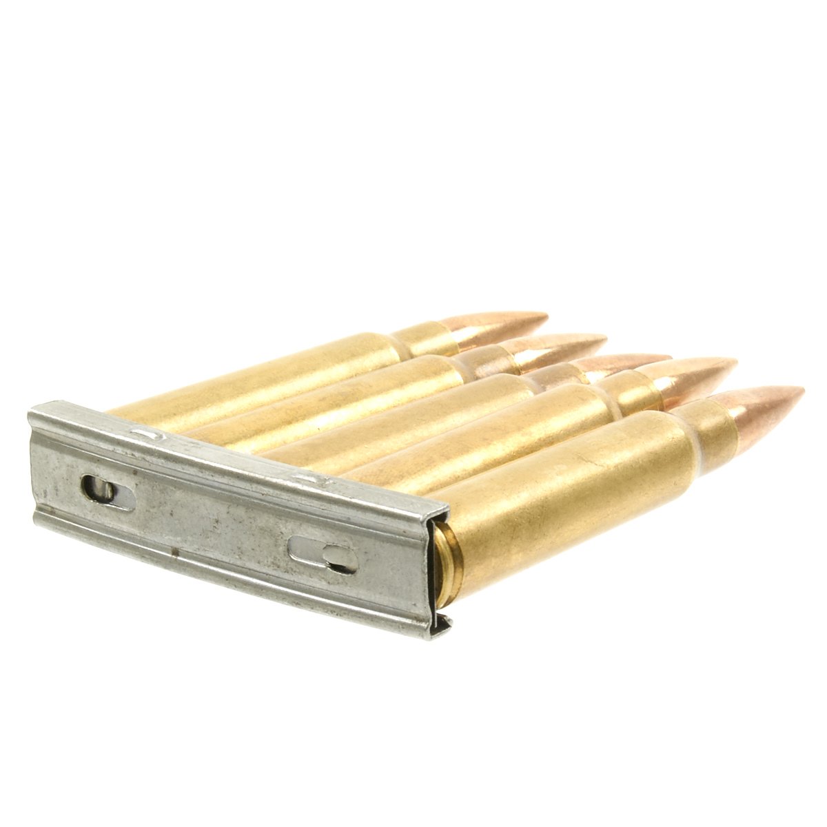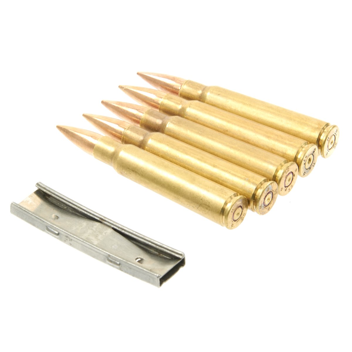 Original Remanufactured Items: This is a very nice display set, made up of an original stripper clip for the Legendary German Mauser Karabiner 98 Kurz (k98k), with a set of 5 dummy cartridges to fill it. The Mauser 98 Series of rifles were the standard Infantry rifles of the German military from 1898 up through WWII, with the K98k being the last variant fielded. From 1903 onward, this series of rifle was chambered for the 7.92×57mm Mauser (8mm Mauser) rimless cartridge, which was also the same cartridge used for ground-based German machine guns such as the MG08, MG34, and MG42.
