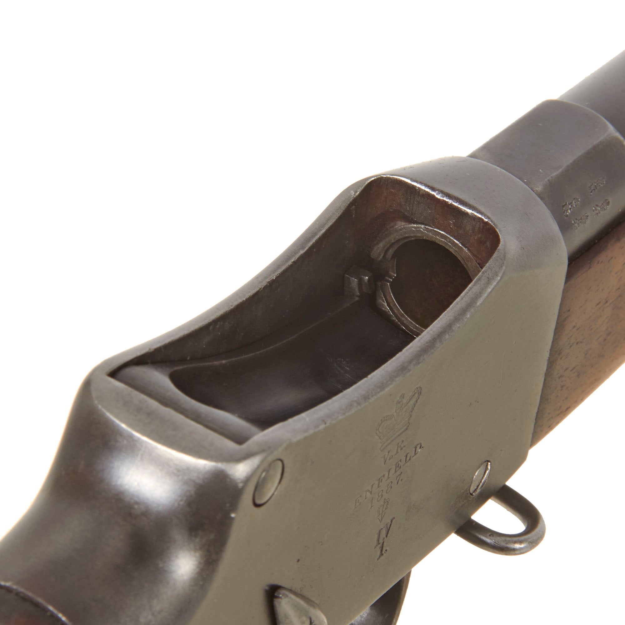 The success of enhanced extraction of the longer lever of the Enfield-Martini Pattern B rifle was readily adopted for all MkIV patterns, those existing Enfield-Martini A pattern walnut stocks required the brass stock cup re-siting to correspond with the long levers' tip. The process required a fresh recess hole to be drilled and the cup re-set. A purpose made wooden plug was glued into the hole completing the process. As the stocks were all removed there is no consistency as which stock was fitted to A or B pattern, so they will be found on any pattern. Wherever possible the old components were re-used, and the "E-M" designation originally marked on many of the parts betrays today its original pedigree often scored through thus: E-M. The A pattern trigger assembly, designed to accept the E-M's safety was reamed to remove the original configuration, whilst Receivers and butt stocks of the old pattern had an extra Roman numeral "V" stamped alongside the original "I", whilst newly made but un-used components have a distinctive "IV" classification. A new pattern clearing rod, designed to spring into place and to be suitable with use of the new steel jag was installed and the nosecap was redesigned, however it was decided to retain to old pattern Barleycorn on Block foresight on the pattern "A".
