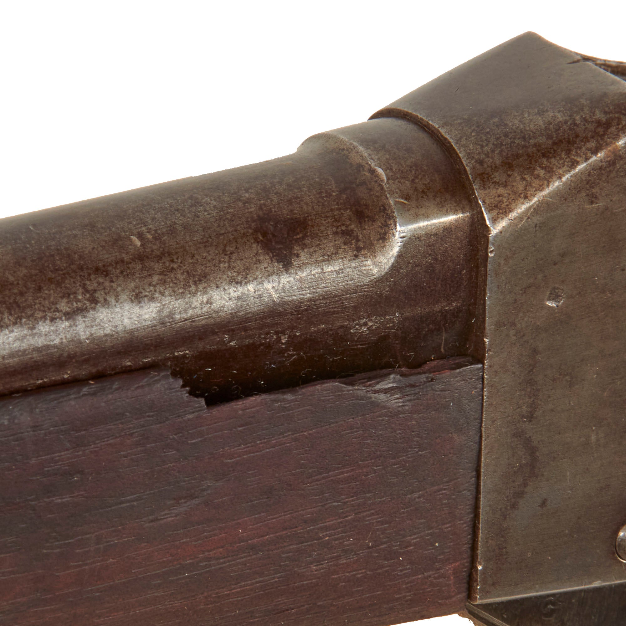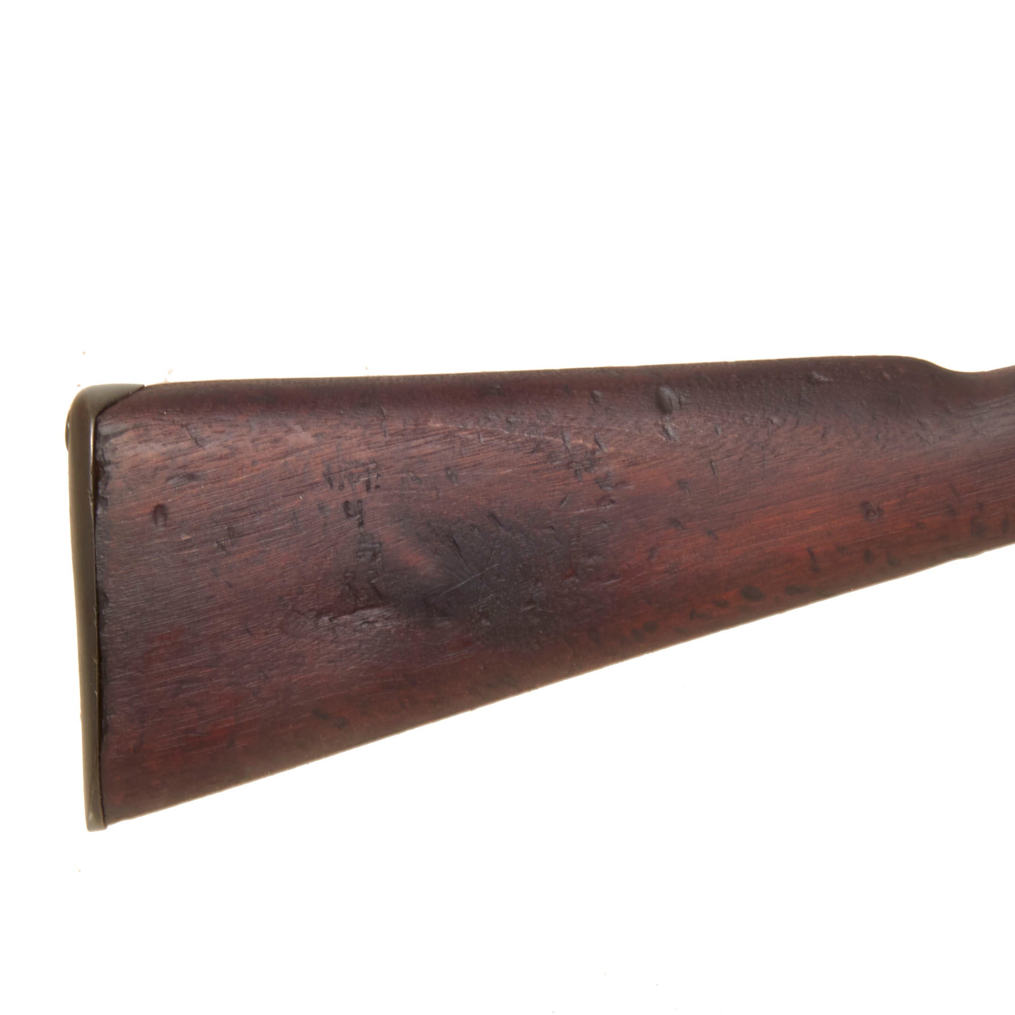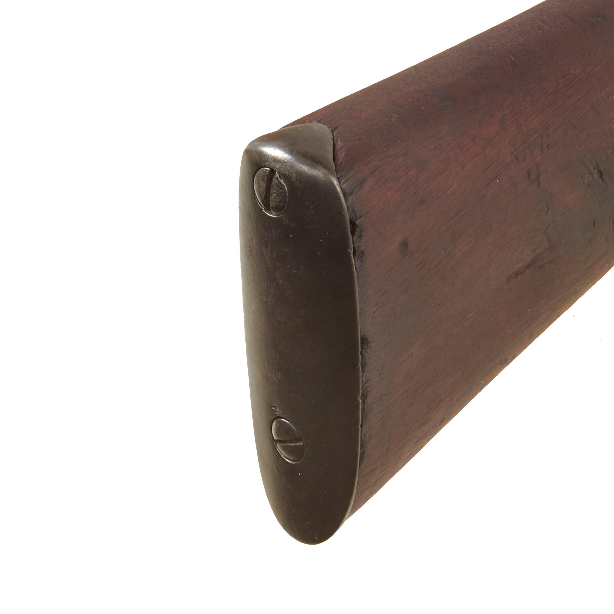 This particular example of the FIRST MODEL, and is offered in very good condition. It operates correctly, with a functional ejector, and a strong dry fire. The bore is in great shape with clear rifling. Please note that the "Henry" style rifling is polygonal, so it does not look like modern rifling. The metalwork shows a lovely aged patina, while the stock has a lovely red brown color. There is no major damage we can see, though there is a chunk missing from the left side of the fore stock where it meets the receiver.