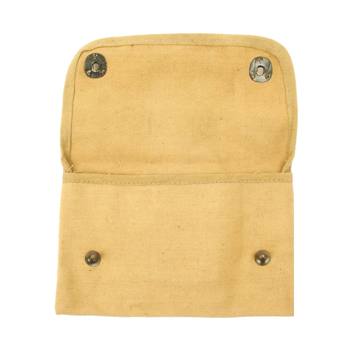 New Made Item: This is a high quality canvas pouch originally designed to be worn on the rear directly below the pack-tails. This is an exact replica of the all-purpose canvas cavalry pouch used prior to and during WWI. Marked "U.S." and comes complete with low slung belt hook fittings and lift-a-dot securing snaps.