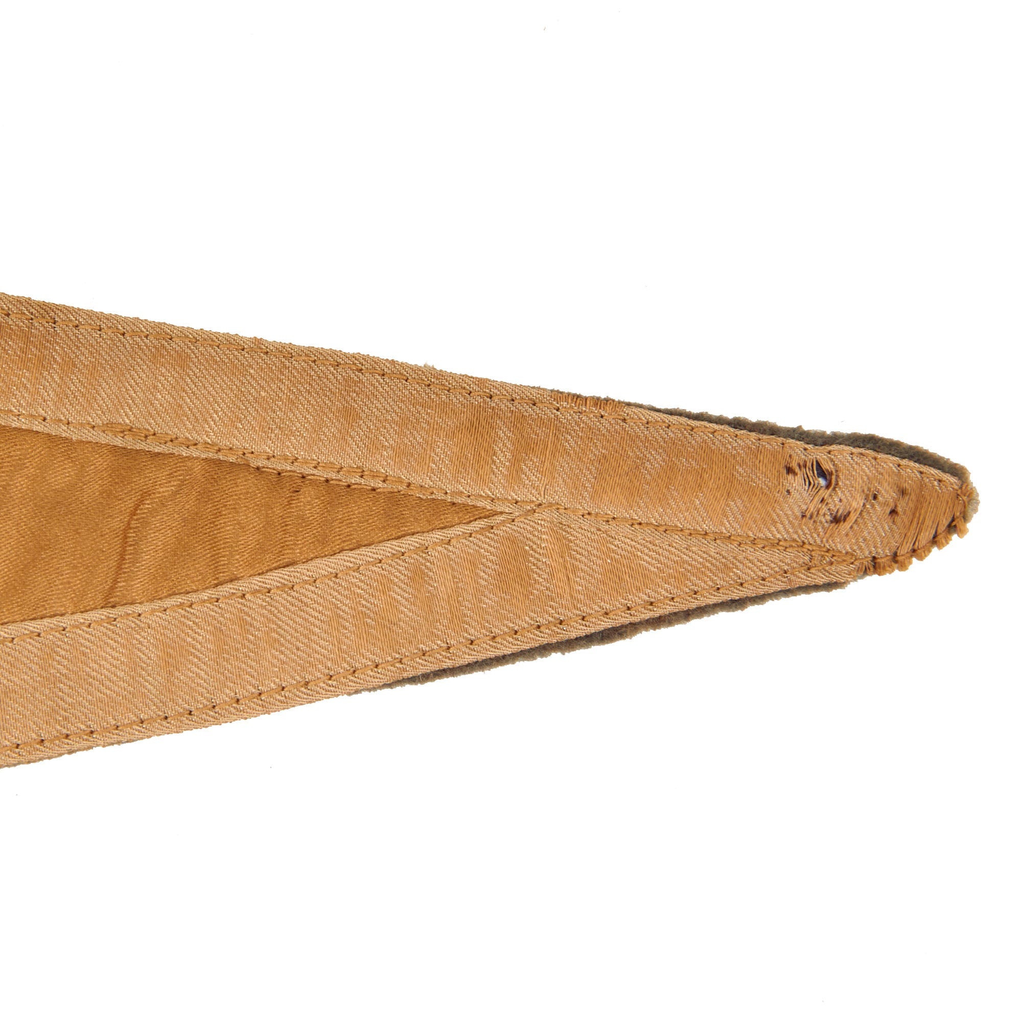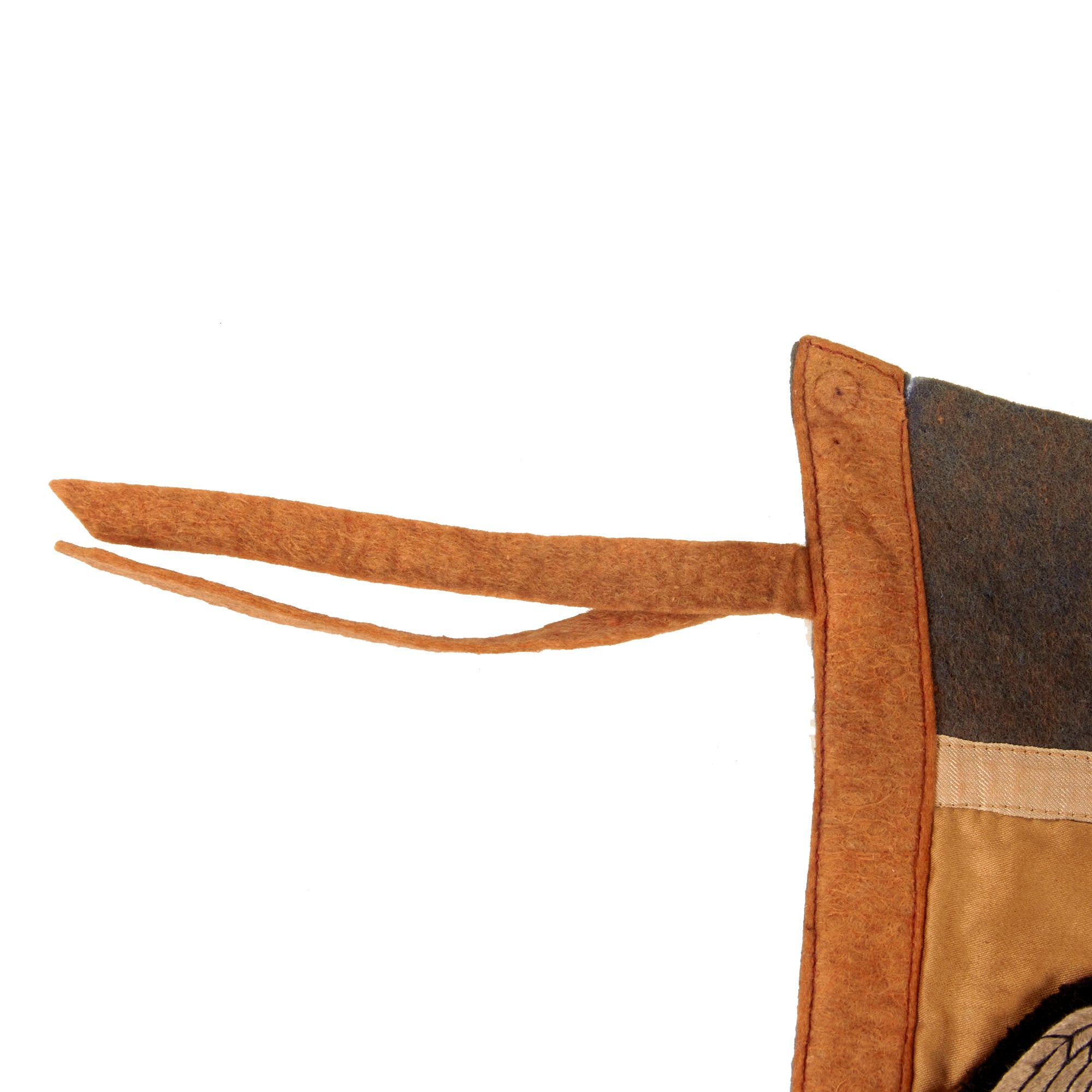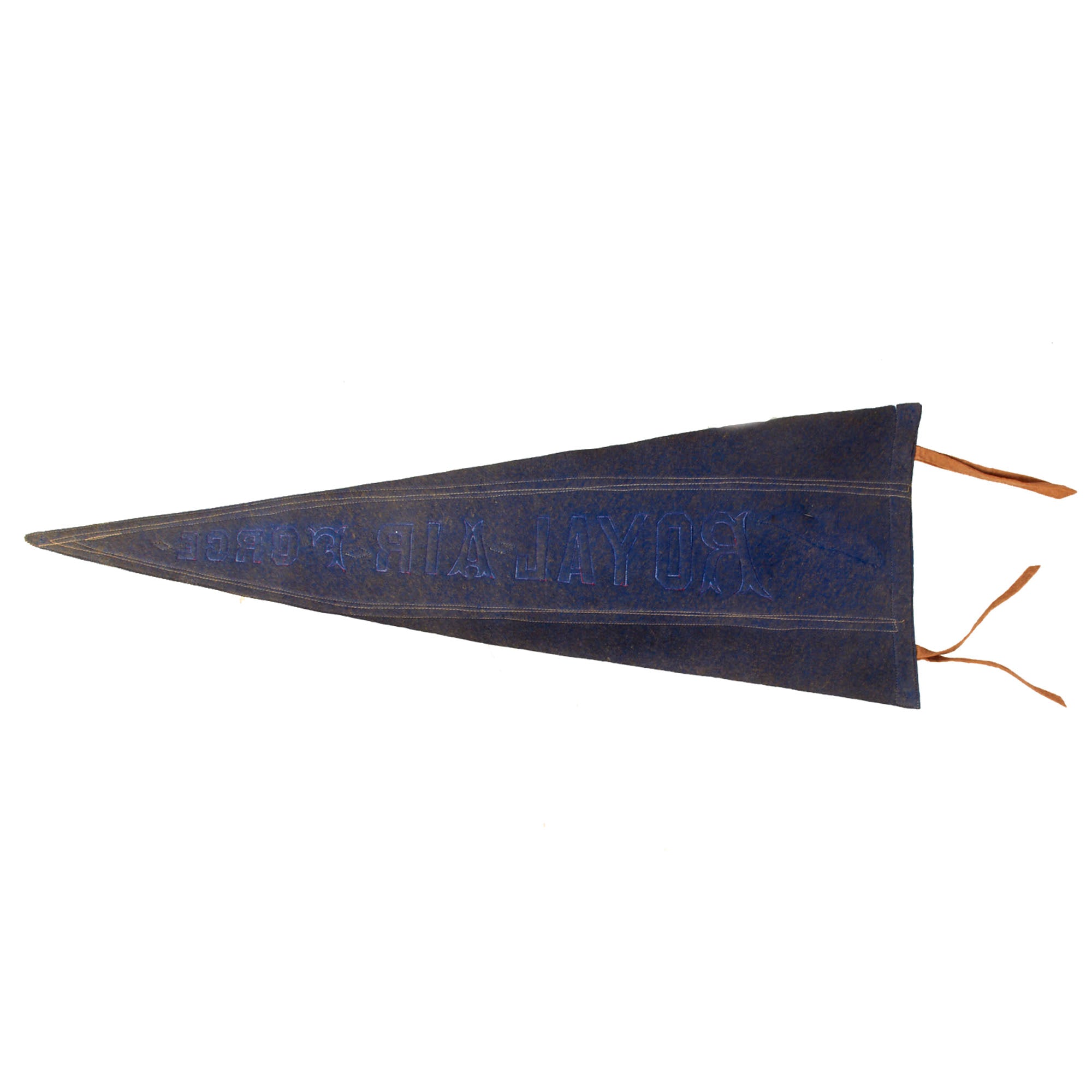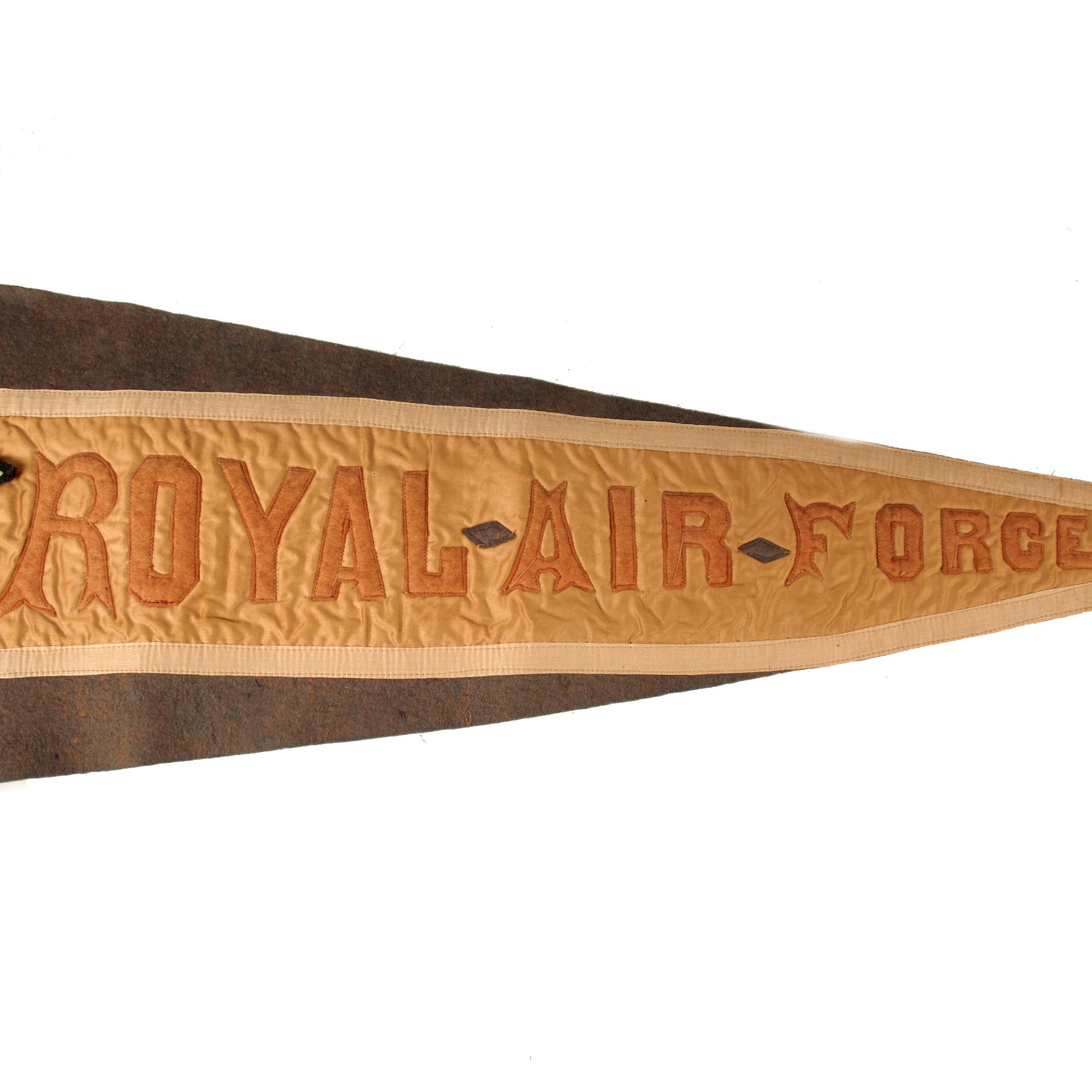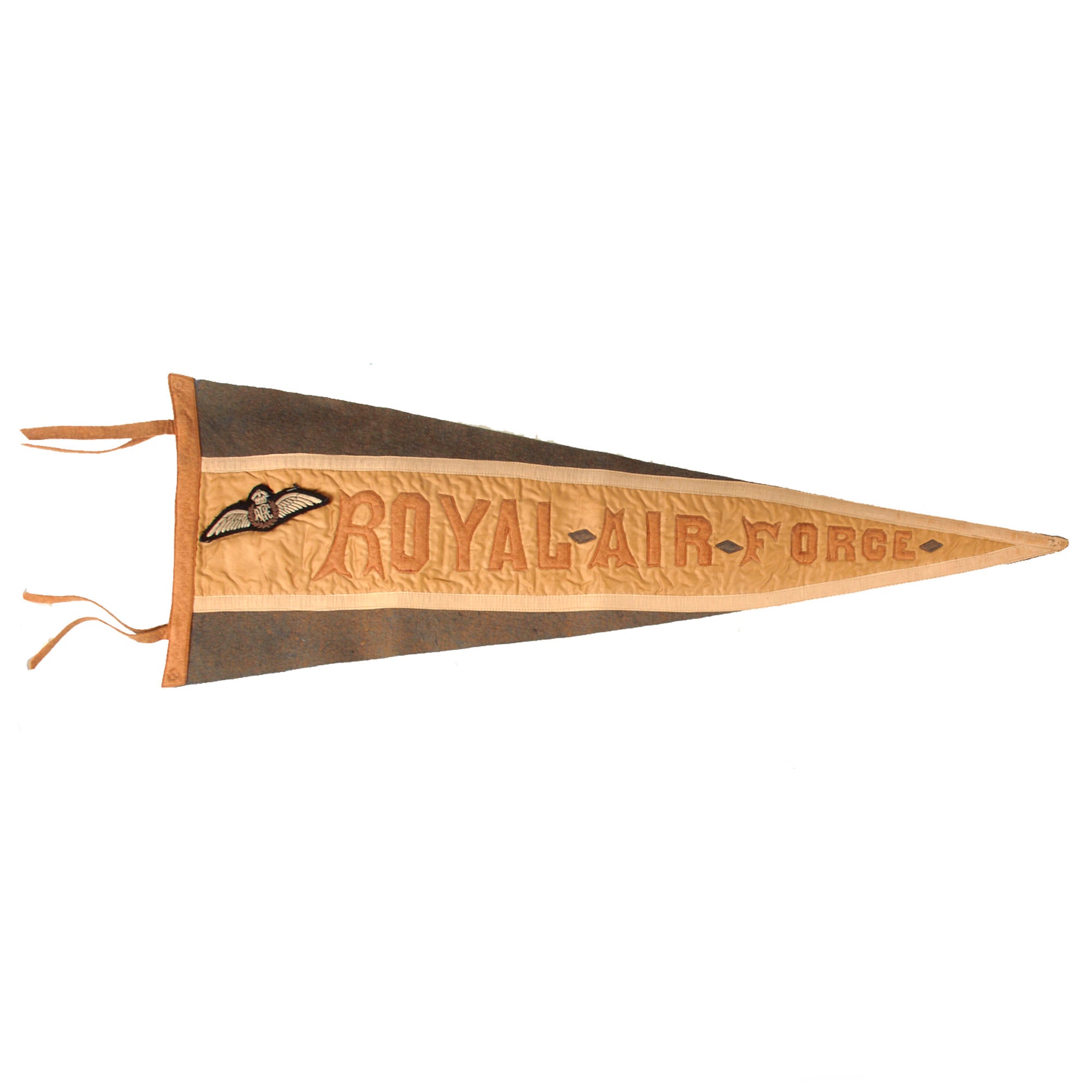 This is a lovely pennant measuring 10 ½ x 30” reading ROYAL AIR FORCE with retained tie strings at the end. The backing material appears to be silk, and this example certainly was flown for a long time given the color fading.