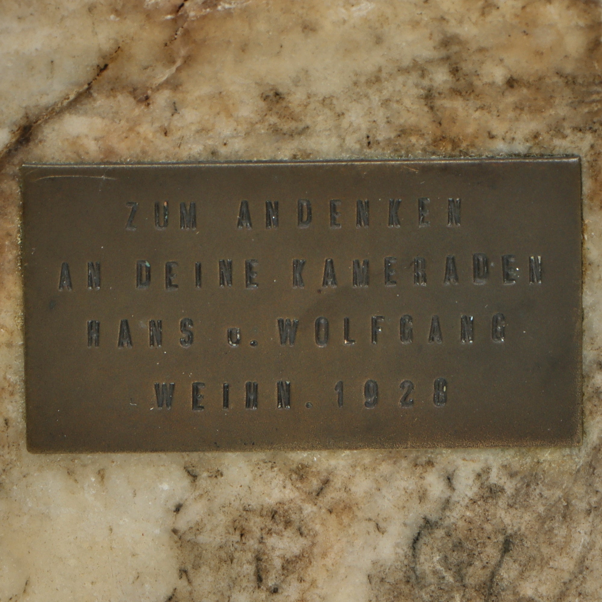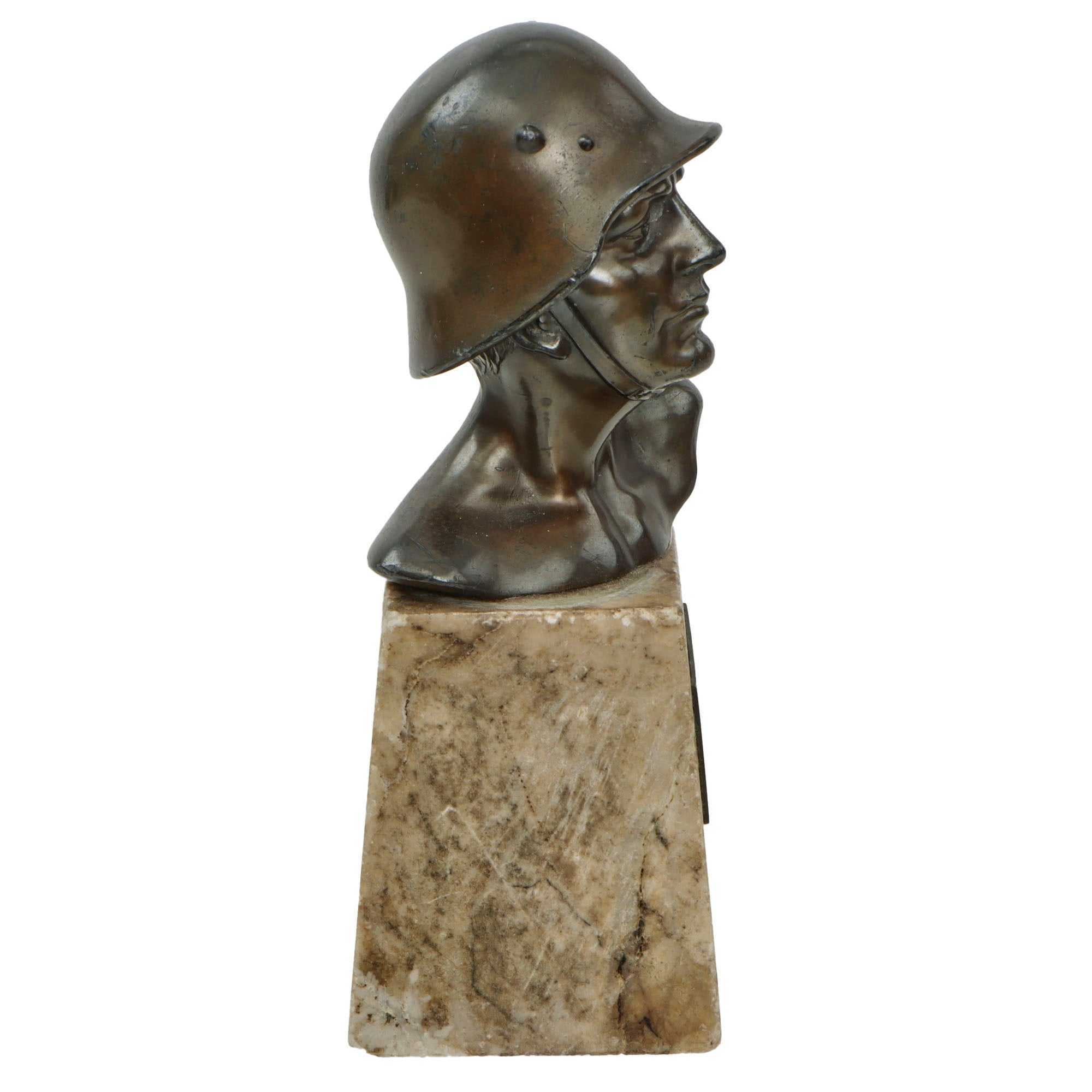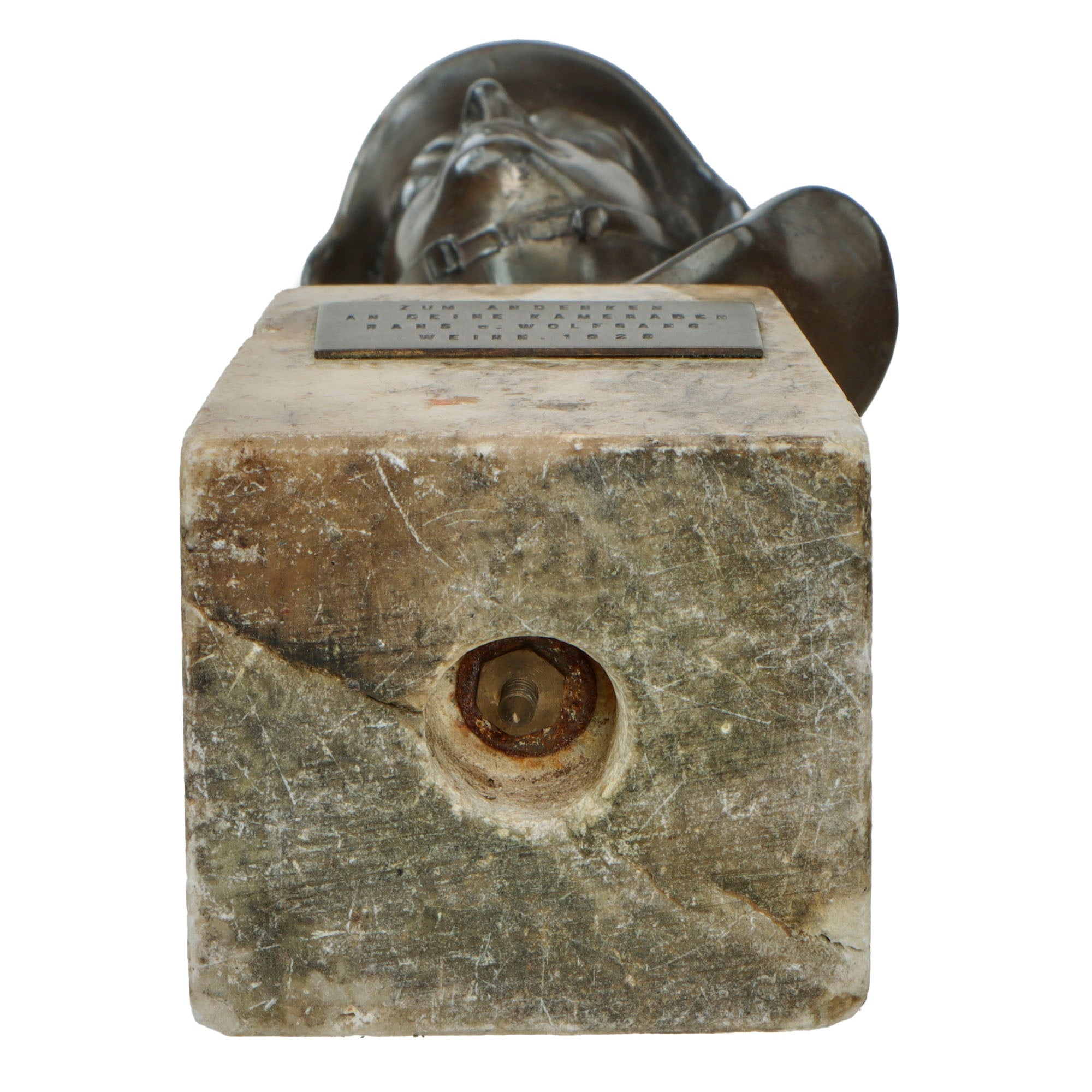 This is an outstanding metal bust of a Reichswehr soldier wearing an M16 Stahlhelm helmet, which were still standard issue during the interwar period. Looking to be made from bronze or bronze-painted alloy, the bust measures 3 1/4" tall, and is attached to a 2 3/4" tall marble base, which is 2 1/2"W by 2 1/4"D at the bottom. There is a dedication plaque on the front of the base, which reads:-