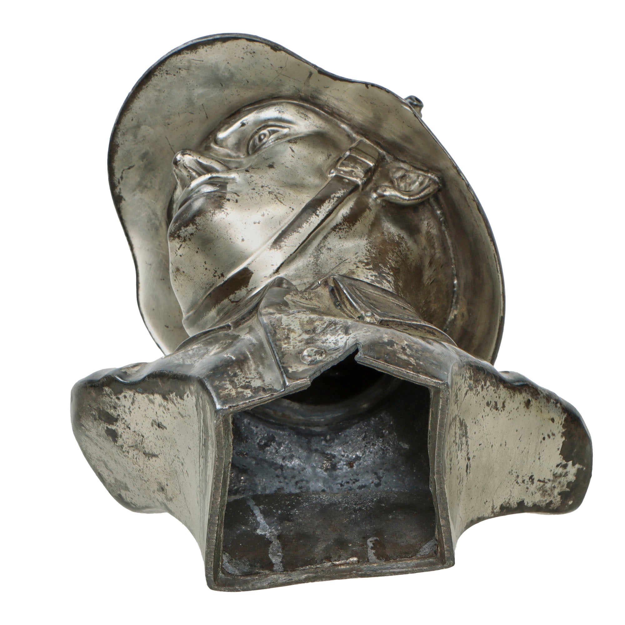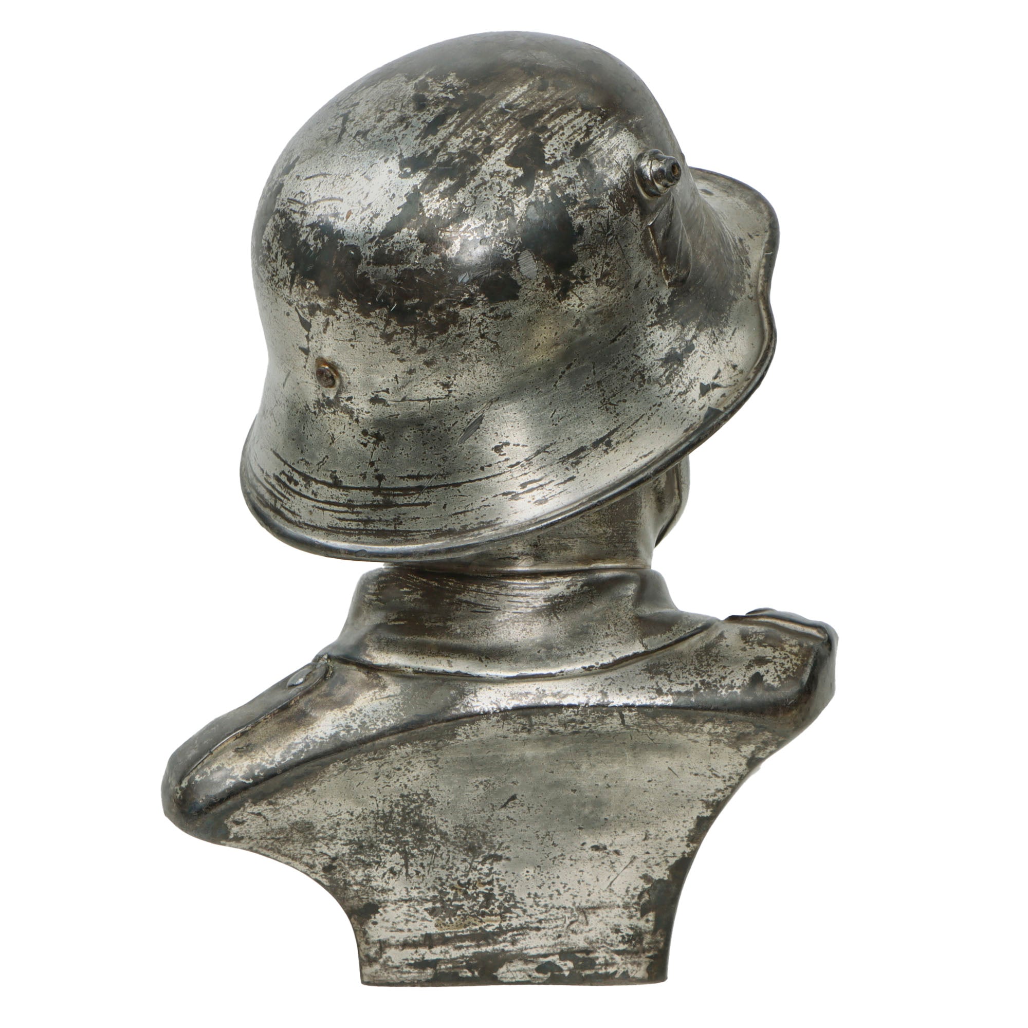 • Original Item: Only One Available. This is a lovely early German WWII hollow metal bust of a Heer Army soldier wearing an early war "Transitional" pattern M16 Stahlhelm helmet. During the build up to WWII, the first helmets that the Wehrmacht were armed with were re-fitted WWI helmets, which have the distinctive long vent hole lugs for attachment of a "stirnpanzer" armored shield. Due to how recognizable these were, sculptures and other art featuring German helmets often still retained them well into the WWII period.