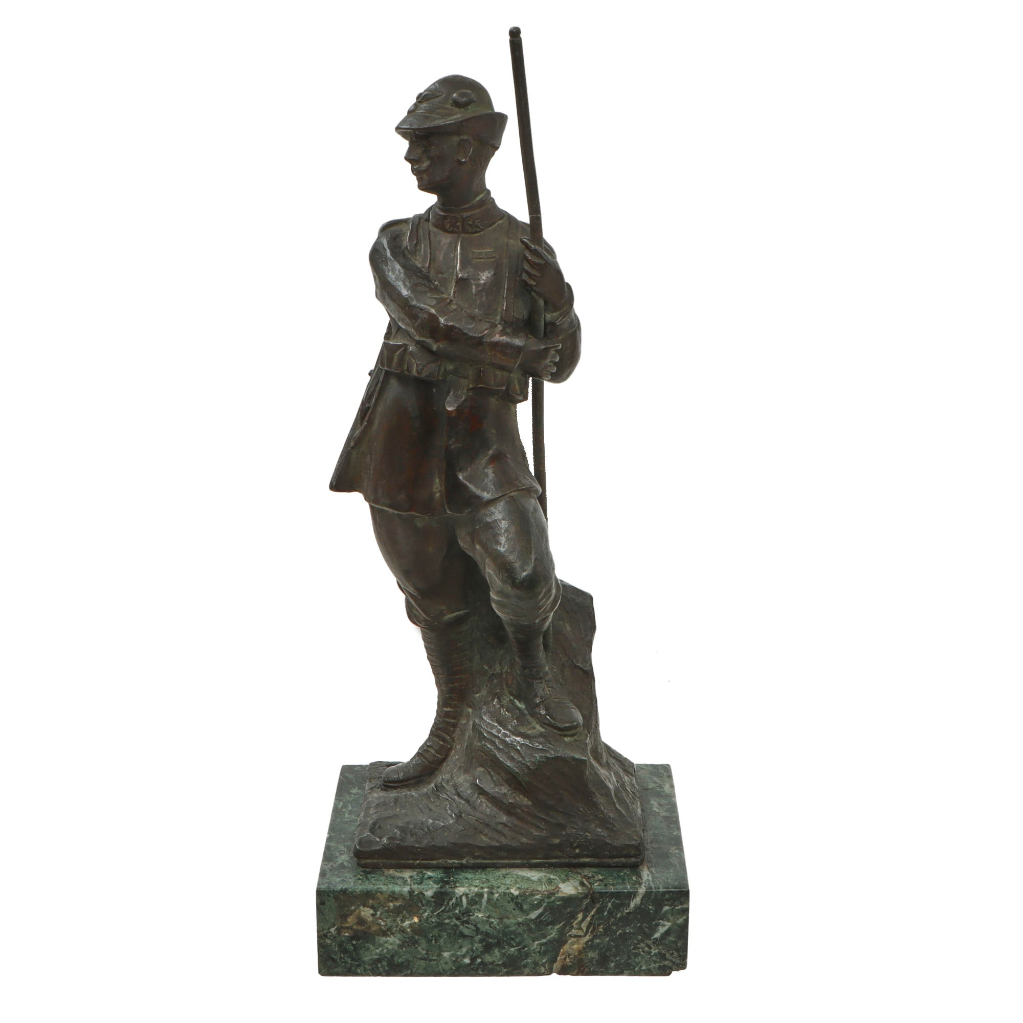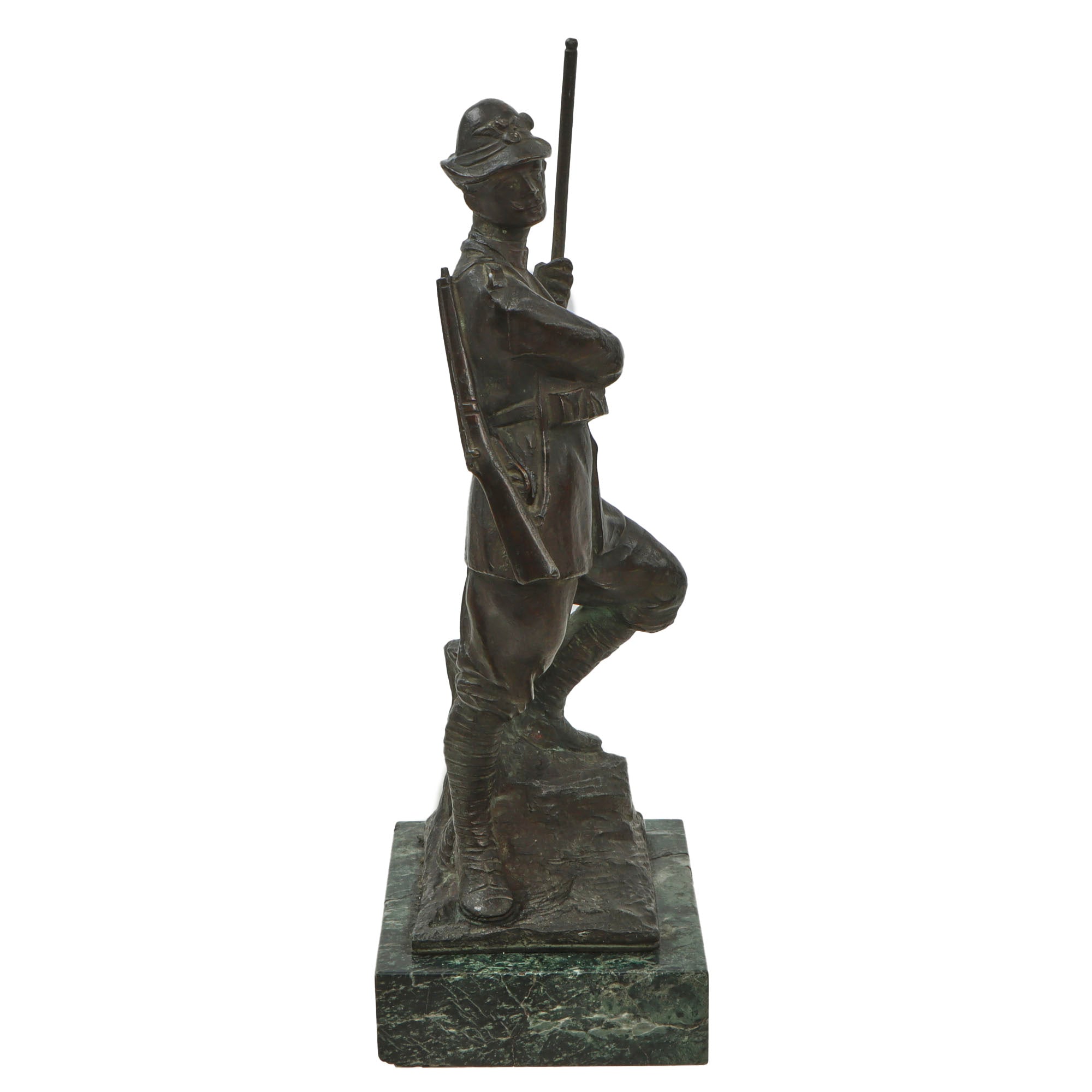 • Original Item. One-of-a-Kind. This is a glorious bronze statue that will serve as a centerpiece in any Italian militaria collection. This bronze depicts an Italian Alpini soldier, one of the Italian Army's specialist mountain infantry. Established in 1872, the Alpini are the oldest active mountain infantry in the world. Their original mission was to protect Italy's border with France and Austria-Hungary. In 1888 the Alpini deployed on their first mission abroad, in Africa, a continent to which they returned on several occasions and during various wars of the Kingdom of Italy. During World War I they fought a three-year campaign on the Alps against Austro-Hungarian Kaiserjäger and the German Alpenkorps in what has since become known as the "War in snow and ice".