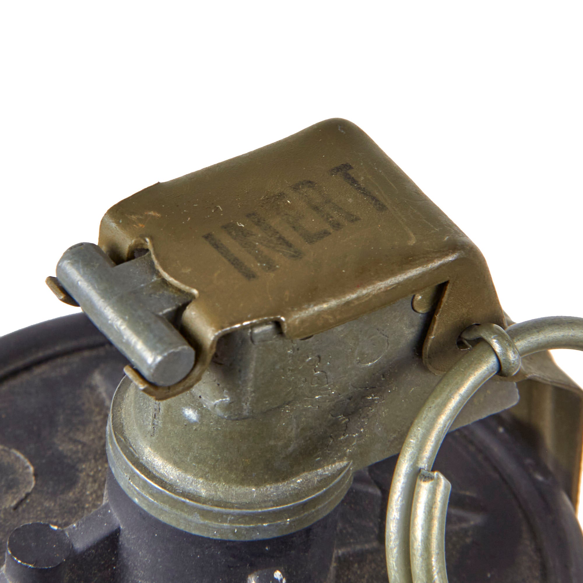 The fuze is stamped INERT and the pull ring and pin are retained. The grenade measures 6” tall with a 2¼” diameter.