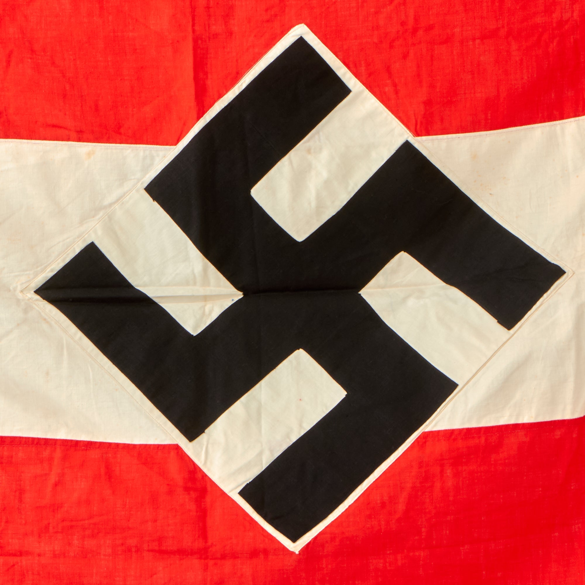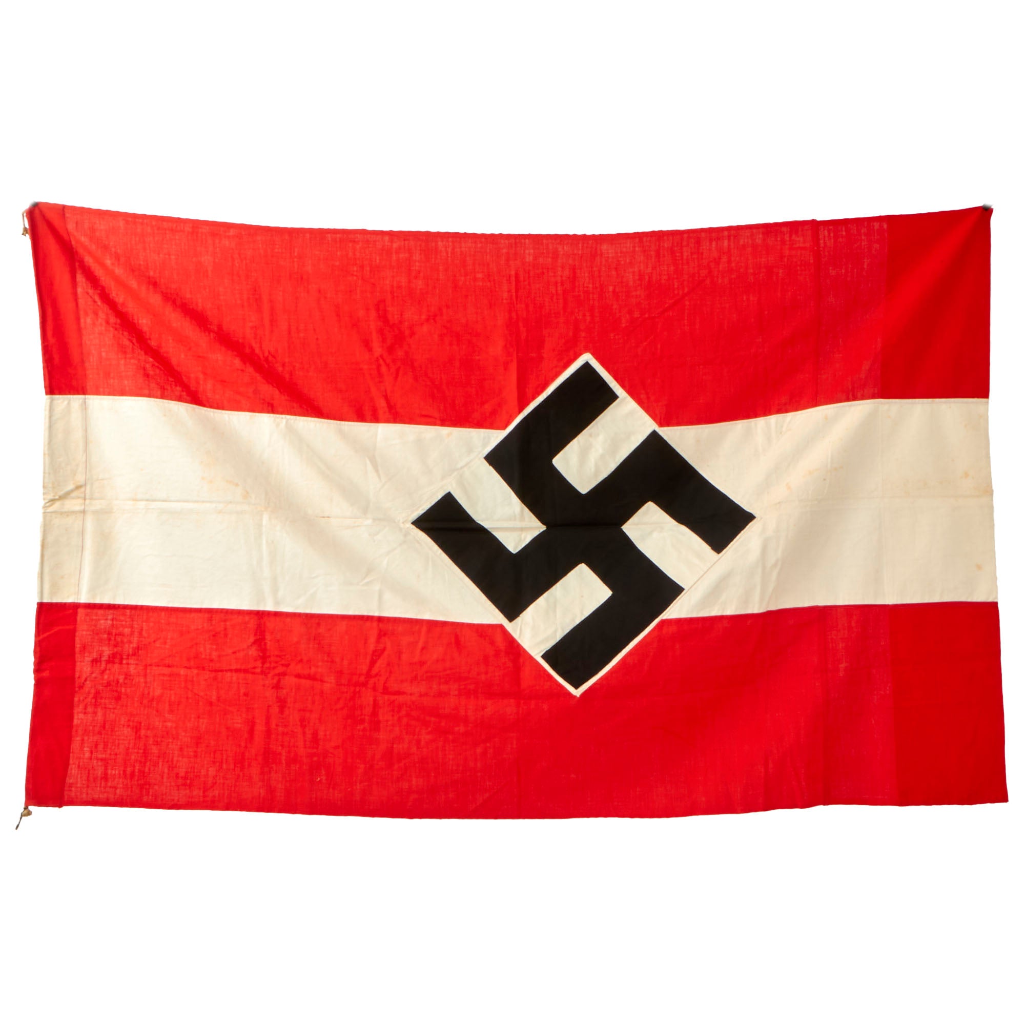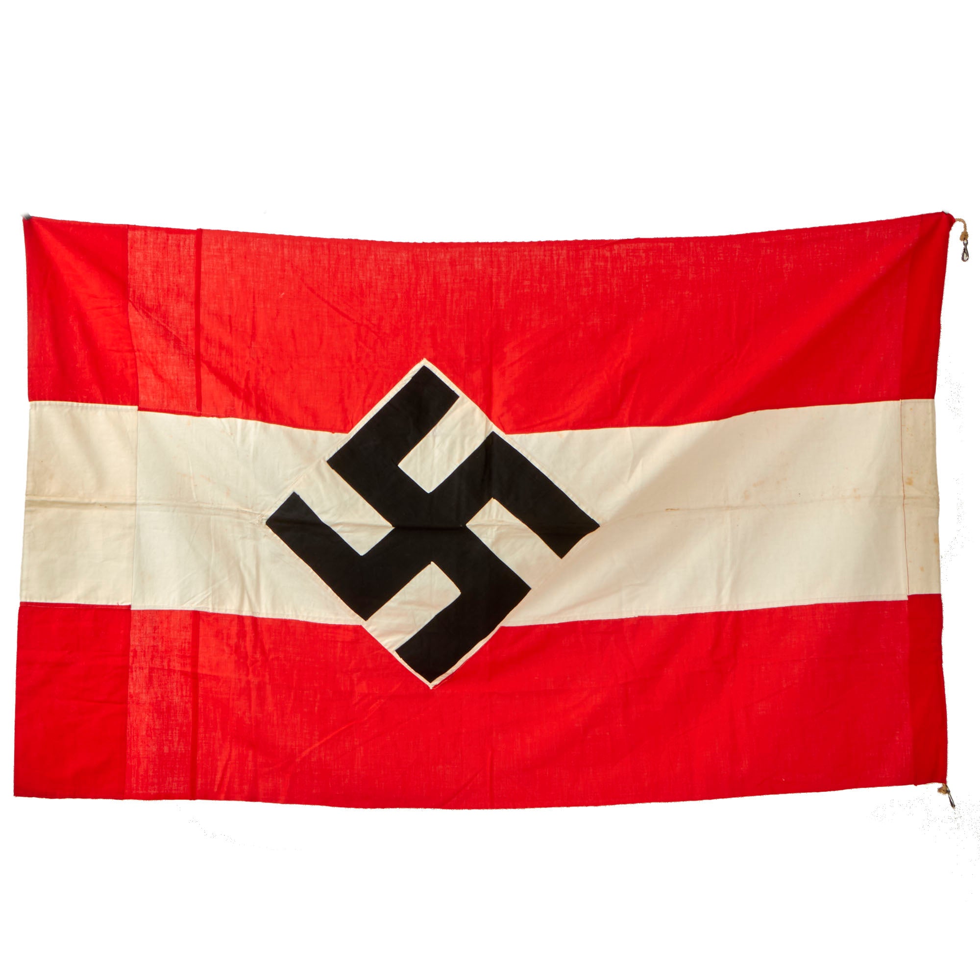 Original Item: Only One Available. This is a lovely example of a WWII German HJ National Youth Organization parade flag! The flag measures 31" x 50" and is a double sided multi-piece design. Each side has a HJ diamond insignia with a sewn-on black fabric swas (hook cross), and the red stripes of the body are each made of two pieces of fabric, while the white stripe is only one. One of the narrow edges is hemmed to make a hanger sleeve, and this has a sewn in thin halyard rope with metal hanger clips at either end. These flags would have been used to identify the different companies and elements within the HJ and would usually have a unit patch featured in the corner, however this example does not. Either this one was never issued to a certain element or was just a flag to identify the organization a whole, we do not know.