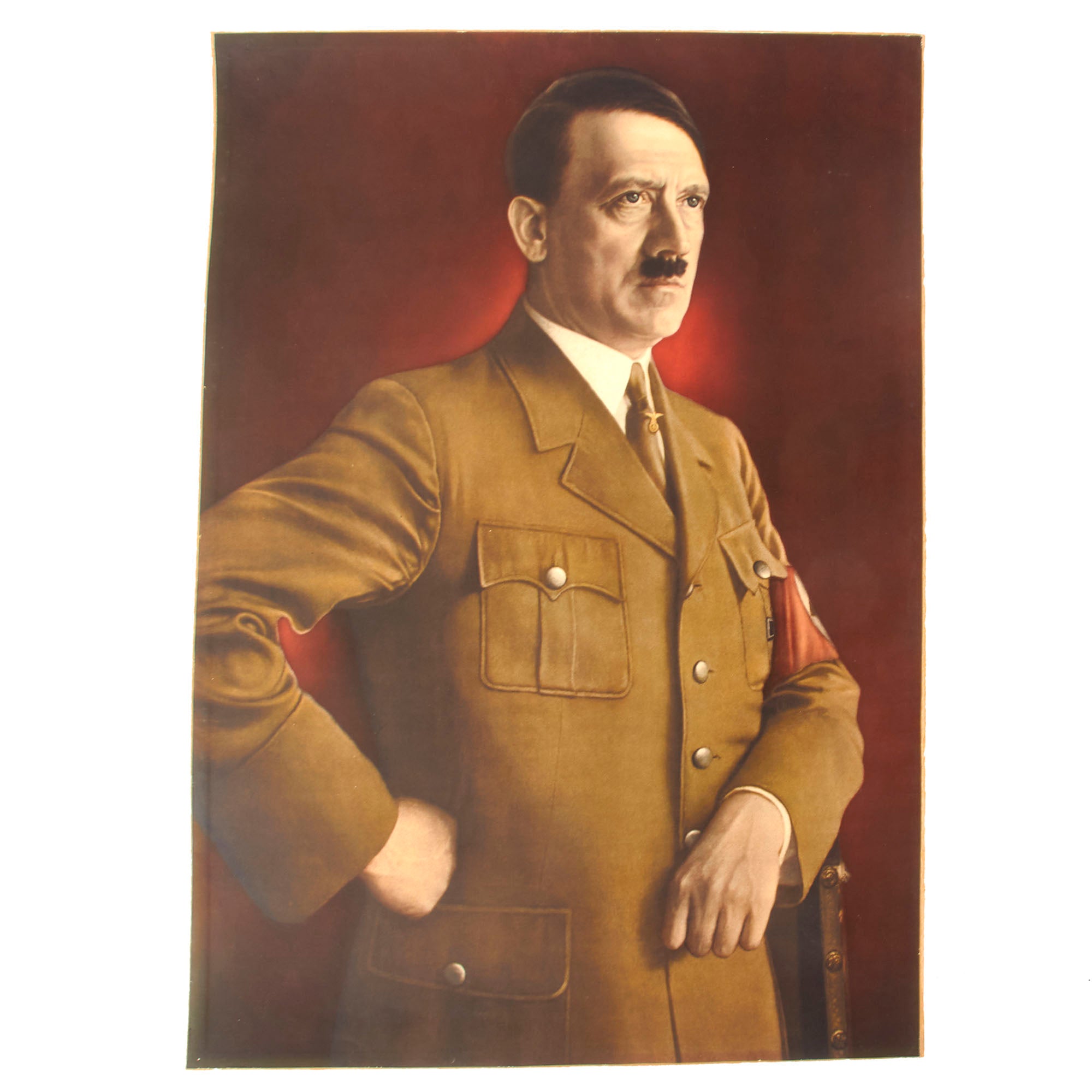 During the next decade, the NSDAP gradually grew in power, and in 1933 Adolf was made the Chancellor of Germany, after which he quickly consolidated power to become a true dictator. However, even after having taken over the government, additional support was always needed, as if the people completely turned against the NSDAP, nothing would be possible. As such numerous propaganda items were produced, including portrait posters like this, showing Adolf H in his NSDAP brown shirt uniform, with an NSDAP armband on his left arm. The poster measures 20 1/2" x 28 1/2", and looks to have at one time been framed using paper tape on the back, but was removed and rolled up some time ago.