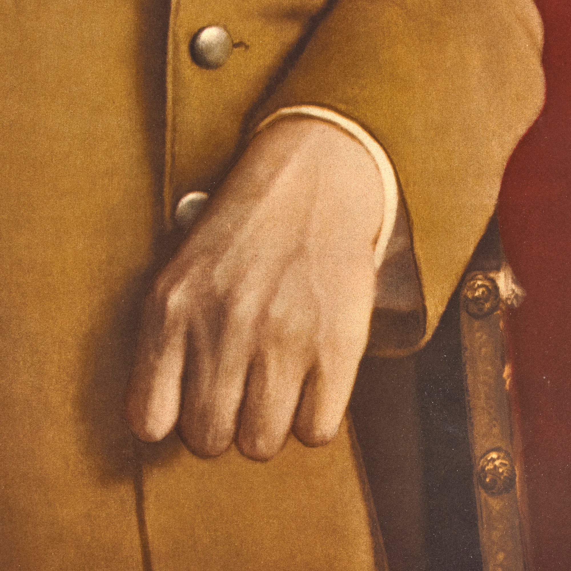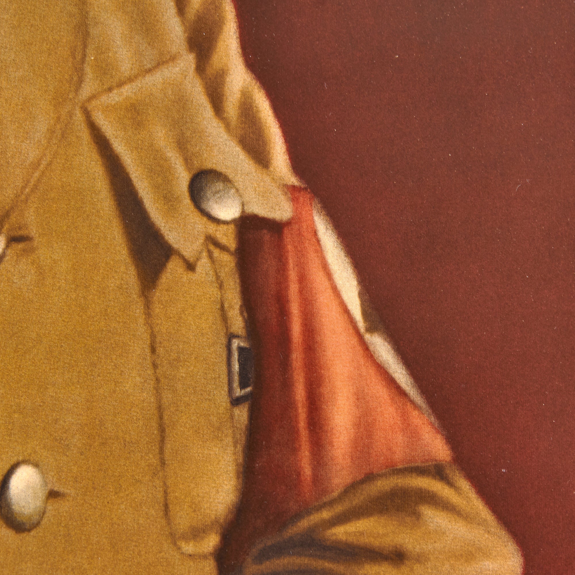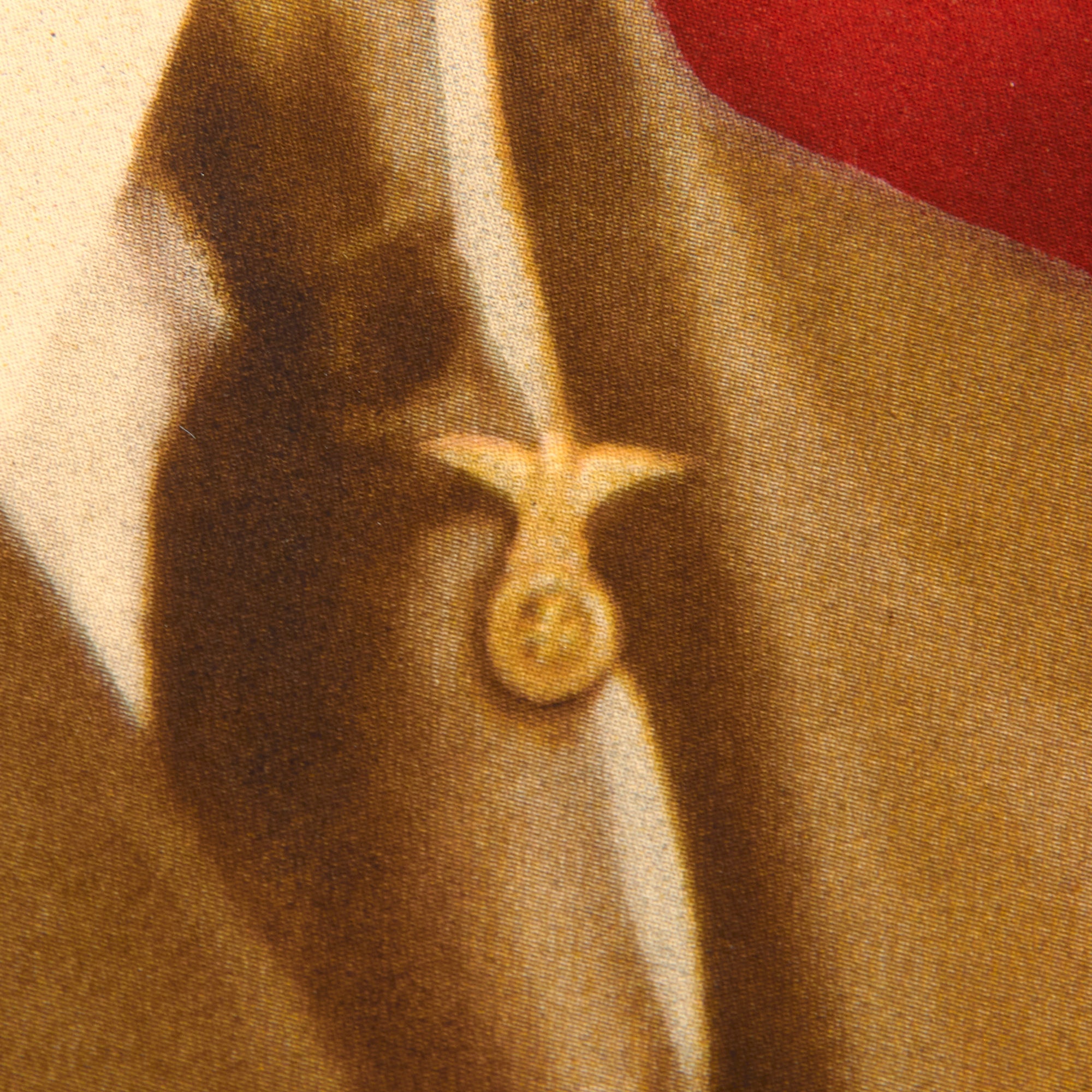 This is the exact same image of der Führer used in the "Ein Volk, ein Reich, ein Führer!" poster, so it is possible that this was originally one of those posters, and then cut down to fit a frame. This could explain why there is no border around the printing at all, though it is just as likely that it is simply a print of the same portrait. The poster is in very good condition, showing some age toning and minor water stains, but no major damage, and the colors are well retained. There is some light wrinkling in the surface from being rolled up, but overall it is in lovely condition considering the age.