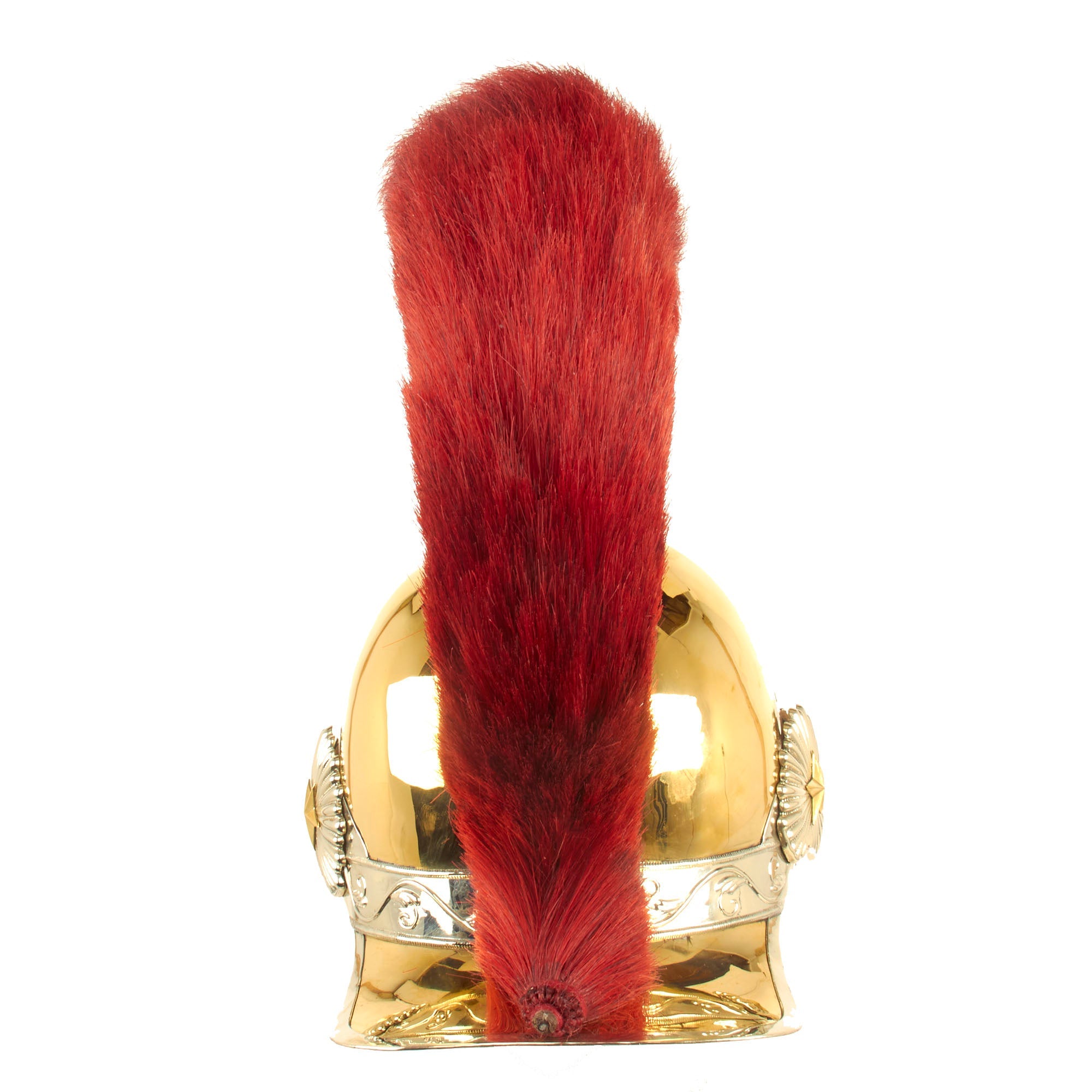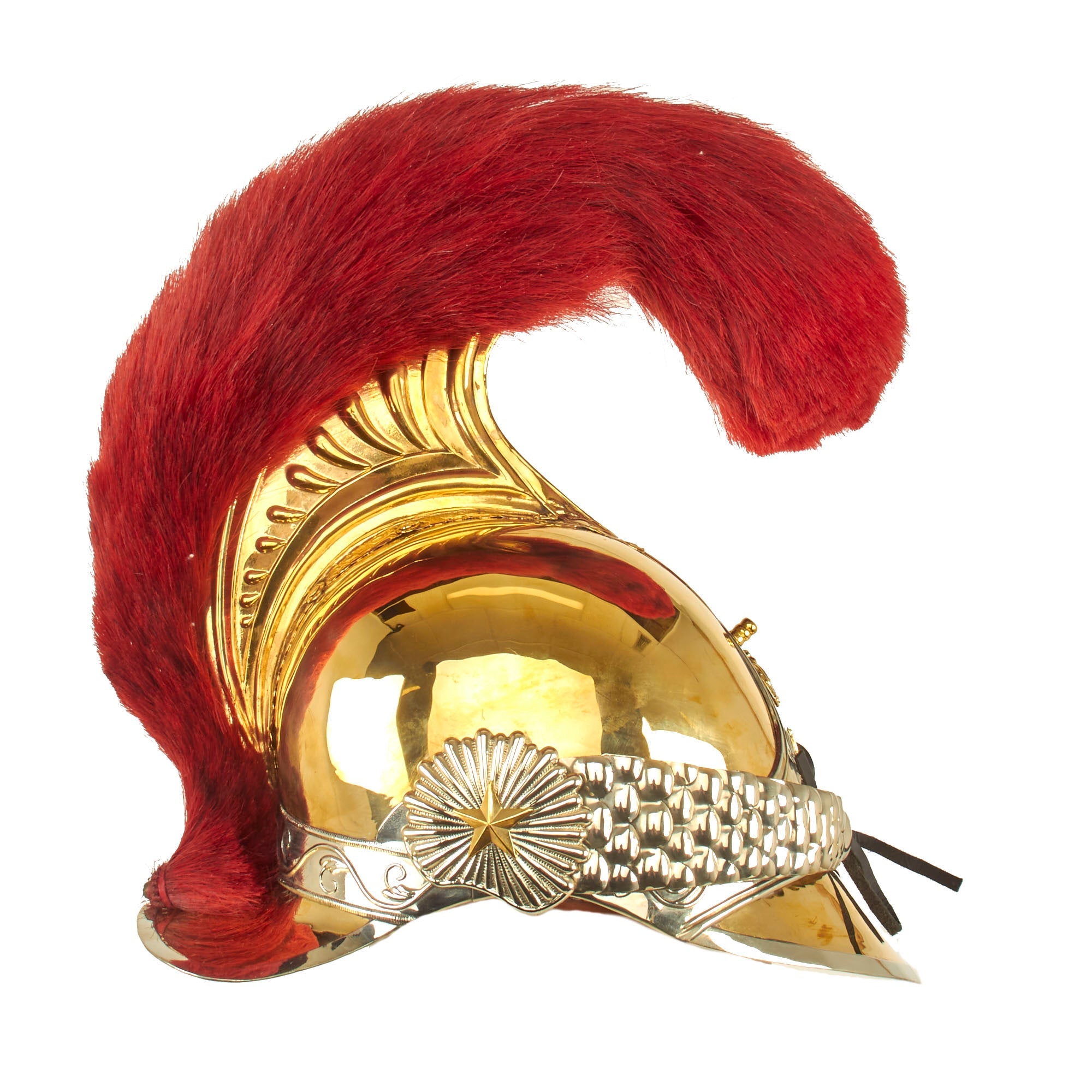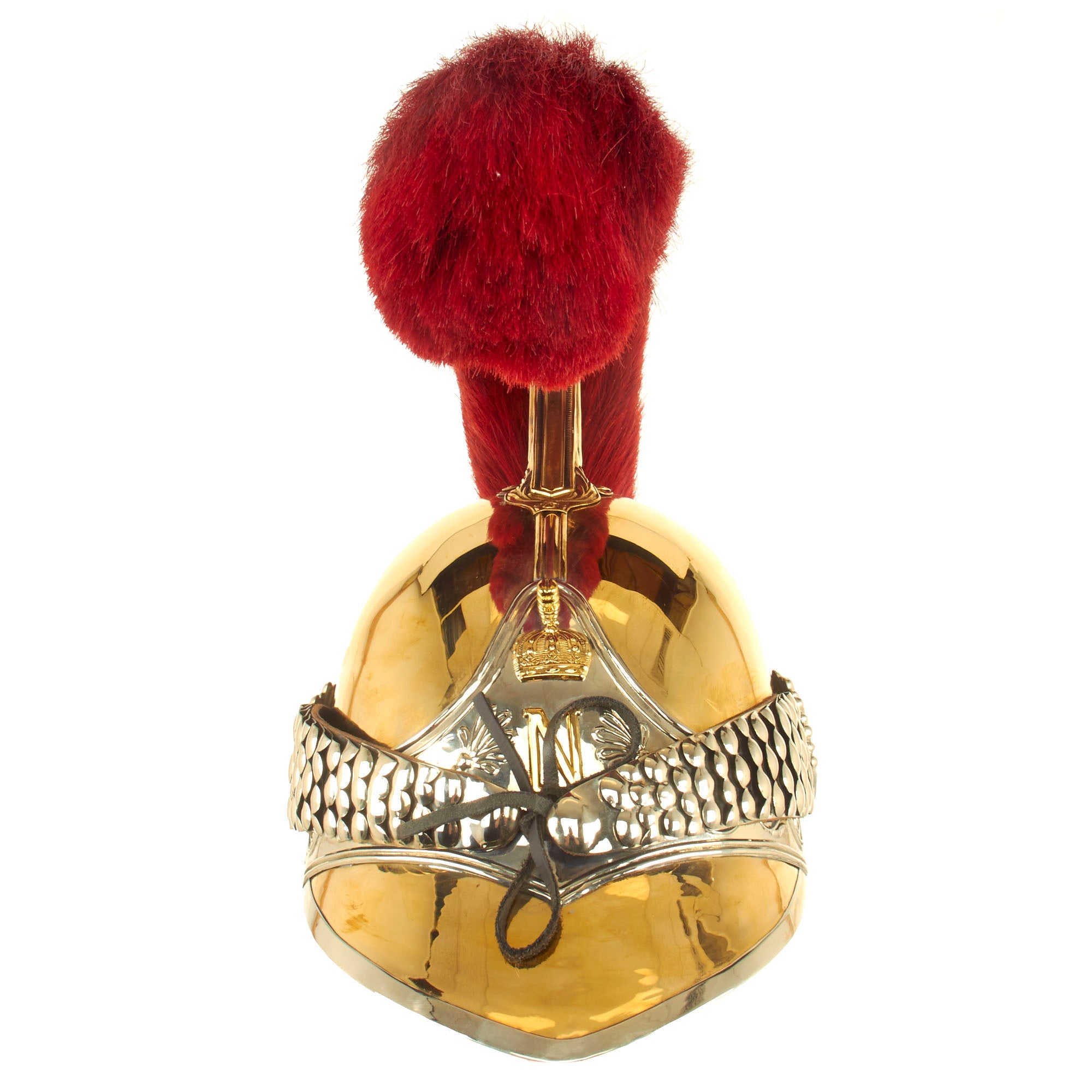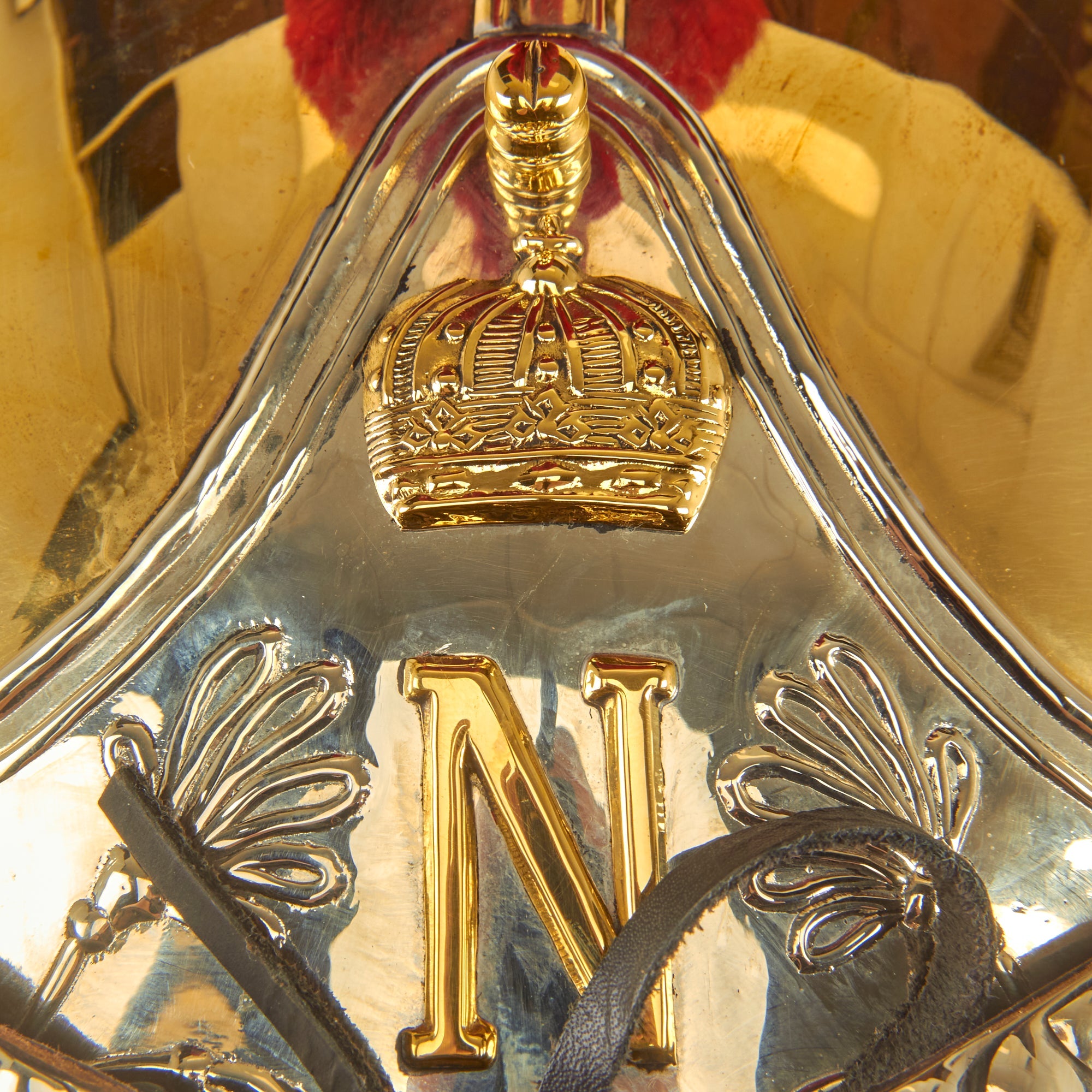 The helmet is “Greek-style”, and offered in a wearable head size of up to approximately 7 1/2. The domed part (or “bombe” in French) of the helmet is made from brass, ending in a nape cover (“couvre-nuque” in French). The crest (“cimier” in French) is made of brass stamped with palmettes, the whole topped with a scarlet horsehair plume. The front part of the helmet is decorated with a triangular silvered metal plate bearing an imperial crowned letter “N”, and on either side of this there is an embossed palm decoration. The front has full leather backed brass chin scales attached, held in place by starbursts.