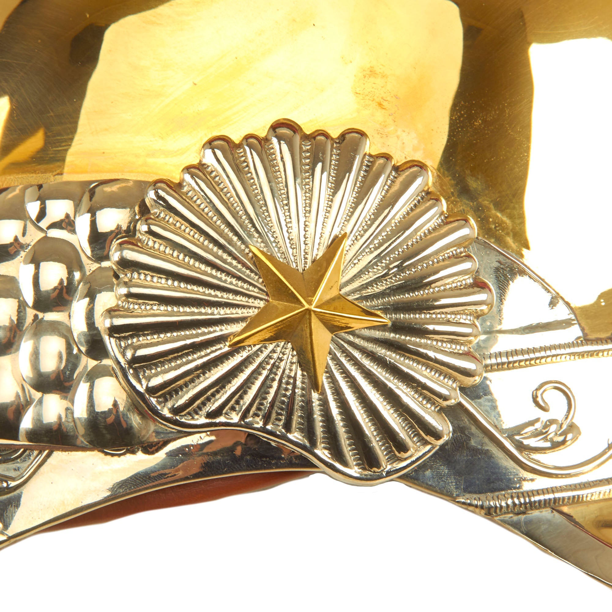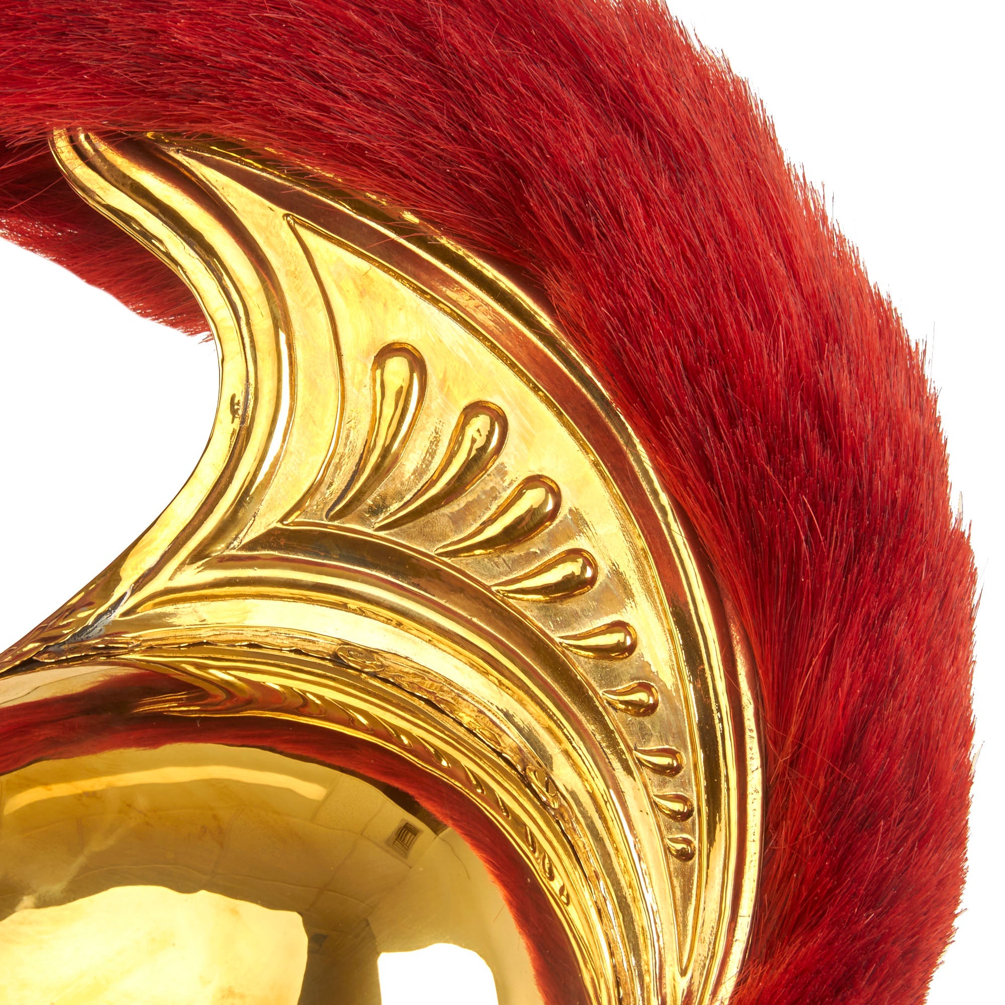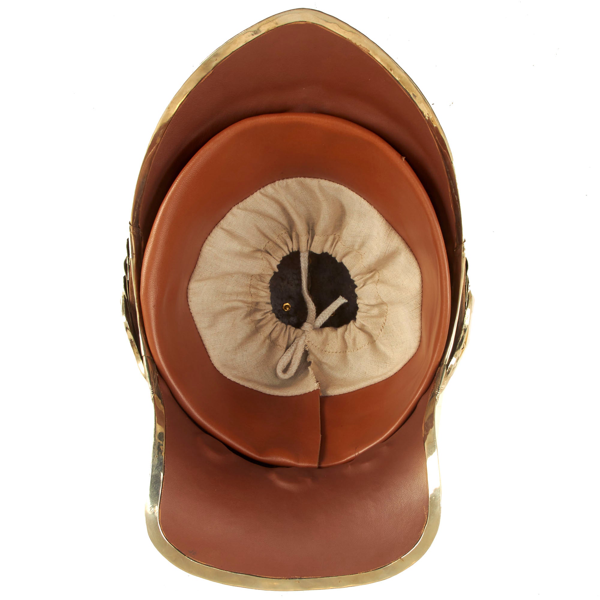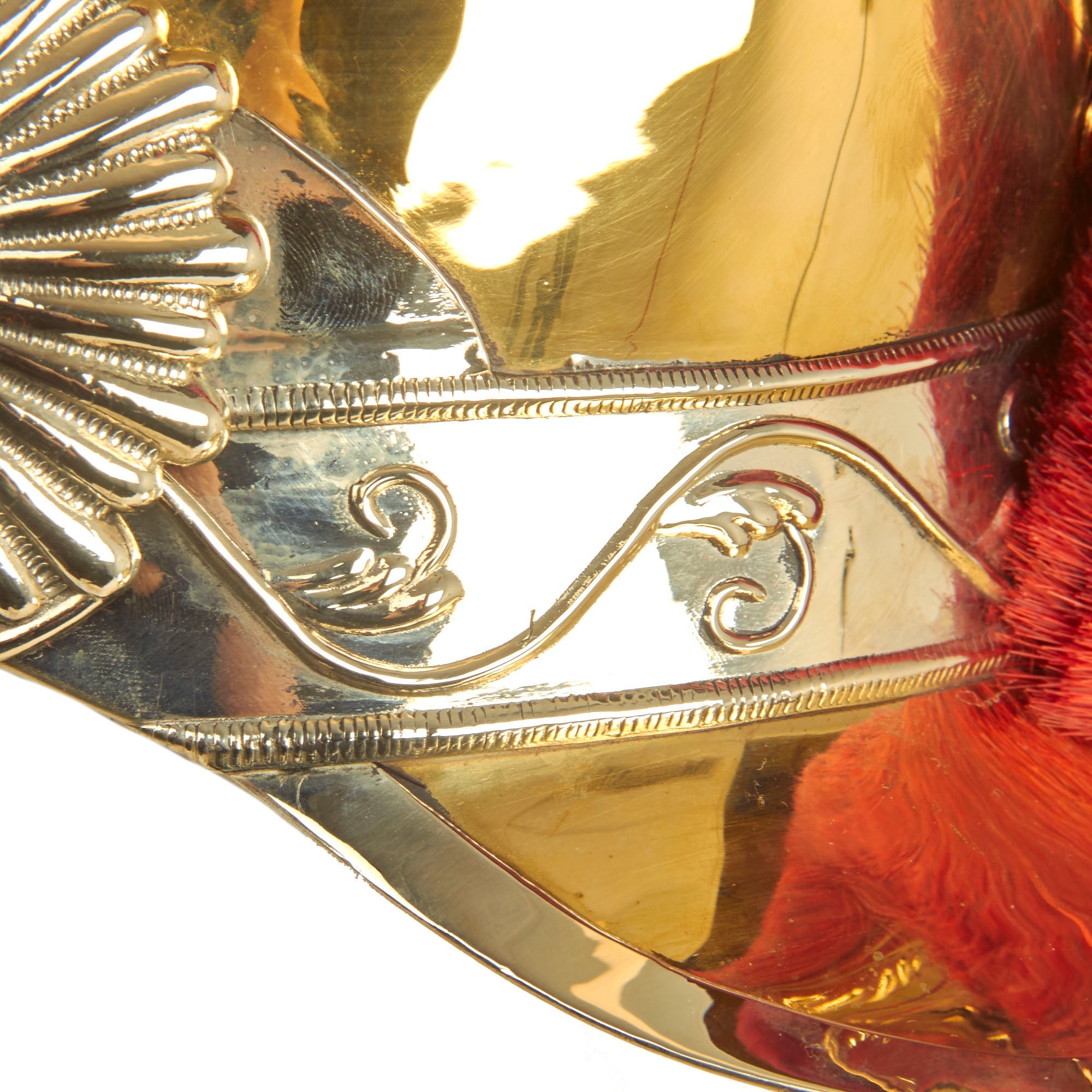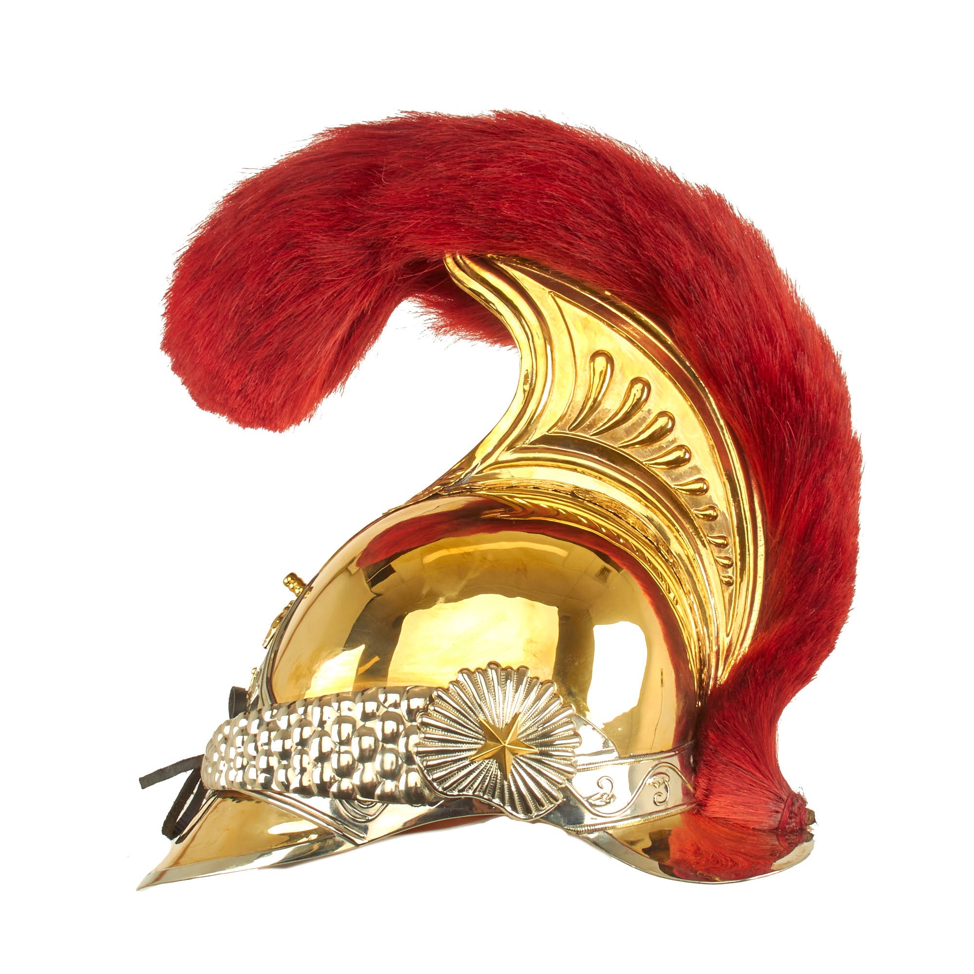 The helmet is “Greek-style”, and offered in a wearable head size of up to approximately 7 1/2. The domed part (or “bombe” in French) of the helmet is made from brass, ending in a nape cover (“couvre-nuque” in French). The crest (“cimier” in French) is made of brass stamped with palmettes, the whole topped with a scarlet horsehair plume. The front part of the helmet is decorated with a triangular silvered metal plate bearing an imperial crowned letter “N”, and on either side of this there is an embossed palm decoration. The front has full leather backed brass chin scales attached, held in place by starbursts.