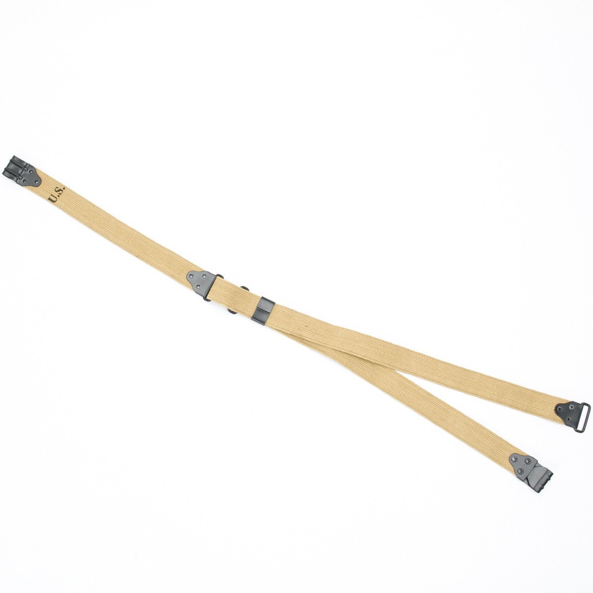 New Made Item: This is an outstanding reproduction of a very scarce U.S. issue Thompson Sub Machine gun sling. Constructed of tan colored webbing with steel clip mountings and bearing replicated "U.S." stamp for added authenticity.