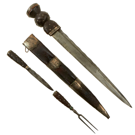 Original British Late 18th Century Scottish Dirk with Intricate Silver-Mounted Wooden Grip & Scabbard with Matching Fork & Knife by Young