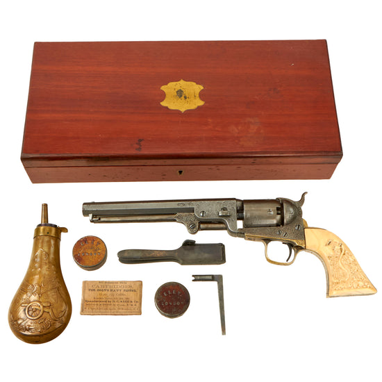 Original U.S. Gustave Young Factory Engraved Colt Model 1851 Navy .36cal Percussion Revolver with Mexican Eagle Carved Ivory Grip in Custom Case with Accessories - Serial 96430