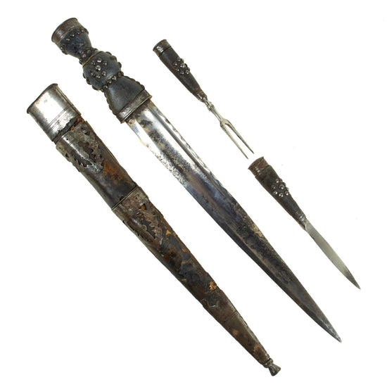 Original British Late 18th Century Scottish Dirk with Intricate Silver-Mounted Wooden Grip & Scabbard with Matching Fork & Knife by Young