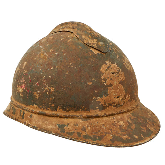 Original French WWI Issue Model 1915 Adrian Helmet Shell with Heavily Worn White Paint with Medic’s Red Crosses & Infantry RF Badge Shadow - Liner & Chinstrap