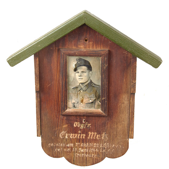 Original German WWII Killed in Action Soldier Memorial Shrine Plaque - Obgfr. Erwin Metz - KIA in Cherbourg June 13th, 1944 - 13 ¼ x 14 ¾”