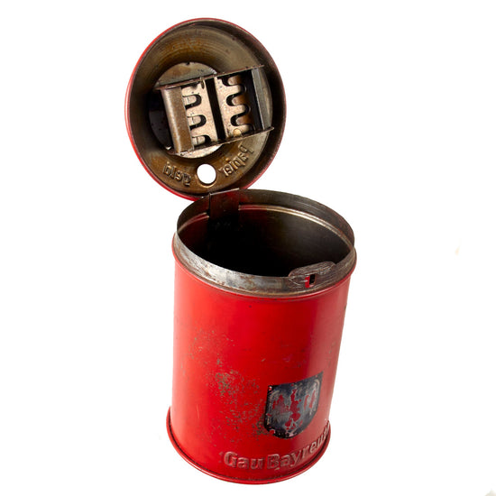 Original German WWII WHW Gau Bayreuth Donation Can by Westermann & Co Neheim-Ruhr with Helmet Decal - Dated 1943