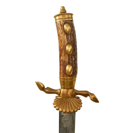 Original German WWI Era Hirschfänger Stag Handle Triple Etched Hunting Short Sword by Clemen & Jung with Triple-Etched Skinning Knife in Scabbard