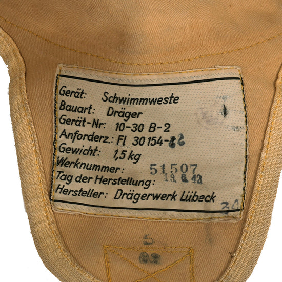 Original Rare German WWII Personalized 1942 Dated Luftwaffe Life Vest Type 10-30 B-2 by Drägerwerk Lübeck