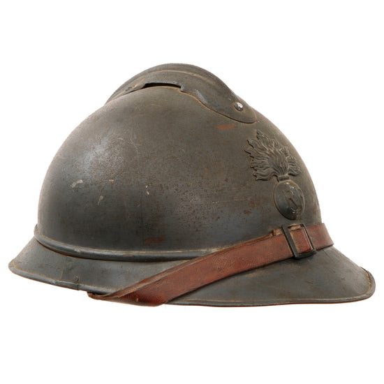 Original French WWI Issue Model 1915 Infantry Adrian Helmet in Horizon Blue with Chinstrap Stretched Over Brim - No Liner