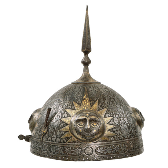 Original Magnificent North Indian Gold Inlaid Kulah Khud Spiked Sun Face War Helmet with Museum Catalog Tag - Circa 1800