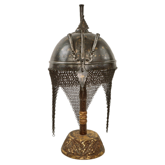 Original Magnificent Gold Inlaid & Etched Kulah Khud War Helmet with Chainmail Neck Covering and Lovely Carved Wooden Stand - Late 18th Century