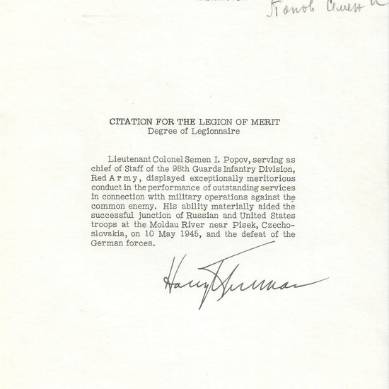Original U.S. WWII Legion of Merit Awarded to Soviet Lieutenant Colonel Semen I. Popov with Citation Signed by President Truman