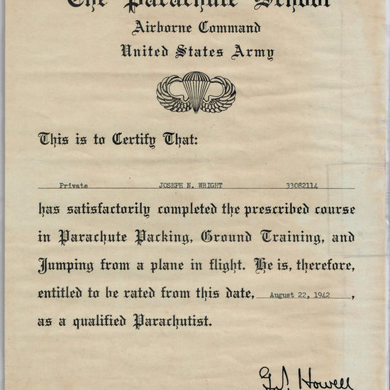 Original U.S. WWII 505th Parachute Infantry Regiment Named Parachute School Certificate with Copy of Photo - Joseph N. Wright