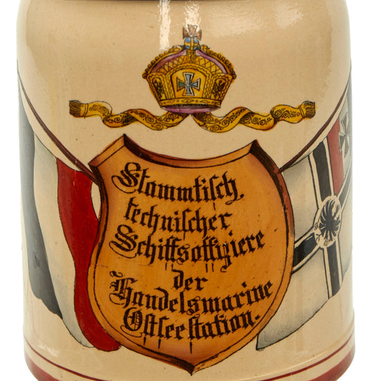 Original Imperial German Pre-WWI Kaiserliche Marine Merchant Marine Navy Lidded Stein with Nine Sailor Names Inscribed Under Lid