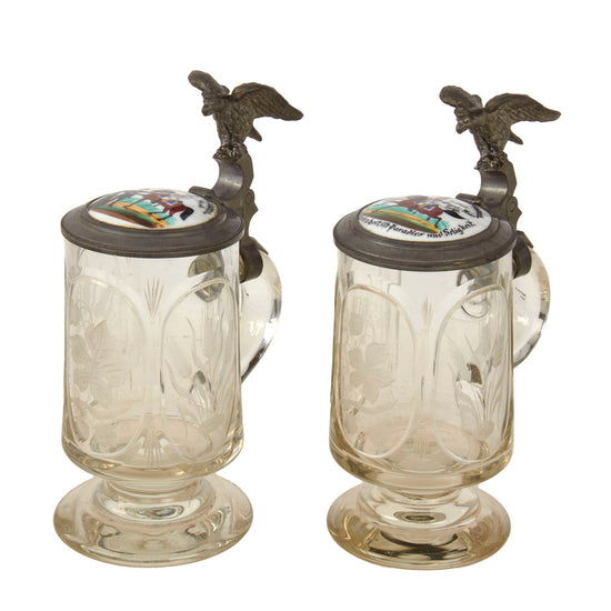 Original Imperial German Pre-WWI Rare Garde Kürassier Regiment Pair of Glass Lidded Beer Steins with Tremendous Painted Lids - Wilhelm Frodermann - Dated 1897