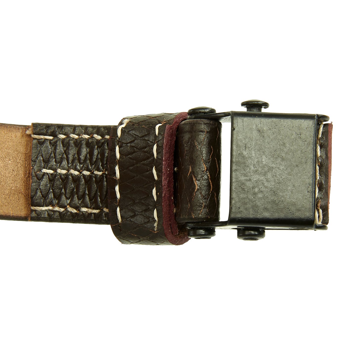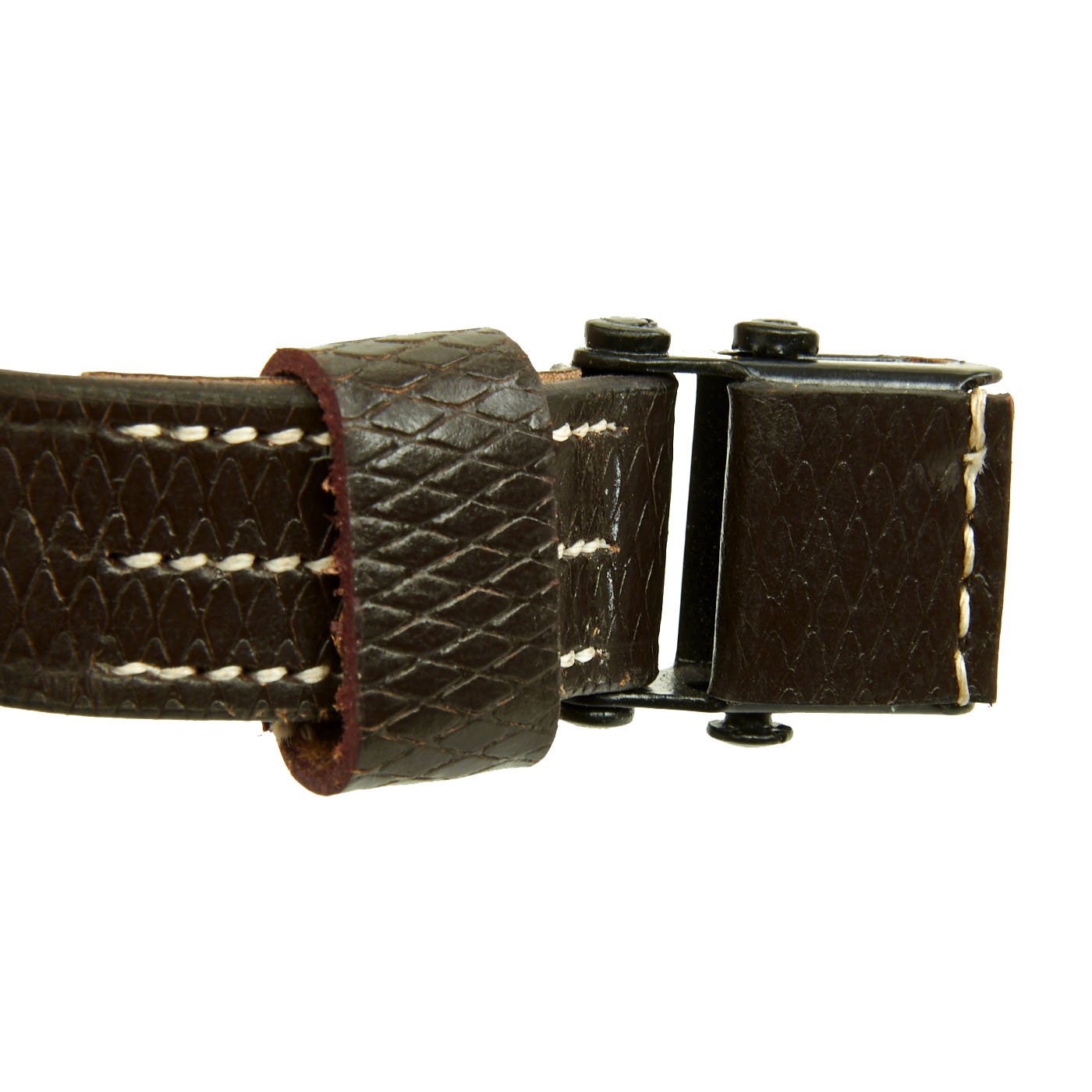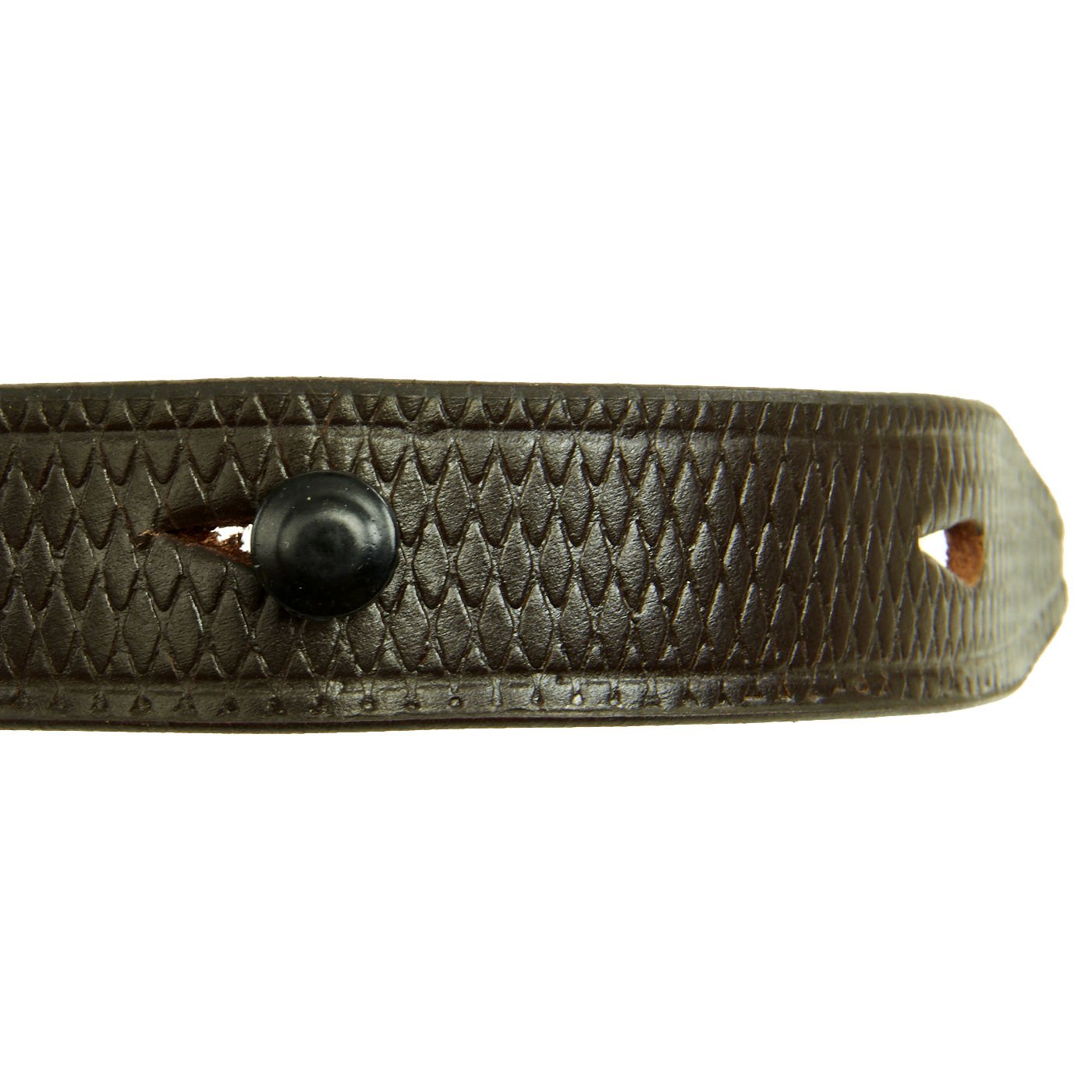 • New Made Item: Always hard to find, we now have manufactured correct two hole MP40 sling complete with cross-hatching in early war brown leather. Comes with proper steel slide buckle, collar stud steel button and single leather keeper. Stamped with replicated maker and date markings.