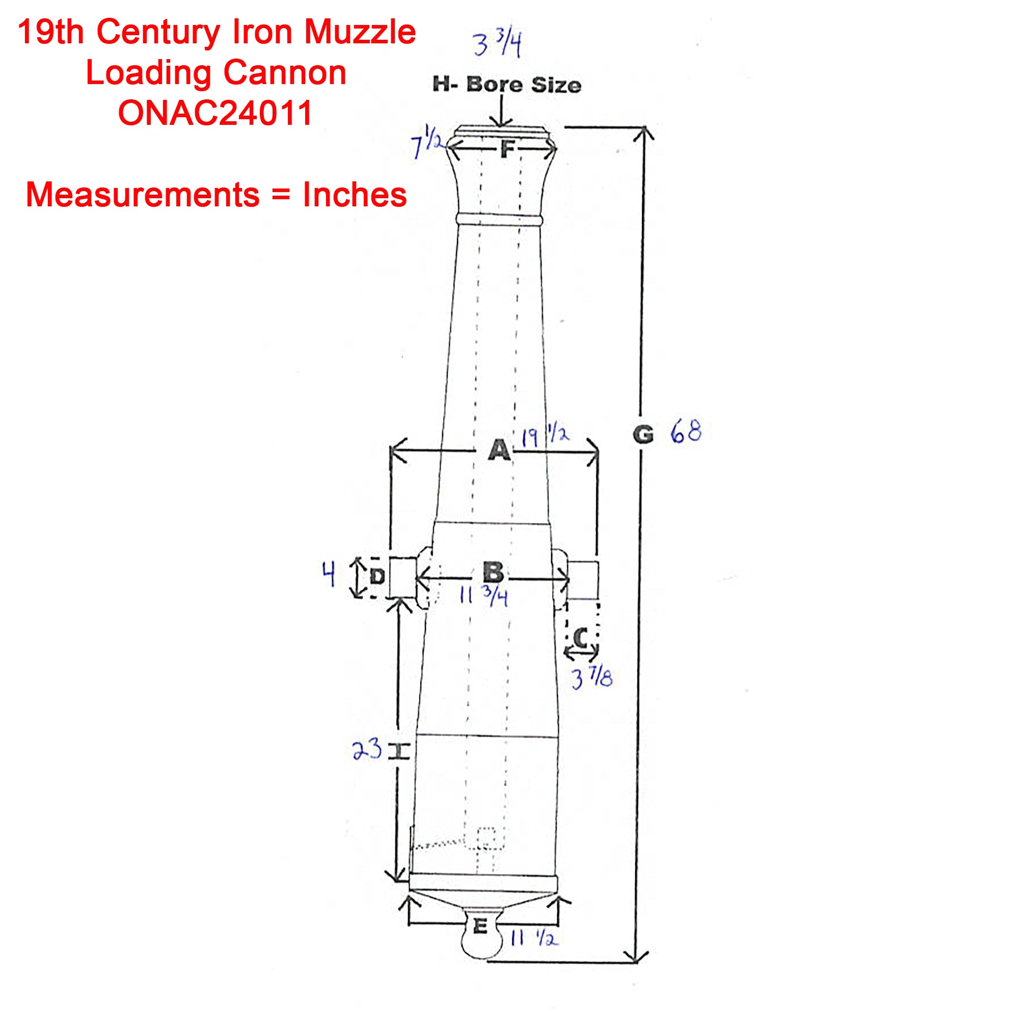 The tube measures 68" in overall length and has a 3.75" bore denoting it as a 6 pounder. Overall weight is 1500 LBS. Please see images for detailed measurements. The touch hole is clear (not spiked) as is the entire length of the tube.