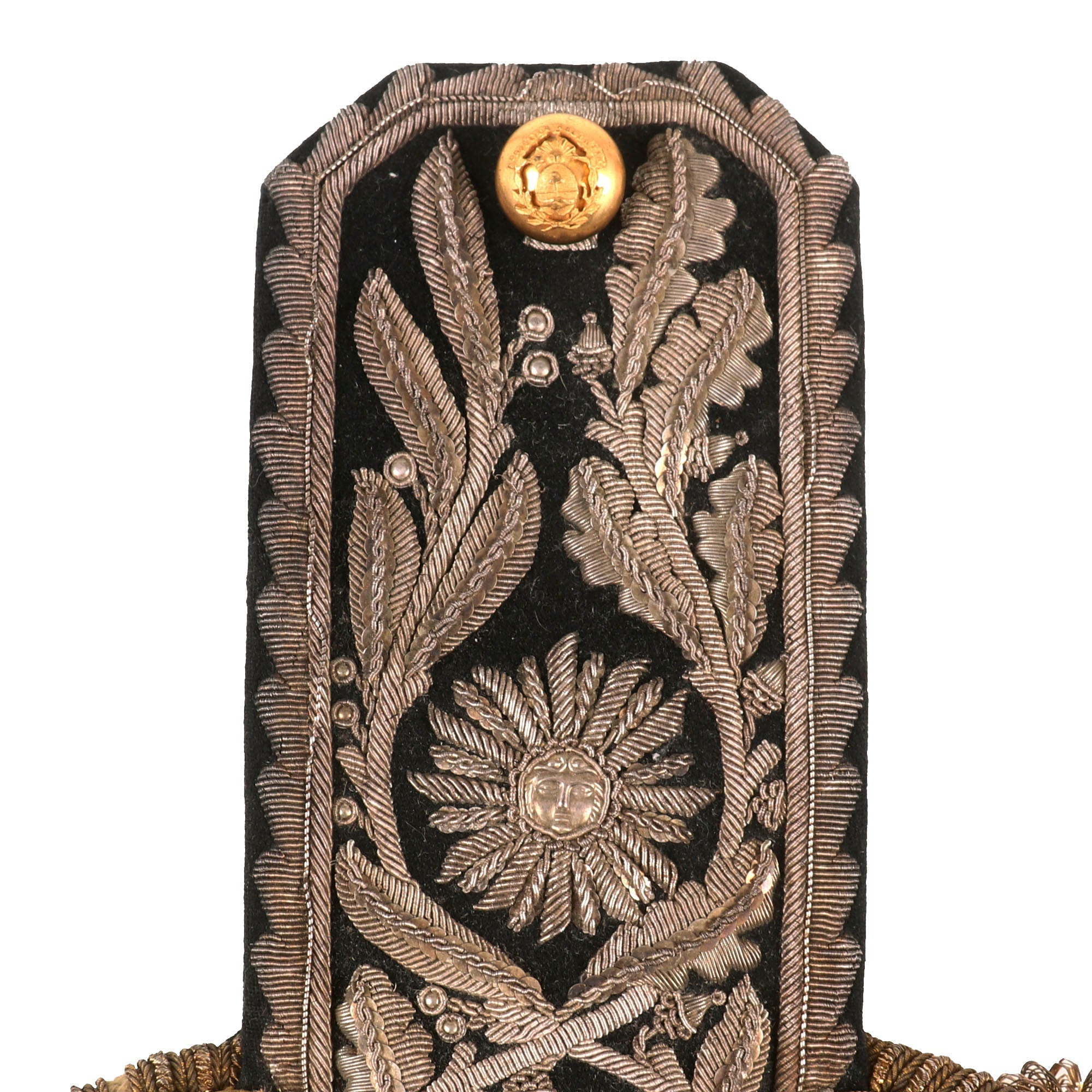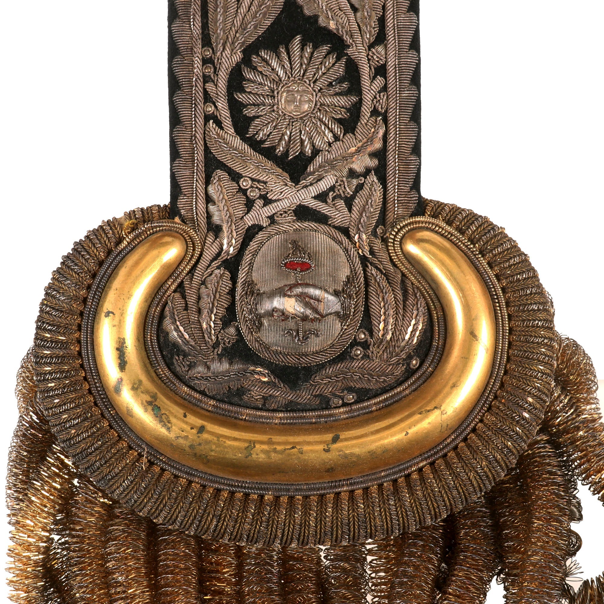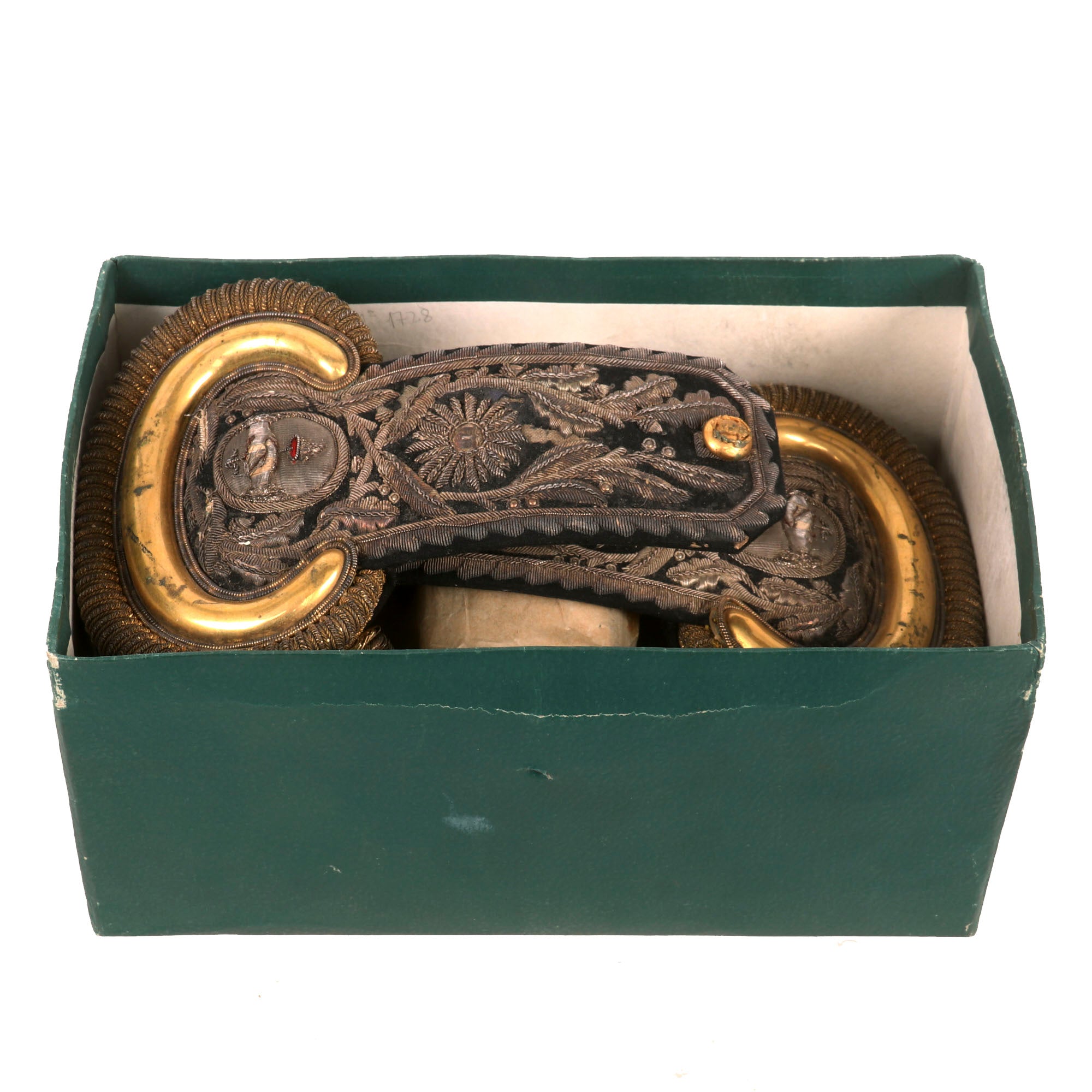 This is a tremendously scarce set of Argentinian General’s shoulder boards in their original box. The face of the boards show glorious bullion motifs fronted by the national emblem of Argentina, the Sun of May (Sol de Mayo), and below the sun is a pair of shaking hands symbolizing unity over the red Phrygian cap symbolizing the pursuit of liberty. These are surrounded by lovely bullion vinery, topped with an Argentinian button. The post to which the buttons are attached read MARQUE DE FABRIQUE, which indicate that the boards are French-imported, very common for South American countries during this period.