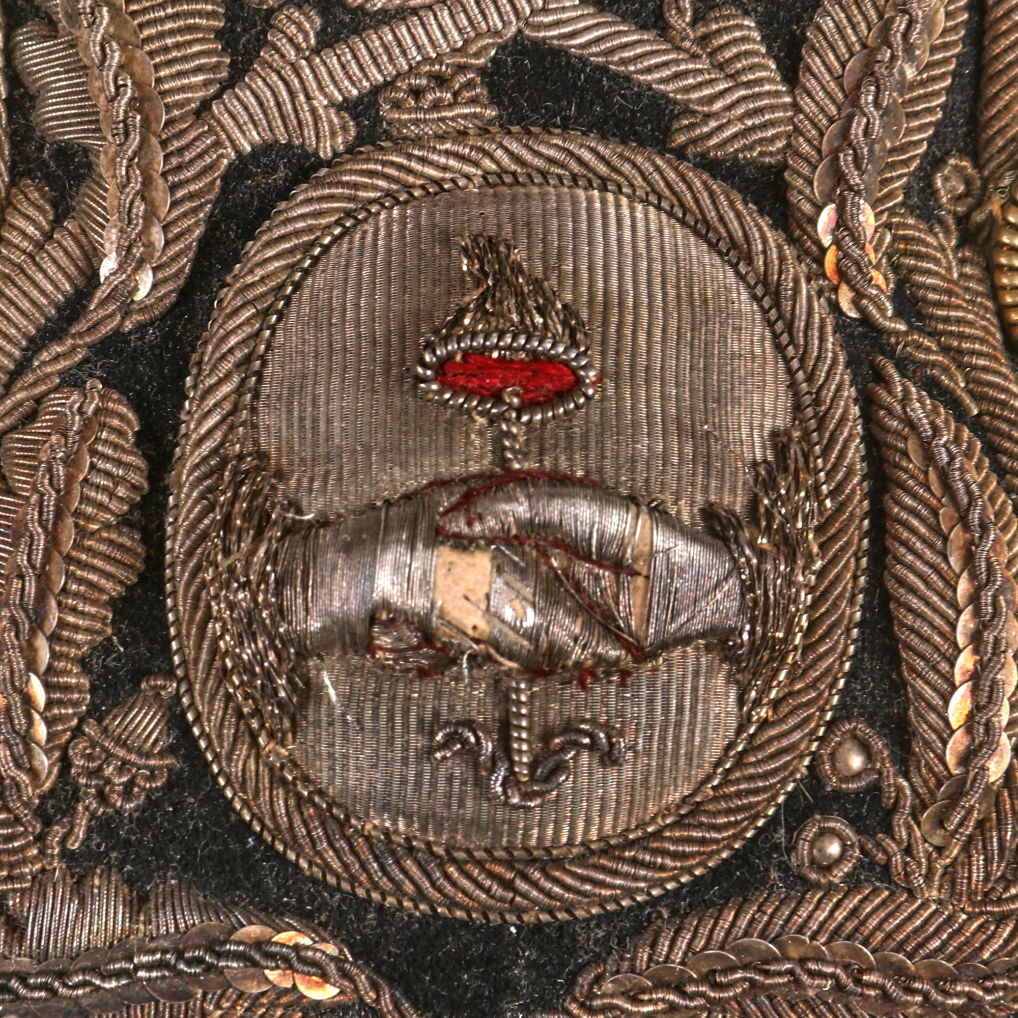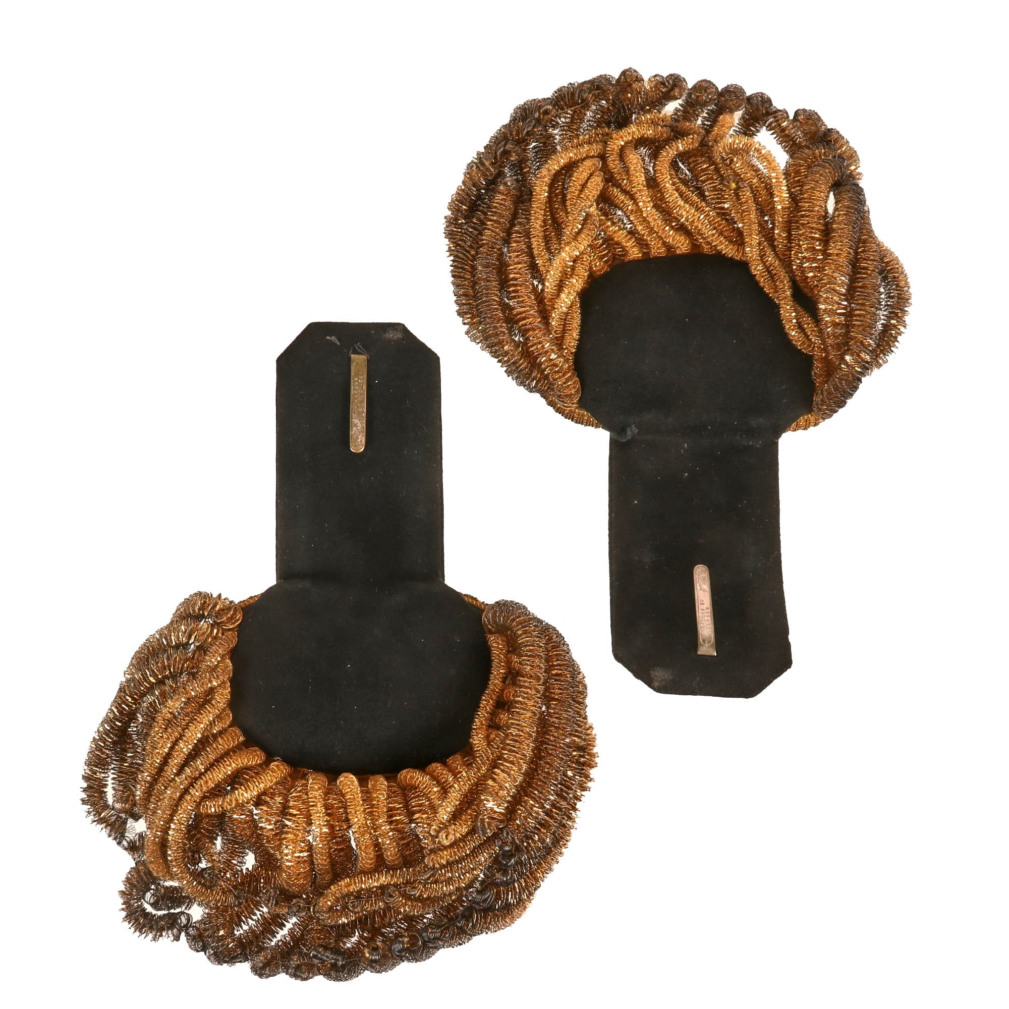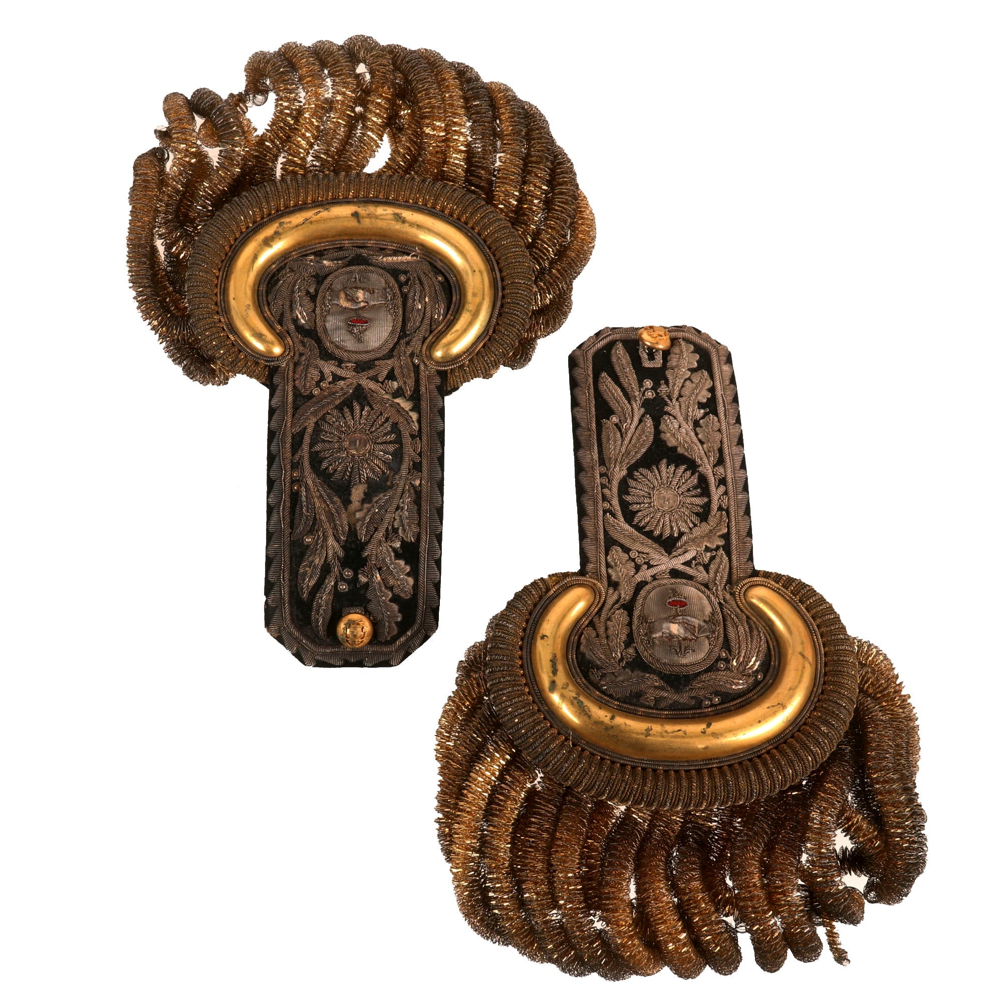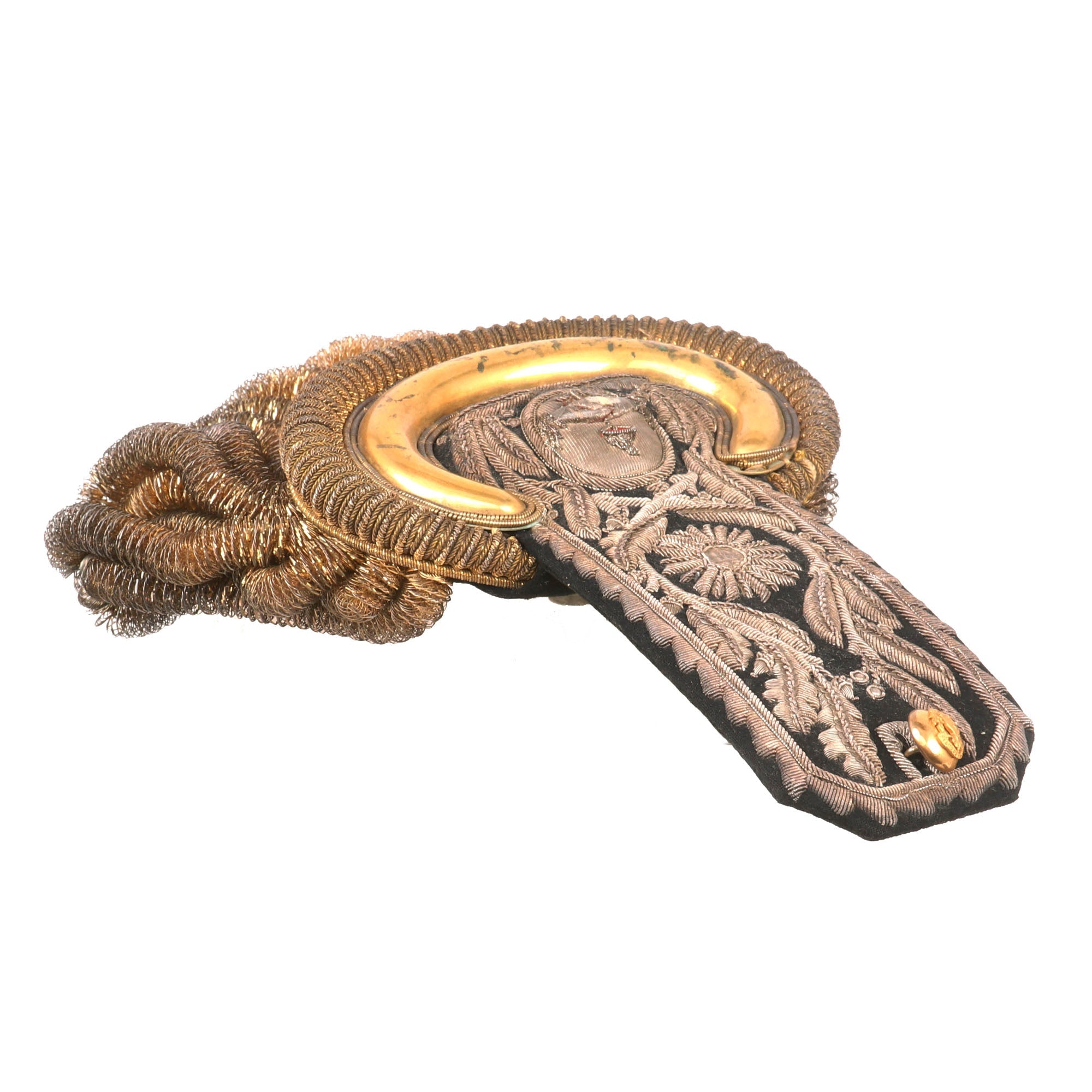 This is a tremendously scarce set of Argentinian General’s shoulder boards in their original box. The face of the boards show glorious bullion motifs fronted by the national emblem of Argentina, the Sun of May (Sol de Mayo), and below the sun is a pair of shaking hands symbolizing unity over the red Phrygian cap symbolizing the pursuit of liberty. These are surrounded by lovely bullion vinery, topped with an Argentinian button. The post to which the buttons are attached read MARQUE DE FABRIQUE, which indicate that the boards are French-imported, very common for South American countries during this period.